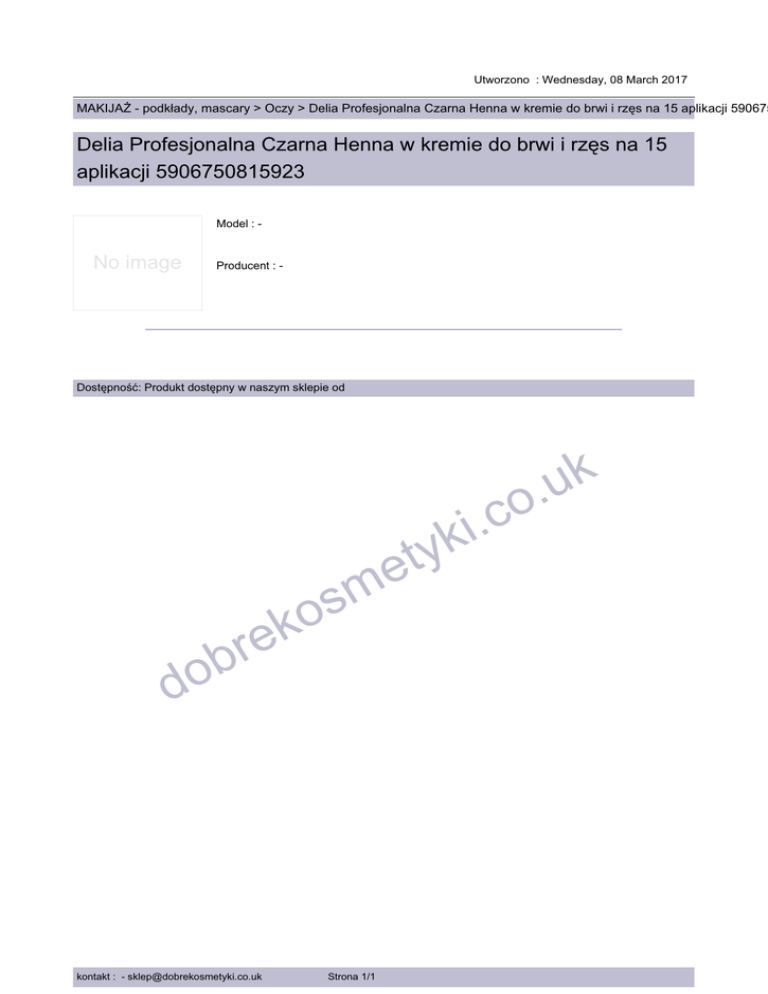 Utworzono : Wednesday, 08 March 2017 MAKIJAŻ - podkłady, mascary > Oczy > Delia Profesjonalna Czarna Henna w kremie do brwi i rzęs na 15 aplikacji 590675 Delia Profesjonalna Czarna Henna w kremie do brwi i rzęs na 15 aplikacji 5906750815923 Model : - No image Producent : - Dostępność: Produkt dostępny w naszym sklepie od y t e k u . o c . i k m s o k e br do kontakt : - [email protected] Strona 1/1
