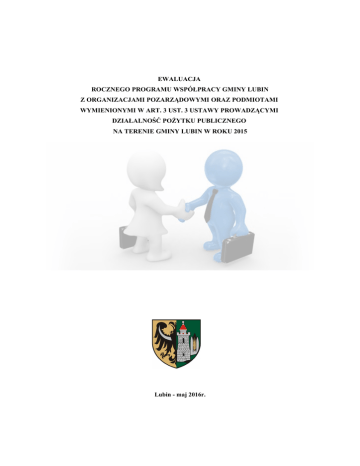 EWALUACJA ROCZNEGO PROGRAMU WSPÓŁPRACY GMINY LUBIN Z ORGANIZACJAMI POZARZĄDOWYMI ORAZ PODMIOTAMI WYMIENIONYMI W ART. 3 UST. 3 USTAWY PROWADZĄCYMI DZIAŁALNOŚĆ POŻYTKU PUBLICZNEGO NA TERENIE GMINY LUBIN W ROKU 2015 Lubin - maj 2016r. GMINA LUBIN Spis treści Wprowadzenie................................................................................................................................................3 Sposób realizacji programu...........................................................................................................................4 Zlecanie realizacji zadań Gminy Lubin organizacjom pozarządowym, w tym tryb konkursowy określony odrębną uchwałą Rady Gminy Lubin – zadania w zakresie rozwoju współzawodnictwa sportowego..............................................................................................................................................4 Zlecanie organizacjom pozarządowym realizacji zadania publicznego – na wniosek tej organizacji - z pominięciem otwartego konkursu ofert w oparciu o art. 19 a ustawy...............................................8 Wspieranie organizacji pozarządowych starających się o środki z innych źródeł niż budżet Gminy Lubin polegające na informowaniu ich o potencjalnych źródłach finansowania oraz udzielanie im rekomendacji......................................................................................................................................8 Użyczanie bądź udostępnianie na preferencyjnych warunkach pomieszczeń lub sprzętu w celu realizacji zadań – na wniosek tej organizacji.........................................................................................9 Umieszczanie na stronie internetowej Gminy Lubin oraz jednostek organizacyjnych – na wniosek organizacji informacji dotyczących prowadzonej przez te organizacje działalności...........................10 Promowanie przez Gminę Lubin działalności organizacji pozarządowych poprzez udostępnienie im strony internetowej oraz prezentację ich działalności podczas gminnych imprez kulturalnych / Współorganizacja przedsięwzięć na wniosek organizacji pozarządowych przy uwzględnieniu możliwości finansowych / organizacyjnych Gminy Lubin.....................................................................11 Pozostałe formy współpracy w oparciu o założenia Programu...................................................................12 Sposób oceny realizacji programu...............................................................................................................17 Podsumowanie.............................................................................................................................................20 GMINA LUBIN Wprowadzenie Zgodnie z zapisami art. 5a ust. 3 ustawy z dnia 24 kwietnia 2003r. o działalności pożytku publicznego i o wolontariacie (tj. Dz. U. z 2016r. Poz. 239 ze zm.) Wójt Gminy Lubin w terminie do 31 maja, każdego roku zobowiązany jest przedłożyć Radzie Gminy Lubin oraz opublikować w Biuletynie Informacji Publicznej sprawozdanie z realizacji programu współpracy z organizacjami pozarządowymi oraz podmiotami prowadzącymi działalność pożytku publicznego za rok poprzedni. Celem przedmiotowej ewaluacji jest sprawozdanie z wykonania Programu współpracy Gminy Lubin z organizacjami pozarządowymi oraz podmiotami wymienionymi w art. 3 ust. 3 ustawy prowadzącymi działalność pożytku publicznego na terenie Gminy Lubin w 2015 roku oraz ocena wpływu Programu na wzmocnienie organizacji pozarządowych i partnerstwa z Gminą Lubin. Projekt Programu współpracy został poddany konsultacjom na podstawie uchwały nr LI/256/2010 Rady Gminy Lubin z dnia 13 lipca 2010r. w sprawie szczegółowego sposobu konsultowania z radami działalności pożytku publicznego lub organizacjami pozarządowymi i podmiotami wymienionymi w art. 3 ust. 3 ustawy z dnia 24 kwietnia 2003r. o działalności pożytku publicznego i o wolontariacie projektów aktów prawa miejscowego w dziedzinach dotyczących działalności statutowej tych organizacji. Konsultacje do Programu na 2015r. ogłoszone zostały w dniu 24.10.2014r. i trwały do 07.11.2014r. Organizacje pozarządowe zostały poinformowane o możliwości przedkładania zmian do projektu Programu mającego obowiązywać w 2015r. według załączonego do informacji formularza. W/w informacja ukazała się na stronie BIP Urzędu Gminy Lubin, na stronie internetowej Gminy Lubin oraz bezpośrednio w Urzędzie na tablicy ogłoszeń. Z przebiegu konsultacji przygotowana została informacja, która ukazała się w Biuletynie Informacji Publicznej oraz na stronie internetowej Urzędu Gminy Lubin. Do projektu Programu nie zgłoszono uwag – informacja z dnia 12.11.2014r. Program został przyjęty przez Radę Gminy Lubin uchwałą nr LX/468/2014 Rady Gminy Lubin z dnia 13 listopada 2014r. GMINA LUBIN Sposób realizacji programu Zlecanie realizacji zadań Gminy Lubin organizacjom pozarządowym, w tym tryb konkursowy określony odrębną uchwałą Rady Gminy Lubin – zadania w zakresie rozwoju współzawodnictwa sportowego W 2015 roku w oparciu o ustawę o działalności pożytku publicznego i o wolontariacie (tj. Dz. U. z 2016r. Poz. 239 ze zm.) – zwanej w dalszej części opracowania ustawą, Wójt Gminy Lubin ogłosił cztery otwarte konkursy ofert: • dwa na wsparcie realizacji zadania publicznego w zakresie upowszechniania kultury fizycznej; • jeden na wsparcie realizacji zadania publicznego w zakresie upowszechniania aktywności osób starszych z terenu Gminy Lubin; • jeden na wsparcie realizacji zadania publicznego w zakresie podtrzymywania tradycji narodowej, pielęgnowania polskości, rozwoju świadomości narodowej, obywatelskiej i kulturowej oraz upowszechniania kultury. Adresatami konkursu były organizacje pozarządowe oraz podmioty wymienione w art. 3 ust. 3 ustawy o działalności pożytku publicznego i 