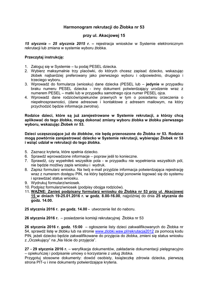 Harmonogram rekrutacji do Żłobka nr 53 przy ul. Akacjowej 15 15 stycznia – 25 stycznia 2015 r. – rejestracja wniosków w Systemie elektronicznym rekrutacji lub zmiana w systemie wyboru żłobka. Przeczytaj instrukcję: 1. Zaloguj się w Systemie – tu podaj PESEL dziecka. 2. Wybierz maksymalnie trzy placówki, do których chcesz zapisać dziecko, wskazując żłobek najbardziej preferowany jako pierwszego wyboru i odpowiednio, drugiego i trzeciego wyboru. 3. Wprowadź do formularza (wniosku) dane dziecka (PESEL lub – jedynie w przypadku braku numeru PESEL dziecka - inny dokument potwierdzający urodzenie wraz z numerem PESEL – matki lub w przypadku samotnego ojca numer PESEL ojca. 4. Wprowadź dane rodziców/opiekunów prawnych w tym o posiadaniu orzeczenia o niepełnosprawności, (dane adresowe i kontaktowe z adresem mailowym, na który przychodzić będzie informacja zwrotna). Rodzice dzieci, które są już zarejestrowane w Systemie rekrutacji, a którzy chcą aplikować do tego żłobka, mogą dokonać zmiany wyboru żłobka w żłobku pierwszego wyboru, wskazując Żłobek nr 53. Dzieci uczęszczające już do żłobków, nie będą przenoszone do Żłobka nr 53. Rodzice mogą powtórnie zarejestrować dziecko w Systemie rekrutacji, wybierając Żłobek nr 53 i wziąć udział w rekrutacji do tego żłobka. 5. Zaznacz kryteria, które spełnia dziecko. 6. Sprawdź wprowadzone informacje – popraw jeśli to konieczne. 7. Sprawdź, czy wypełniłeś wszystkie pola - w przypadku nie wypełnienia wszystkich pól, nie będzie możliwy zapis wniosku i wydruk. 8. Zapisz formularz wniosku. Na twój e-mail przyjdzie informacja potwierdzająca rejestrację wraz z numerem dostępu PIN, na który będziesz mógł ponownie logować się do systemu i sprawdzać status wniosku. 9. Wydrukuj formularz/wniosek. 10. Podpisz formularz/wniosek (podpisy obojga rodziców). 11. WAŻNE: Zanieś podpisany formularz wniosku do Żłobka nr 53 przy ul. Akacjowej 15 w dniach 19-25.01.2016 r. w godz. 8.00-16.00, najpóźniej do dnia 25 stycznia do godz. 14.00. 25 stycznia 2016 r. po godz. 14.00 - utworzenie list do naboru. 26 stycznia 2016 r. – posiedzenie komisji rekrutacyjnej Żłobka nr 53 26 stycznia 2016 r. godz. 15:00 – ogłoszenie listy dzieci zakwalifikowanych do Żłobka nr 54, sprawdź listę w żłobku lub na stronie www.zlobki.waw.pl/rekrutacja2012 za pomocą kodu PIN, jeżeli dziecko będzie zakwalifikowane do przyjęcia do żłobka, zmieni się status wniosku z „Oczekujący” na „Na liście do przyjęcia”. 27 - 29 stycznia 2016 r. – weryfikacja dokumentów, zakładanie dokumentacji pielęgnacyjno – opiekuńczej i podpisanie umowy o korzystanie z usług żłobka. Przygotuj stosowne dokumenty: dowód osobisty, książeczkę zdrowia dziecka, pierwszą strona PIT-u i inne dokumenty potwierdzające kryteria. Uwaga! Będziecie Państwo poproszeni przez kierownika Żłobka nr 53 w terminie przez niego ustalonym o przekazanie do wglądu dokumentów potwierdzające spełnianie kryteriów, które zostały określone w formularzu. W przypadku nieprzedłożenia w terminie wskazanym przez Kierownika Żłobka nr 53 dokumentów potwierdzających spełnianie określonego kryterium, przyjmuje się, że odpowiednio rodzice lub dziecko, którego wniosek dotyczy, danego kryterium nie spełniają. 1 lutego 2016 r. godz. 11:00 – ogłoszenie listy dzieci przyjętych do żłobka nr 53 przy ul. Akacjowej 15. Uwaga! Jeśli chcecie Państwo skorzystać z ulgi całkowitej lub częściowej od ponoszenia opłat za pobyt dziecka w żłobku, trzeba dostarczyć do Żłobka nr 53 w dniu podpisania umowy zaświadczenie z Urzędu Skarbowego o wysokości dochodów uzyskanych przez członków gospodarstwa domowego (rozumie się przez to osoby spokrewnione i niespokrewnione, pozostające w faktycznym związku, wspólnie zamieszkujące i gospodarujące) za ubiegły rok kalendarzowy lub o braku dochodów oraz oświadczenia o wysokości średniego miesięcznego dochodu na jedna osobę w gospodarstwie domowym za ubiegły rok kalendarzowy. Zespół Żłobków m.st. Warszawy zastrzega sobie prawo do zmiany Harmonogramu bądź wprowadzenia dodatkowych postanowień.