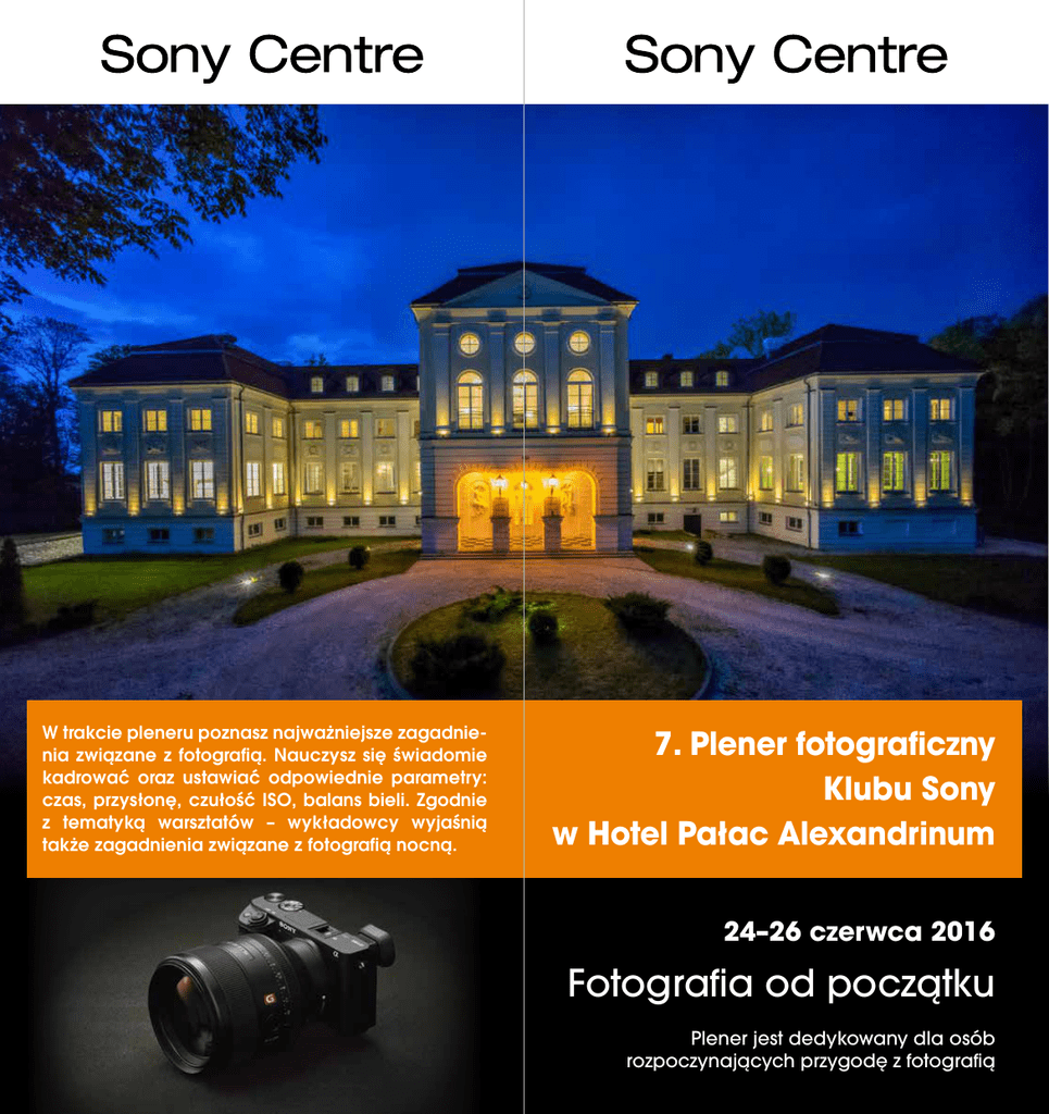 W trakcie pleneru poznasz najważniejsze zagadnienia związane z fotografią. Nauczysz się świadomie kadrować oraz ustawiać odpowiednie parametry: czas, przysłonę, czułość ISO, balans bieli. Zgodnie z tematyką warsztatów – wykładowcy wyjaśnią także zagadnienia związane z fotografią nocną. 7. Plener fotograficzny Klubu Sony w Hotel Pałac Alexandrinum 24–26 czerwca 2016 Fotografia od początku Plener jest dedykowany dla osób rozpoczynających przygodę z fotografią Warsztaty plenerowe Sony są dedykowane dla osób zaczynających przygodę z fotografią. Zostaną poprowadzone przez doświadczonych specjalistów z Sony. W czasie pleneru możliwe będzie wypożyczenie aparatów, obiektywów Sony oraz lamp błyskowych i statywów. Zapewniamy przyjazną, twórczą atmosferę. miejsce: Hotel Pałac Alexandrinum 05-326 Krubki-Górki 13a gm. Poświętne, pow. Wołomin PIĄTEK | 24 czerwca 19:00Oficjalne rozpoczęcie pleneru, omówienie zajęć 20:00Kolacja PROGRAM WARSZTATÓW DWA SZKOLENIA ON-LINE PRZED WYJAZDEM: Plener poprzedzą dwa przygotowawcze szkolenia online. Gorąco zachęcamy do udziału w nich. Są prowadzone w sposób dynamiczny – istnieje możliwość zadawania pytań wykładowcy. Webinarium będzie teoretycznym przygotowaniem do zajęć praktycznych na plenerze. • CZĘŚĆ I | WTOREK | 21 czerwca | godz. 20:00 fotografia cyfrowa wprowadzenie • CZĘŚĆ II | ŚRODA | 22 czerwca | godz. 20:00 najważniejsze zasady fotografii nocnej SOBOTA | 25 czerwca 8:00– 9:30 Śniadanie 9:30–10:00 Zbiórka na Sali i podział na grupy 10:00–12:00 Zajęcia praktyczne cz. 1 12:00–14:00 Zajęcia praktyczne cz. 2 14:00–15:00 Obiad 15:00–17.00 Zajęcia praktyczne 17:00–18:30 Czas wolny, odpoczynek 18:30–20:00 Przegląd prac uczestników, dyskusja 20:00 Kolacja 21:30–23:00 Zdjęcia nocne NIEDZIELA | 26 czerwca Aby wziąć udział w webinariach wystarczy komputer z dostępem do internetu oraz dla wygody słuchawki. Można też wziąć udział używając smartfona lub tabletu z systemem Android. Należy jednak wcześniej zainstalować aplikację ClickMeeting: https://play.google.com/store/apps/details?id=air.com.implix.clickmeetingmobile 9:00–10:00 Śniadanie 10:00–10:30 Podsumowanie zajęć, przypomnienie najważniejszych zagadnień 10:30–11:30 Jak przygotować zdjęcia do publikacji w internecie 11:30–12:30 Przegląd prac uczestników 12:30–13:30 Konsultacje indywidualne, zakończenie pleneru Koszt dla uczestnika Klubu Sony wynosi 550 zł (zaliczka 300 zł), dla pozostałych osób 790 zł (zaliczka 400 zł). Zgłoszenia do: Katarzyna Sajda [email protected] • tel. 691 737 548 Cena zawiera: 1. dwa noclegi (pokoje 2-osobowe), 2. wyżywienie: piątek – kolacja, sobota – śniadanie, obiad, kolacja, niedziela – śniadanie, 3. udział w zajęciach, 4. możliwość korzystania z basenu. Dojazd nie jest wliczony w cenę. Liczba miejsc ograniczona! Decyduje termin zaksięgowania zaliczki. Termin zgłoszeń do 23.06.2016 r. lub wyczerpania miejsc. Każda część trwa około godziny. Płatność: QSTeam Agencja Eventowa s.c. ul. Żytnia 15a/7, 01-014 Warszawa Nr konta w mBank: 57 1140 2017 0000 4002 0797 2831