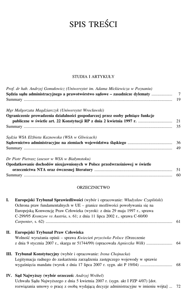 SPIS TREŚCI STUDIA I ARTYKUŁY Prof. dr hab. Andrzej Gomułowicz (Uniwersytet im. Adama Mickiewicza w Poznaniu) Se˛dzia sa˛du administracyjnego a prawotwórstwo sa˛dowe – zasadnicze dylematy .................... 7 Summary ............................................................................................................................................... 19 Mgr Małgorzata Magdziarczyk (Uniwersytet Wrocławski) Ograniczenie prowadzenia działalności gospodarczej przez osoby pełnia˛ce funkcje publiczne w świetle art. 22 Konstytucji RP z dnia 2 kwietnia 1997 r. ................................. 21 Summary ............................................................................................................................................... 35 Se˛dzia WSA Elżbieta Kaznowska (WSA w Gliwicach) Sa˛downictwo administracyjne na ziemiach województwa śla˛skiego ........................................... 36 Summary ............................................................................................................................................... 49 Dr Piotr Pietrasz (asesor w WSA w Białymstoku) Opodatkowanie dochodów nieujawnionych w Polsce przedwrześniowej w świetle orzecznictwa NTA oraz ówczesnej literatury ........................................................................... 51 Summary ............................................................................................................................................... 60 ORZECZNICTWO I. Europejski Trybunał Sprawiedliwości (wybór i opracowanie: Władysław Czapliński) Ochrona praw fundamentalnych w UE – granice możliwości powoływania sie˛ na Europejska˛ Konwencje˛ Praw Człowieka (wyroki: z dnia 29 maja 1997 r., sprawa C-299/95 Kremzow vs Austria, s. 61; z dnia 11 lipca 2002 r., sprawa C-60/00 Carpenter, s. 62) .......................................................................................................................... 61 II. Europejski Trybunał Praw Człowieka Wolność wyrażania opinii – sprawa Kwiecień przeciwko Polsce (Orzeczenie z dnia 9 stycznia 2007 r., skarga nr 51744/99) (opracowała Agnieszka Wilk) ......................... 64 III. Trybunał Konstytucyjny (wybór i opracowanie: Irena Chojnacka) Legitymacja radnego do zaskarżenia zarza˛dzenia zaste˛pczego wojewody w sprawie wygaśnie˛cia mandatu (wyrok z dnia 17 lipca 2007 r. sygn. akt P 19/04) ............................... 68 IV. Sa˛d Najwyższy (wybór orzeczeń: Andrzej Wróbel) Uchwała Sa˛du Najwyższego z dnia 5 kwietnia 2007 r. (sygn. akt I PZP 4/07) [dot. rozwia˛zania umowy o prace˛ z osoba˛ wydaja˛ca˛ decyzje administracyjne w imieniu wójta] ... 72 Zeszyty Naukowe Sa˛downictwa Administracyjnego 4(13)/2007 4 V. Naczelny Sa˛d Administracyjny i wojewódzkie sa˛dy administracyjne A. Orzecznictwo Naczelnego Sa˛du Administracyjnego 1. Uchwała składu siedmiu se˛dziów Naczelnego Sa˛du Administracyjnego z dnia 18 czerwca 2007 r. (sygn. akt II FPS 8/06) [dot. kosztów dyskonta weksli jako kosztów uzyskania przychodów osoby prawnej] ..................................................... 2. Uchwała składu siedmiu se˛dziów Naczelnego Sa˛du Administracyjnego z dnia 25 czerwca 2007 r. (sygn. akt I FPS 4/06) [dot. poste˛powania egzekucyjnego w administracji] ................................................................................................................. B. Orzecznictwo wojewódzkich sa˛dów administracyjnych (wybór i opracowanie: Bogusław Gruszczyński) 1. Postanowienie Wojewódzkiego Sa˛du Administracyjnego w Warszawie z dnia 28 lipca 2006 r. (sygn. akt I SA/Wa 2027/05) ................................................................ 2. Wyrok Wojewódzkiego Sa˛du Administracyjnego w Warszawie z dnia 30 sierpnia 2006 r. (sygn. akt VII SA/Wa 997/06) ............................................................................ 3. Wyrok Wojewódzkiego Sa˛du Administracyjnego w Szczecinie z dnia 22 lutego 2007 r. (sygn. akt II SA/Sz 1021/06) ............................................................................... 4. Wyrok Wojewódzkiego Sa˛du Administracyjnego w Bydgoszczy z dnia 5 kwietnia 2007 r. (sygn. akt I SA/Bd 111/07) ................................................................................. 5. Wyrok Wojewódzkiego Sa˛du Administracyjnego w Szczecinie z dnia 11 kwietnia 2007 r. (sygn. akt II SA/Sz 1404/06) ............................................................................... 80 87 97 101 105 108 115 VI. Wnioski Prezesa NSA i pytania prawne sa˛dów administracyjnych skierowane do Trybunału Konstytucyjnego (Opracowała Irena Chojnacka) Pytania prawne sa˛dów administracyjnych .................................................................................. 121 VII. Glosy Dr Wojciech Maciejko (se˛dzia w WSA w Rzeszowie) Glosa do wyroku WSA w Warszawie z dnia 30 sierpnia 2006 r. sygn. akt VII SA/Wa 997/06 [dot. refundacji kosztów procedury zapłodnienia in vitro] .................................................... 123 Se˛dzia NSA Wiesław Morys (WSA w Gliwicach) Glosa do postanowienia NSA z dnia 10 kwietnia 2006 r. sygn. akt I FZ 100/06 [dot. formy złożenia wniosku o przyznanie prawa pomocy] ................................................ 129 SA˛DOWNICTWO ADMINISTRACYJNE W EUROPIE Prof. dr hab. Hubert Izdebski (Uniwersytet Warszawski) Sa˛downictwo administracyjne w Europie ....................................................................................... 133 KRONIKA Kalendarium sa˛downictwa administracyjnego (maj–czerwiec 2007 r.) (opracował Przemysław Florjanowicz-Błachut) .................................................................................. 139 BIBLIOGRAFIA I. Recenzje Marcin Łysko, Prokuratorski nadzór ogólny w Polsce w latach 1950–1967. Studium historycznoprawne (rec. Wiesław Czerwiński) ........................................................................... 157 II. Wykaz pub