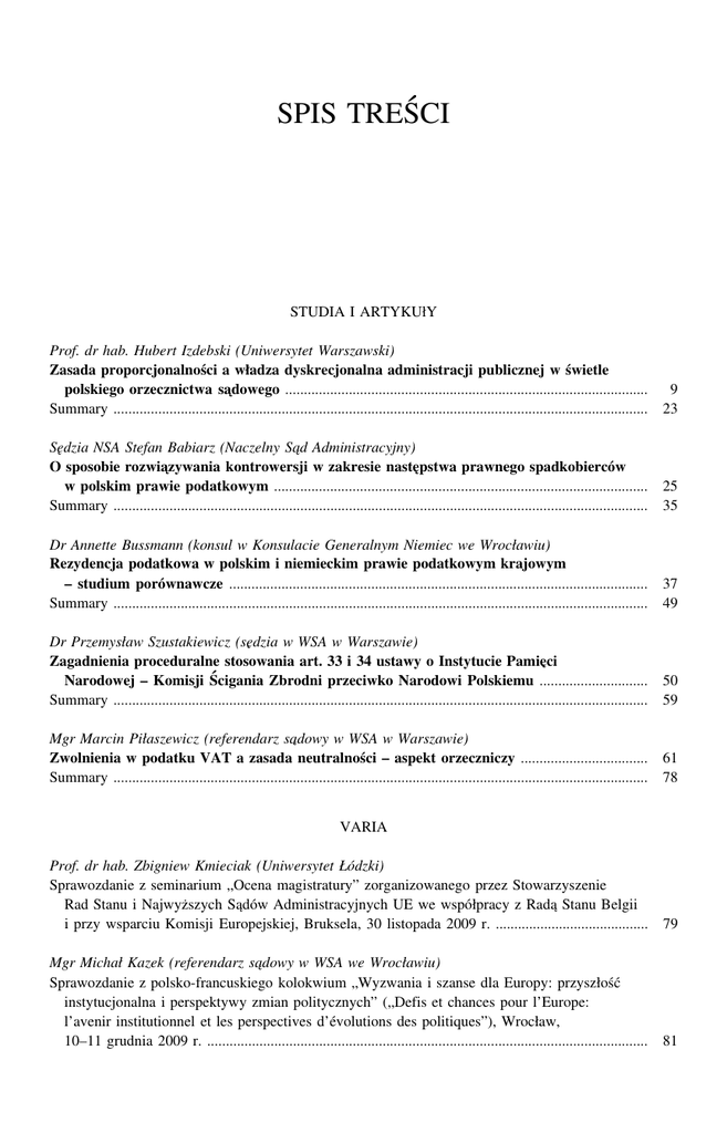 SPIS TREŚCI STUDIA I ARTYKUłY Prof. dr hab. Hubert Izdebski (Uniwersytet Warszawski) Zasada proporcjonalności a władza dyskrecjonalna administracji publicznej w świetle polskiego orzecznictwa sa˛dowego ................................................................................................. 9 Summary ............................................................................................................................................... 23 Se˛dzia NSA Stefan Babiarz (Naczelny Sa˛d Administracyjny) O sposobie rozwia˛zywania kontrowersji w zakresie naste˛pstwa prawnego spadkobierców w polskim prawie podatkowym .................................................................................................... 25 Summary ............................................................................................................................................... 35 Dr Annette Bussmann (konsul w Konsulacie Generalnym Niemiec we Wrocławiu) Rezydencja podatkowa w polskim i niemieckim prawie podatkowym krajowym – studium porównawcze ................................................................................................................ 37 Summary ............................................................................................................................................... 49 Dr Przemysław Szustakiewicz (se˛dzia w WSA w Warszawie) Zagadnienia proceduralne stosowania art. 33 i 34 ustawy o Instytucie Pamie˛ci Narodowej – Komisji Ścigania Zbrodni przeciwko Narodowi Polskiemu ............................. 50 Summary ............................................................................................................................................... 59 Mgr Marcin Piłaszewicz (referendarz sa˛dowy w WSA w Warszawie) Zwolnienia w podatku VAT a zasada neutralności – aspekt orzeczniczy .................................. 61 Summary ............................................................................................................................................... 78 VARIA Prof. dr hab. Zbigniew Kmieciak (Uniwersytet Łódzki) Sprawozdanie z seminarium „Ocena magistratury” zorganizowanego przez Stowarzyszenie Rad Stanu i Najwyższych Sa˛dów Administracyjnych UE we współpracy z Rada˛ Stanu Belgii i przy wsparciu Komisji Europejskiej, Bruksela, 30 listopada 2009 r. ......................................... 79 Mgr Michał Kazek (referendarz sa˛dowy w WSA we Wrocławiu) Sprawozdanie z polsko-francuskiego kolokwium „Wyzwania i szanse dla Europy: przyszłość instytucjonalna i perspektywy zmian politycznych” („Defis et chances pour l’Europe: l’avenir institutionnel et les perspectives d’évolutions des politiques”), Wrocław, 10–11 grudnia 2009 r. ...................................................................................................................... 81 4 Zeszyty Naukowe Sa˛downictwa Administracyjnego 1(28)/2010 ORZECZNICTWO I. Europejski Trybunał Sprawiedliwości (wybór i opracowanie: Władysław Czapliński) Zasady państwa prawnego w orzecznictwie ETS (Wyroki ETS 1. z dnia 15 maja 1986 r., sprawa 222/84 Johnston przeciwko Chief Constable of the Royal Ulster Constabulary, s. 83; 2. z dnia 10 lipca 1984 r., sprawa 63/83 Regina [Królowa] przeciwko Kirkowi, s. 84; 3. z dnia 13 lutego 1979 r., sprawa 85/76 Hoffmann-La Roche AG przeciwko Komisji, s. 85) ................................................................ 83 II. Europejski Trybunał Praw Człowieka (wybór i opracowanie: Agnieszka Wilk) Prawo do rozpoznania sprawy w rozsa˛dnym terminie Wyrok ETPC z dnia 15 września 2009 r., w sprawie Lorenc przeciwko Polsce, skarga nr 28604/03 [dot. zarzutu naruszenia art. 6 Konwencji o ochronie praw człowieka w sprawie dotycza˛cej zwrotu wywłaszczonej nieruchomości) ............................. 88 Trybunał Konstytucyjny (opracowała Irena Chojnacka) Zasady orzekania o niezdolności do służby w Policji (wyrok TK z dnia 23 listopada 2009 r. sygn. akt P 61/08) ....................................................................................................... 91 III. IV. Sa˛d Najwyższy (wybór: Andrzej Wróbel, opracowanie: Dawid Mia˛sik) Postanowienie Sa˛du Najwyższego z dnia 3 września 2009 r. sygn. akt III SK 16/09 [dot. pytania prawnego do ETS w sprawie interpretacji art. 58 Aktu akcesyjnego – powoływanie sie˛ na postanowienia wytycznych Komisji Europejskiej przy braku ich opublikowania w Dzienniku Urze˛dowym UE w je˛zyku państwa członkowskiego] ............. 103 V. Naczelny Sa˛d Administracyjny i wojewódzkie sa˛dy administracyjne A. Orzecznictwo Naczelnego Sa˛du Administracyjnego (wybór: Stefan Babiarz, opracowanie: Marcin Wia˛cek) 1. Uchwała składu siedmiu se˛dziów NSA z dnia 7 grudnia 2009 r. sygn. akt I OPS 9/09 [dot. skutków wyroku Trybunału Konstytucyjnego wydanego po wniesieniu skargi kasacyjnej, a przed jej rozpoznaniem przez NSA] ........................................... 108 2. Uchwała składu siedmiu se˛dziów NSA z dnia 7 grudnia 2009 r. sygn. akt II FPS 5/09 [dot. przedawnienia odsetek od zaniżonych lub niewniesionych w terminie zaliczek na podatek dochodowy] ............................................................... 115 B. Orzecznictwo wojewódzkich sa˛dów administracyjnych (wybór: Bogusław Gruszczyński, opracowanie: Marcin Wia˛cek) 1. Wyrok WSA w Warszawie z dnia 12 lutego 2009 r. sygn. akt IV SA/Wa 1820/08 [dot. treści decyzji o ustaleniu lokalizacji inwestycji celu publicznego w cze˛ści dotycza˛cej ochrony interesów osób trzecich] ............................................................... 120 2. Wyrok WSA w Warszawie z dnia 25 lutego 2009 r. sygn. akt VI SA/Wa 2471/08 [dot. warunków uzyskania pozwolenia na broń palna˛] ................................................ 122 3. Wyrok WSA w Szczecinie z dnia 18 marca 2009 r. sygn. akt I SA/Sz 731/08 [dot. podstawy opodatkowania akcyza˛ nabycia wewna˛trzwspólnotow