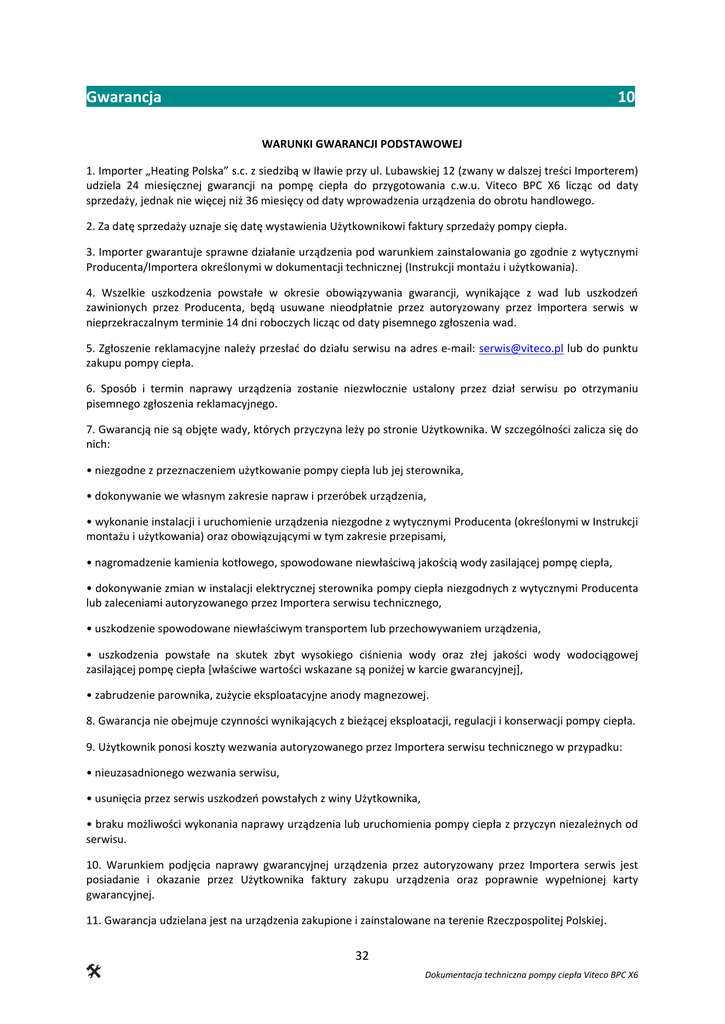 Gwarancja 10 WARUNKI GWARANCJI PODSTAWOWEJ 1. Importer „Heating Polska” s.c. z siedzibą w Iławie przy ul. Lubawskiej 12 (zwany w dalszej treści Importerem) udziela 24 miesięcznej gwarancji na pompę ciepła do przygotowania c.w.u. Viteco BPC X6 licząc od daty sprzedaży, jednak nie więcej niż 36 miesięcy od daty wprowadzenia urządzenia do obrotu handlowego. 2. Za datę sprzedaży uznaje się datę wystawienia Użytkownikowi faktury sprzedaży pompy ciepła. 3. Importer gwarantuje sprawne działanie urządzenia pod warunkiem zainstalowania go zgodnie z wytycznymi Producenta/Importera określonymi w dokumentacji technicznej (Instrukcji montażu i użytkowania). 4. Wszelkie uszkodzenia powstałe w okresie obowiązywania gwarancji, wynikające z wad lub uszkodzeń zawinionych przez Producenta, będą usuwane nieodpłatnie przez autoryzowany przez Importera serwis w nieprzekraczalnym terminie 14 dni roboczych licząc od daty pisemnego zgłoszenia wad. 5. Zgłoszenie reklamacyjne należy przesłać do działu serwisu na adres e-mail: [email protected] lub do punktu zakupu pompy ciepła. 6. Sposób i termin naprawy urządzenia zostanie niezwłocznie ustalony przez dział serwisu po otrzymaniu pisemnego zgłoszenia reklamacyjnego. 7. Gwarancją nie są objęte wady, których przyczyna leży po stronie Użytkownika. W szczególności zalicza się do nich: • niezgodne z przeznaczeniem użytkowanie pompy ciepła lub jej sterownika, • dokonywanie we własnym zakresie napraw i przeróbek urządzenia, • wykonanie instalacji i uruchomienie urządzenia niezgodne z wytycznymi Producenta (określonymi w Instrukcji montażu i użytkowania) oraz obowiązującymi w tym zakresie przepisami, • nagromadzenie kamienia kotłowego, spowodowane niewłaściwą jakością wody zasilającej pompę ciepła, • dokonywanie zmian w instalacji elektrycznej sterownika pompy ciepła niezgodnych z wytycznymi Producenta lub zaleceniami autoryzowanego przez Importera serwisu technicznego, • uszkodzenie spowodowane niewłaściwym transportem lub przechowywaniem urządzenia, • uszkodzenia powstałe na skutek zbyt wysokiego ciśnienia wody oraz złej jakości wody wodociągowej zasilającej pompę ciepła [właściwe wartości wskazane są poniżej w karcie gwarancyjnej], • zabrudzenie parownika, zużycie eksploatacyjne anody magnezowej. 8. Gwarancja nie obejmuje czynności wynikających z bieżącej eksploatacji, regulacji i konserwacji pompy ciepła. 9. Użytkownik ponosi koszty wezwania autoryzowanego przez Importera serwisu technicznego w przypadku: • nieuzasadnionego wezwania serwisu, • usunięcia przez serwis uszkodzeń powstałych z winy Użytkownika, • braku możliwości wykonania naprawy urządzenia lub uruchomienia pompy ciepła z przyczyn niezależnych od serwisu. 10. Warunkiem podjęcia naprawy gwarancyjnej urządzenia przez autoryzowany przez Importera serwis jest posiadanie i okazanie przez Użytkownika faktury zakupu urządzenia oraz poprawnie wypełnionej karty gwarancyjnej. 11. Gwarancja udzielana jest na urządzenia zakupione i zainstalowane na terenie Rzeczpospolitej Polskiej. 32 Dokumentacja techniczna pompy ciepła Viteco BPC X6 Gwarancja 10 WARUNKI WYDŁUŻONEJ GWARANCJI – DO 5-ciu LAT §1 Importer „Heating Polska” s.c. z siedzibą w Iławie przy ul. Lubawskiej 12 (zwany w dalszej treści Importerem) udziela 5-cio letniej gwarancji na pompę ciepła do przygotowania c.w.u. Viteco BPC X6, jednak nie więcej niż 6 lat od daty wprowadzenia urządzenia do obrotu handlowego – dotyczy osób fizycznych. Urządzenia zakupione na potrzeby działalności gospodarczej objęte są 24 miesięcznym okresem gwarancji. §2 Uprawnionym z tytułu gwarancji jest Klient (zwany w dalszej treści Użytkownikiem), na którego zlecenie urządzenie zostało zamontowane i uruchomione. Okres gwarancji liczony jest od: a/ daty pierwszego uruchomienia urządzenia dokonanego (i potwierdzonego wpisem w karcie gwarancyjnej) w terminie do 3 miesięcy licząc od daty zakupu albo od daty zakupu urządzenia – jeżeli jego uruchomienie odbyło się później niż 3 miesiące od daty zakupu, b/ podstawowy okres gwarancji wynosi 2 lata, przy czym gwarancja ulega wydłużeniu o kolejny rok (do maksymalnie 5 lat) po każdym corocznym, płatnym gwarancyjnym przeglądzie okresowym urządzenia dokonanym przez autoryzowany przez Importera serwis i potwierdzonym wpisem w karcie gwarancyjnej, c/ za datę zakupu uznaje się datę wystawienia Użytkownikowi faktury sprzedaży pompy ciepła. §3 Zainteresowany Użytkownik urządzenia zobowiązany jest zgłosić zamiar skorzystania z programu gwarancyjnego dotyczącego wydłużonej gwarancji. Zgłoszenie polega na poinformowaniu autoryzowanego przez Importera serwisu technicznego o chęci dokonania gwarancyjnego przeglądu okresowego. Zgłoszenia należy dokonać w nieprzekraczalnym terminie 14 dni kalendarzowych licząc od daty zakończenia gwarancji podstawowej oraz po każdym kolejnym roku eksploatacji urządzenia liczonym od daty nabycia przez Użytkownika uprawnień gwarancyjnych (data zakupu bądź data pierwszego uruchomienia urządzenia). §4 Importer gwarantuje, że urządzenie jest pozbawione wad produkcyjnych i konstrukcyjnych. Importer gwarantuje sprawne działanie urządzenia pod warunkiem zainstalowania go zgodnie z wytycznymi Producenta/Importera określonymi w dokumentacji technicznej (Instrukcji montażu i użytkowania). §5 Wszelkie uszkodzenia powstałe w okresie obowiązywania gwarancji, wynikające z wad lub uszkodzeń zawinionych przez Producenta, będą usuwane nieodpłatnie przez autoryzowany przez Importera serwis w nieprzekraczalnym terminie 14 dni roboczych licząc od daty pisemnego zgłoszenia wad. §6 Warunkiem uzyskania przez Użytkownika świadczeń gwarancyjnych niniejszej 5-cio letniej gwarancji jest: a/ pisemne zgłoszenie usterki urządzenia w terminie do 48 godzin od jej wystąpienia, b/ okazanie poprawnie i całkowicie wypełni