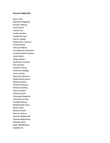 Rocznik 1960/1961 Barcz Piotr Bociański Zbigniew Brzyski Tadeusz Celta Janina Chmiel Jan Cudok Herbert Czaplińska Ewa Derner Sybilla Federowicz Ireneusz Fusek Wanda Górczyk Helena Januszkiewicz Wojciech Jendrychowski Andrzej Jeżak Maria Kling Andrzej Kordecka Krystyna Kos Ireneusz Koźlicka Teresa Kristman Jadwiga Lisson Gerda Macyszyn Ryszard Maliszewski Janusz Matuła Joanna Niedurny Marian Nowicki Andrzej Pacuk Edward Pieprzak Zofia Pomykała Zbigniew Pozimska Urszula Pradella Dorota Różankowski Jerzy Rożek Józef Rymarz Emilia Rymarz Helena Salonek Waltrauda Sawicka Bogusława Sikorska Anna Śliwa Włodzimierz Spiołek Jan Stanienda Andrzej Starosolski Bożydar Stűrz Dieter Szczepanowski Marek Szpineter Jerzy Szulowski Jan Słania Halina Wojcieszonek Lucyna Wojnowski Zbigniew