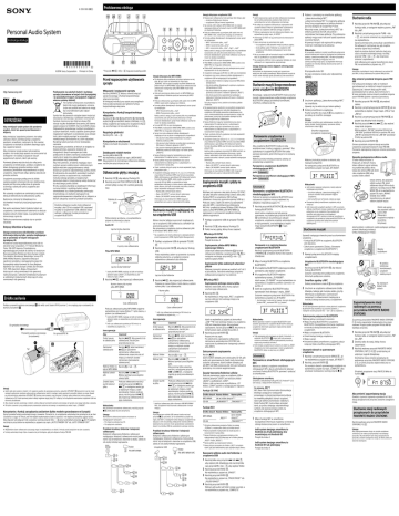 4-559-900-33(1) Podstawowa obsługa Personal Audio System Instrukcja obsługi ©2014 Sony Corporation Printed in China * Przyciski i VOL + mają wyczuwalny punkt. Przed rozpoczęciem użytkowania sprzętu ZS-RS60BT Pozbywanie się zużytych baterii i zużytego sprzętu (stosowane w krajach Unii Europejskiej i w pozostałych krajach europejskich mających własne systemy zbiórki) OSTRZEŻENIE Aby zmniejszyć ryzyko pożaru lub porażenia prądem, chroń ten aparat przed deszczem i wilgocią. Aby zmniejszyć zagrożenie pożarem, nie należy zakrywać otworu wentylacyjnego urządzenia gazetami, serwetkami, zasłonami, itp. Nie narażaj urządzenia na kontakt ze źródłem otwartego ognia (np. zapalone świece). Aby zmniejszyć ryzyko pożaru lub porażenia prądem, nie narażaj tego aparatu na zamoczenie lub ochlapanie i nie stawiaj na aparacie naczyń wypełnionych płynem, takich jak wazony. Ponieważ główna wtyczka służy do odłączenia urządzenia od źródła prądu, podłącz urządzenie do łatwo dostępnego gniazda zasilania. Jeżeli zauważysz jakiekolwiek nieprawidłowości w pracy urządzenia, natychmiast odłącz główną wtyczkę od gniazda zasilania. Urządzenie pozostaje podłączone do źródła zasilania prądem zmiennym (do sieci elektrycznej), dopóki jest fizycznie podłączone do gniazda ściennego, nawet jeśli samo urządzenie jest wyłączone. Nie ustawiaj urządzenia w zamkniętej przestrzeni, takiej jak biblioteczka lub wbudowana szafka. Nadmierne ciśnienie fal dźwiękowych w słuchawkach może być przyczyną pogorszenia słuchu. Nie wolno wystawiać baterii (pakietu baterii ani urządzenia z zainstalowanymi bateriami) na dłuższe działanie silnych źródeł ciepła, na przykład światła słonecznego, ognia itp. Ten symbol umieszczony na produkcie, baterii lub na jej opakowaniu oznacza, że ten ani produkt ani bateria nie mogą być ona traktowane jako odpad komunalny. Symbol ten dla pewnych rodzajów baterii może być stosowany w kombinacji z symbolem chemicznym. Symbole chemiczne rtęci (Hg) lub ołowiu (Pb) stosuje się jako dodatkowe oznaczenie, jeśli bateria zawiera więcej niż 0,0005% rtęci lub 0,004% ołowiu. Odpowiednio gospodarując zużytymi produktami i zużytymi bateriami, możesz zapobiec potencjalnym negatywnym wpływom na środowisko oraz zdrowie ludzi, jakie mogłyby wystąpić w przypadku niewłaściwego obchodzenia się z tymi odpadami. Recykling baterii pomoże chronić środowisko naturalne. W przypadku produktów, w których ze względu na bezpieczeństwo, poprawne działanie lub integralność danych wymagane jest stałe podłączenie do baterii, wymianę zużytej baterii należy zlecić wyłącznie wykwalifikowanemu personelowi stacji serwisowej. Aby mieć pewność, że bateria znajdująca się w zużytym sprzęcie elektrycznym i elektronicznym będzie właściwie zagospodarowana, należy dostarczyć sprzęt do odpowiedniego punktu zbiórki. W odniesieniu do wszystkich pozostałych zużytych baterii, prosimy o zapoznanie się z rozdziałem instrukcji obsługi produktu o bezpiecznym demontażu baterii. Zużytą baterię należy dostarczyć do właściwego punktu zbiórki. W celu uzyskania bardziej szczegółowych informacji na temat zbiórki i recyklingu baterii należy skontaktować się z lokalną jednostką samorządu terytorialnego, ze służbami zajmującymi się zagospodarowywaniem odpadów lub ze sklepem, w którym zakupiony został ten produkt lub bateria. Włączanie i wyłączanie sprzętu Naciśnij OPERATE . Możesz również włączyć sprzęt, korzystając z funkcji bezpośredniego włączania (poniżej). W niniejszej instrukcji przy opisie poszczególnych funkcji wykorzystywana jest głównie funkcja bezpośredniego włączania. Korzystanie z funkcji bezpośredniego włączania Naciśnij CD , USB , BLUETOOTH , FM/AM , AUDIO IN lub FAVORITE RADIO STATIONS (1-3) , kiedy urządzenie jest wyłączone. Urządzenie włączy się, uruchamiając od razu wybraną funkcję. Regulacja głośności Naciśnij VOL + lub . Korzystanie ze słuchawek Podłącz słuchawki do gniazda (słuchawkowego) . Zwiększanie niskich tonów Naciśnij MEGA BASS . Na wyświetlaczu pojawi się napis „MEGA BASS”. Aby powrócić do normalnego odtwarzania dźwięku, naciśnij ten przycisk jeszcze raz. Odtwarzanie płyty z muzyką 1 2 Naciśnij CD , aby włączyć funkcję CD. Naciśnij przycisk PUSH OPEN/CLOSE , umieść płytę na tacy CD i zamknij pokrywę tacy. Etykieta do góry Osobisty odtwarzacz audio może odtwarzać muzykę z płyt CD lub urządzeń USB, zapisywać muzykę na urządzeniach USB, odbierać stacje radiowe i odtwarzać muzykę przesyłaną z urządzeń BLUETOOTH. Uwagi dotyczące płyt MP3/WMA Po włożeniu płyty urządzenie odczytuje zapisane na niej pliki. W tym czasie na wyświetlaczu miga napis „READING”. Jeśli na płycie znajduje się wiele folderów lub plików innych niż MP3/WMA, rozpoczęcie odtwarzania lub odtwarzanie następnego pliku MP3/WMA może trwać dość długo. Zalecamy pominięcie plików innych niż MP3/WMA oraz niepotrzebnych folderów podczas tworzenia płyt MP3/ WMA. Podczas odtwarzania są pomijane pliki audio inne niż MP3 i WMA, nawet jeżeli znajdują się w folderze. Formaty plików dźwiękowych obsługiwanych przez sprzęt są następujące: MP3: Rozszerzenie pliku „.mp3” WMA: Rozszerzenie pliku „.wma” Należy zwrócić uwagę, że jeśli nazwa pliku ma prawidłowe rozszerzenie, ale sam plik został utworzony w innym formacie dźwiękowym, sprzęt może odtwarzać szumy lub może nie działać prawidłowo. Format MP3 PRO nie jest obsługiwany. Pliki WMA z kodowaniem WMA DRM, WMA Lossless oraz WMA PRO nie mogą być odtwarzane. Sprzęt nie może odtwarzać plików dźwiękowych znajdujących się na płycie w następujących przypadkach: Gdy łączna liczba plików dźwiękowych w jednym folderze przekracza 999. Gdy łączna liczba folderów na jednej płycie przekracza 256 (ra