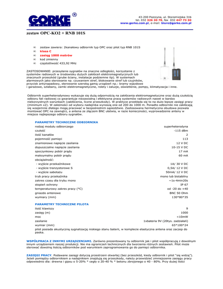 zestaw OPC-KO2 + RNB 101S • • • • • zestaw zawiera: 2kanałowy odbiornik typ OPC oraz pilot typ RNB 101S klasa C zasięg 1000 metrów kod zmienny częstotliwość 433,92 MHz ZASTOSOWANIE: przesyłanie sygnałów na znaczne odległości, korzystanie z systemów radiowych w środowisku dużych zakłóceń elektromagnetycznych lub znacznych przeszkód (grube ściany, instalacje podziemne itp). W systemach alarmowych jako sterowanie np. czuwaniem stref, blokowanie stref lub czujników, przycisk antynapadowy, sterowanie szeroką gamą urządzeń np.: bramy wjazdowe i garażowe, szlabany, zamki elektromagnetyczne, rolety i żaluzje, oświetlenie, pompy, klimatyzacja i inne. Odbiornik superheterodynowy wykazuje się dużą odpornością na zakłócenia elektromagnetyczne oraz dużą czułością odbioru fali radiowej co gwarantuje niezawodną i efektywna pracę systemów radiowych nawet w bardzo niekorzystnych warunkach (zakłócenia, liczne przeszkody). W praktyce przekłada się to na dużo lepsze zasięgi pracy (minimum x2). W zależności od wyboru nadajnika wynoszą one od 200 do 1000 m. Ponadto odbiorniki nie zakłócają się wzajemnie dlatego mogą pracować w bezpośrednim sąsiedztwie. Zastosowana hermetyczna obudowa pozwala montować OPC na zewnątrz, a antena ze złączem BNC ułatwia, w razie konieczności, wyprowadzenie anteny w miejsce najlepszego odbioru sygnałów. PARAMETRY TECHNICZNE ODBIORNIKA rodzaj modułu odbiorczego czułość ilość kanałów pojemność pamięci znamionowe napięcie zasilania dopuszczalne napięcie zasilania superheterodyna -115 dBm 2 113 12 V DC 10-15 V DC spoczynkowy pobór prądu 17 mA maksymalny pobór prądu 60 mA obciążalność: - wyjście przekaźnikowe - wyjście tranzystorowe S - wyjście sabotażu tryb pracy przekaźnika zakres czasu dla trybu mono stopień ochrony temperaturowy zakres pracy (°C) gniazdo antenowe wymiary (mm) . 1A/ 30 V DC 0,5A/ 12 V DC 50mA/ 12 V DC mono lub bistabilny ~1s-4min20s IP 67 od -20 do +40 BNC 50 Ohm 130*80*35 PARAMETRY TECHNICZNE PILOTA ilość klawiszy zasięg (m) moc zasilanie wymiar (mm) 9 1000 <10mW 1xbateria 9V (20tys. zadziałań) 65*100*24 pilot posiada akustyczną sygnalizację niskiego stanu baterii, w komplecie elastyczna antena oraz zaczep do paska. WSPÓŁPRACA Z INNYMI URZĄDZENIAMI. Zarówno prezentowany tu odbiornik jak i pilot współpracują z dowolnym innym urządzeniem naszej produkcji. Nie ma ograniczeń technicznych dla tworzenia różnych zestawień. Pilot może sterować dowolną ilością odbiorników pod warunkiem zaprogramowania go do pamięci odbiornika. ZASIĘGI PRACY. Podawane zasięgi dotyczą przestrzeni otwartej (bez przeszkód, kiedy odbiornik i pilot “się widzą”). Jeżeli pomiędzy odbiornikiem a nadajnikiem znajdują się przeszkody, należy przewidzieć zmniejszenie zasięgu pracy odpowiednio dla: drewna i gipsu o 5-20% * cegły o 20-40 % * betonu zbrojonego o 40 - 80%. Przy dużej ilości przeszkód zalecamy konfigurowanie zestawów na bazie odbiorników klasy SH, stosowanie retransmiterów lub pilotów dużej mocy. Przy przeszkodach metalowych stosowanie systemów radiowych nie jest zalecane. Należy rozważyć zainstalowanie modułu WLC201, który pozwala na ominięcie tego typu przeszkód. POJEMNOŚĆ PAMIĘCI ODBIORNIKA. Odbiornik OPC posiada pamięć dużą (113 nadajników). Należy pamiętać, że wykasowanie z pamięci nawet jednego pilota wiąże się z koniecznością ponownego zaprogramowania pilotów, które mają pozostać w systemie. Z tego względu dla systemów dużych (kilkadziesiąt, kilkaset pilotów) zalecamy stosowanie odbiorników identyfikacyjnych np. IDO 500, które posiadają możliwość indywidualnego kasowania nadajników z pamięci odbiornika. TRYBY PRACY. Tryb monostabilny czyli naciśnięcie klawisza pilota powoduje załączenie przekaźnika na ustawiony czas. Tryb bistabilny - każdorazowe naciśnięcie klawisza, powoduje zmianę stanu przekaźnika na przeciwny. KOD ZMIENNY. Transmisja pomiędzy nadajnikiem i odbiornikiem oparta jest na kodzie zmiennym (KEELOQ® firmy Microchip Technology Inc.), który zapewnia wysokie bezpieczeństwo użytkowania oraz odporność na sygnały radiowe pochodzące z innych urządzeń. Każdy nadajnik posiada swój indywidualny kod. Odbiornik reaguje tylko na te transmisje, które pochodzą z nadajników zaprogramowanych do jego pamięci. CZĘSTOTLIWOŚĆ 433,92 MHz. Pasmo nie wymagające specjalnych zezwoleń i koncesji na użytkowanie. Montaż urządzeń nie wymaga zgłaszania do URTIP.