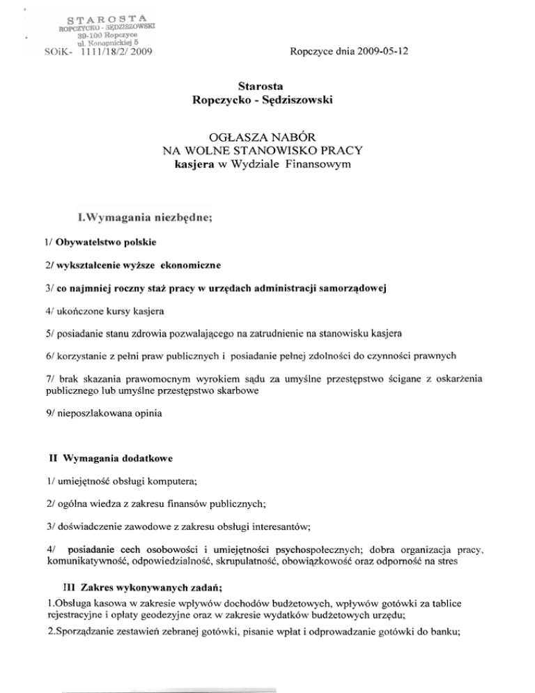 Ropczyce dnia 2009-05-12 Starosta Ropczycko - Sedziszowski OGLASZA NABOR NA WOLNE STANOWISKO PRACY kasjera w Wydziale Finansowym 11 Obywatelstwo polskie 21 wyksztalcenie wyisze ekonomiczne 31 co najmniej roczny stai pracy w urzedach administracji samorzqdowej 4; ukonczone kursy kasjera 51 posiadanie stanu zdrowia pozwalajqcego na zatrudnienie na stanowisku kasjera 61 korzystanie z pelni praw publicznych i posiadanie pelnej zdolnoici do czynnoici prawnych 71 brak skazania prawomocnym wyrokiem sqdu za umyilne przestepstwo Scigane z oskarzenia publicznego lub urnyilne przestqpstwo skarbowe 91 nieposzlakowana opinia I1 Wymagania dodatkowe I / umiejqtnoSC obslugi komputera; 21 ogolna wiedza z zakresu finansow publicznych; 31 doiwiadczenie zawodowe z zakresu obslugi interesantow; 41 posiadanie cech osobowoSci i umiejqtnoici psychospotecznych; dobra organizacja pracy., komunikatywnoSC, odpowiedzialnoiC, sknlpulatnoiC, obowicqkowoi6 oraz odpornoiC na stres 111 Zakres wykonywanych zadali; 1.Obsluga kasowa w zakresie wp'ryw6w dochodow budzetowych, wplywow gotowki za tablice rejestracyjne i optaty geodezyjne oraz w zakresie wydatkow budietowych urzedu; 2.Sporzqdzanie zestawien zebranej gotowki, pisanie wptat i odprowadzanie gotowki do banku; 3.Wyplata wynagrodzen pracownikom zatrudnionym w ramach prac intenvencyjnych, robot publicznych oraz delegacji i rachunk6w z pogotowia kasowego; 4.Sporzqdzanie raportow kasowych; 5.Gospodarowanie drukami icislego zarachowania; 6. Prowadzenie ewidencji zakupionych i zrealizowanych czekow. IV. Wymagane dokumenty: a) iyciorys (CV) b) list motywacyjny c) kserokopie dokumentow poiwiadczajqcych; wyksztalcenie Idyplom lub zaiwiadczenie o stanie odbytych studibwl oraz kopie Swiadectw pracy potwierdzajqce wymagany st& pracy Iw przypadku pozostuwania w stosunku pracy zaiwiadczenie o zatrudnieniu wystmjione przez obecnego pracodawcq/ d) kwestionariusz osobowy dla osoby ubiegajqcej siq o zatrudnienie e) oiwiadczenie o nie skazaniu przez sqd prawomocnym wyrokiem za przestqpstwo Scigane z oskarienia publicznego lub umyilne przestqpstwo skarbowe f)oswiadczenia; o posiadaniu pelnej zdolnoici do czynnoici prawnych oraz posiadaniu pelni praw publicznych g) oiwiadczenie kandydata o wyraieniu zgody na przetwarzanie danych osobowych do celow naboru. h) dokument potwierdzajqcy tozsamoik - kserokopia i) oiwiadczenie o braku przeciwwskazan zdrowotnych do wykonywania pracy na stanowisku kasj era j)inne dokumenty potwierdzajqce uprawnienia, kwalifikacje i umiejqtnoici, IV. Termin i miejsce sMadania dokument6w Wymagane dokumenty aplikacyjne nalezy skladak w zarnkniqtej kopercie opatrzonej napisem;" oferta na stanowisko kasjera w Wydziale finansowym" w siedzibie Starostwa Powiatowego w Ropczycach, Ropczyce, ul. Konopnickiej 5 w poko-ju nr 3 14 - sekretariat 1 I1 piqtrol w nieprzekraczalnym terminie do dnia 25.05.2009 r. do godziny 15.00. Oferty zloione po tym terminie nie bqdq rozpatrywane. Decyduje data dorqczenia. Kandydaci, kt6rzy spelniq wymagania formalne okreilone w ogloszeniu o naborze zostana, powiadomieni o terminie rozmowy kwalifikacyjnej. Niezwlocznie po przeprowadzonym naborze, informacja o wyniku naboru zostanie upowszechniona w Biuletynie Inforrnacji Publicznej i na tablicy ogloszen w siedzibie Starostwa Powiatowego przez okres co najmniej 3 miesiqcy.