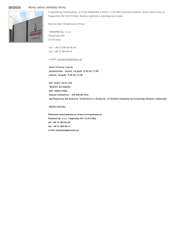11 06 2007 Nowy adres siedziby firmy Z satysfakcją informujemy, iż firma PARKANEX z dniem 11.06.2007 zmieniła siedzibę. Nowy adres firmy to: Targowisko 501 32-015 Kłaj. Numery telefonów pozostają bez zmian. Obecne dane teleadresowe firmy: PARKANEX Sp. z o.o. Targowisko 501 32-015 Kłaj tel.: +48 12 284 06 40-42 fax: +48 12 284 06 41 e-mail: [email protected] Salon firmowy czynny: poniedziałek - piątek: od godz. 8.00 do 17.00 sobota: od godz. 9.00 do 13.00 NIP: PL817-19-01-435 REGON: 831306030 KRS: 0000119466 Kapitał Zakładowy: 100 000,00 PLN, Sąd Rejonowy dla Krakowa Śródmieścia w Krakowie, XI Wydział Gospodarczy Krajowego Rejestru Sądowego Mapka dojazdu: Dokument został pobrany ze strony www.parkanex.pl Parkanex Sp. z o.o. Targowisko 501 32-015 Kłaj tel. +48 12 284-06-40 fax. +48 12 284-06-41 e-mail: [email protected]