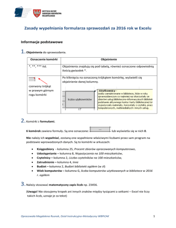 Zasady wypełniania formularza sprawozdań za 2016 rok w Excelu Informacje podstawowe 1. Objaśnienia do sprawozdania. Oznaczenie komórki *, **, *** itd. Objaśnienie Objaśnienia znajdują się pod tabelą, również oznaczone odpowiednią ilością gwiazdek *. Po kliknięciu na oznaczoną trójkątem komórkę, wyświetli się objaśnienie danej kolumny. czerwony trójkąt w prawym górnym rogu komórki 2. Komórki z formułami. 6 komórek zawiera formuły. Są one oznaczone: lub wyświetla się w nich 0. Nie należy ich wypełniać, zostaną one wypełnione właściwymi liczbami przez sam program na podstawie wprowadzonych danych. Są to komórki w arkuszach: Księgozbiory - kolumna 25, Procent zbiorów opracowanych komputerowo, Udostępnianie – kolumna 8, Wypożyczenia na 100 mieszkańców, Czytelnicy – kolumna 2, Liczba czytelników na 100 mieszkańców, Zatrudnienie – kolumna 4, Inne Budżet – kolumna 2, Budżet biblioteki ogółem (w zł) Wiek komputerów – kolumna G, liczba komputerów użytkowanych w bibliotece w 2016 r. ogółem 3. Należy stosować matematyczny zapis liczb np. 23456. (Uwaga! Nie stosujemy kropek ani innych znaków między tysiącami a setkami – Excel nie liczy takich liczb, uznaje je za tekst) Opracowała Magdalena Rusnok, Dział Instrukcyjno-Metodyczny WBPiCAK 1 4. Jeśli jakieś informacje nie dotyczą danej biblioteki, należy zostawić puste pole. 5. Korzystanie z listy rozwijanej. Komórki, w których należy wpisać nazwę programu komputerowego lub odpowiedź tak lub nie, opatrzone są listą rozwijaną. Należy jedynie wybrać właściwą odpowiedź, niemożliwe jest samodzielne wpisanie tekstu. 6. Jeśli po wpisaniu liczby w komórce pojawi się seria znaków ####, oznacza to, że kolumna jest za wąska dla danej liczby i należy ją rozszerzyć . Jak zwiększać szerokość kolumn: 1. Należy najechać kursorem na krawędź pola kolumny na pasku podziału, którą chcemy rozszerzyć. 2. Pojawi się następujący wskaźnik 3. Klikamy lewym przyciskiem myszy i, nie puszczając, rozszerzamy kolumnę do pożądanej szerokości. Opracowała Magdalena Rusnok, Dział Instrukcyjno-Metodyczny WBPiCAK 2 Zestawienia danych w tabelach 7. Liczenie sumy krok po kroku. 1. Klikamy na komórkę, w której ma być wyliczana suma. 2. Klikamy na przycisk obszar Edytowanie). z paska narzędzi (w nowszych Excelach na karcie Narzędzia główne -> 3. Zaznaczamy obszar komórek, których wartości chcemy zsumować (Excel zazwyczaj nam je podpowie i zaznaczy sam), i zatwierdzamy klawiszem Enter. Od teraz w tej komórce automatycznie będą nam się sumowały wartości wszystkich liczb z zaznaczonego wcześniej obszaru (zakresu). Uwaga: Można wpisać formułę w komórkę samodzielnie. W komórkę, w której ma być suma, wpisujemy formułę według wzoru: =suma(pierwsza komórka zakresu:ostatnia komórka zakresu). Zatwierdzamy klawiszem Enter. Zakres komórek to suma zaznaczonych komórek, na których chcemy wykonać jakieś działanie. Każda funkcja (suma lub średnia) wymaga wybrania zakresu. W formułach ma on zawsze postać (pierwsza komórka zakresu:ostatnia komórka zakresu), krańcowe komórki zakresu zawsze oddzielamy dwukropkiem. 8. Liczenie średniej. 1. W każdej wersji programu Excel oraz Open Office można wpisać formułę Średniej w komórkę samodzielnie analogicznie do Sumy. W komórkę, w której ma być średnia, wpisujemy formułę według wzoru: =średnia(pierwsza komórka zakresu:ostatnia komórka zakresu) np. =średnia(B6:B9) 2. Zatwierdzamy Enterem. Możemy skorzystać też z paska narzędzi: w nowszych Excelach: wybierając z karty Narzędzia główne->pola Edytowanie-> menu rozwijane (strzałka przy sumie )-> Średnia. Zaznaczamy zakres komórek lub wpisujemy ze wzoru =średnia(pierwsza komórka zakresu:ostatnia komórka zakresu) i zatwierdzamy klawiszem Enter. Opracowała Magdalena Rusnok, Dział Instrukcyjno-Metodyczny WBPiCAK 3 W starszych wersjach Excela (kolejne liczby oznaczają krok po kroku 2 klikamy na przycisk funkcji (formuł), otworzy się okno w którym wybieramy Kategorię funkcji: Statystyczne, a z nich Nazwę funkcji: ŚREDNIA 1 wybieramy komórkę, w której ma znaleźć się wynik liczenia średniej 3 W oknie, które się otworzy , w pole Liczba 1 wpisujemy zakres komórek, z których ma być wyliczona średnia (lub zaznaczamy ten zakres w arkuszu) , i zatwierdzamy Ok. Opracowała Magdalena Rusnok, Dział Instrukcyjno-Metodyczny WBPiCAK 4 Sprawozdania MKiDN i WBPiCAK – kwestie definicyjne 1. Liczba pracowników działalności podstawowej (pracownicy merytoryczni): Pracownicy działalności podstawowej ogółem Wszystkie osoby zatrudnione na stanowiskach bibliotekarskich oraz Dyrektor/kierownicy Specjaliści np. ds. promocji, pozyskiwania środków, informatyzacji Informatyk Introligator na stanowiskach bibliotekarskich Wszystkie osoby zatrudnione na stanowiskach bibliotekarskich Uwaga: Jeśli dyrektor pracuje również jako bibliotekarz, wtedy zaliczamy go do osób zatrudnionych na stanowisku bibliotekarskim. UWAGA! Pracownikami działalności podstawowej nie są pracownicy administracji, w tym księgowi, pracownicy gospodarczy, obsługa techniczna itp. 2. Użytkownik a czytelnik użytkownik czytelnik Ma aktywną kartę biblioteczną Ma aktywną kartę biblioteczną w danym roku w danym roku Skorzystał przynajmniej z jednej usługi Wypożyczył przynajmniej jedną książkę w danym roku: (lub inny rodzaj zbiorów) w danym o Wypożyczył chociaż jedną roku. książkę (lub inny rodzaj zbiorów), o Czytał na miejscu o Skorzystał z komputera o Skorzystał z usług bibliograficzno-informacyjnych UWAGA! Ani czytelnikiem, ani użytkownikiem nie jest osoba uczestnicząca w zajęciach, wystawach, spotkaniach itp. UWAGA! Nie liczymy jako użytkowników osób nieposiadających karty, ale wpisanych do jakiegoś zeszytu lub innego rejestru. Prowadźmy jeden rejestr, którego podstawą jest karta biblioteczna (zobowiąza