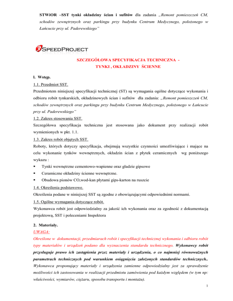 STWiOR –SST tynki okładziny ścian i sufitów dla zadania „Remont