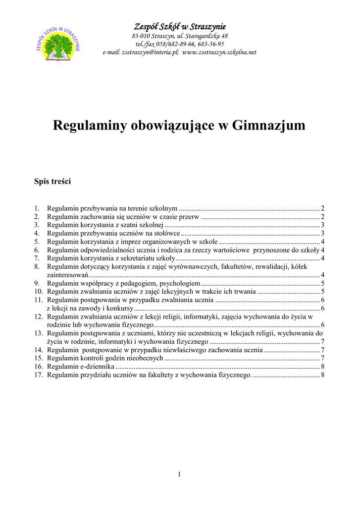 Zespół Szkół w Straszynie 83-010 Straszyn, ul. Starogardzka 48 tel./fax 058/682-89-66, 683-56-95 e-mail: [email protected]; www.zsstraszyn.szkolna.net Regulaminy obowiązujące w Gimnazjum Spis treści 1. 2. 3. 4. 5. 6. 7. 8. 9. 10. 11. 12. 13. 14. 15. 16. 17. Regulamin przebywania na terenie szkolnym .............................................................................. 2 Regulamin zachowania się uczniów w czasie przerw .................................................................. 2 Regulamin korzystania z szatni szkolnej ...................................................................................... 3 Regulamin przebywania uczniów na stołówce ............................................................................. 3 Regulamin korzystania z imprez organizowanych w szkole ........................................................ 4 Regulamin odpowiedzialności ucznia i rodzica za rzeczy wartościowe przynoszone do szkoły 4 Regulamin korzystania z sekretariatu szkoły................................................................................ 4 Regulamin dotyczący korzystania z zajęć wyrównawczych, fakultetów, rewalidacji, kółek zainteresowań ................................................................................................................................ 4 Regulamin współpracy z pedagogiem, psychologiem .................................................................. 5 Regulamin zwalniania uczniów z zajęć lekcyjnych w trakcie ich trwania ................................... 5 Regulamin postępowania w przypadku zwalniania ucznia .......................................................... 6 z lekcji na zawody i konkursy ....................................................................................................... 6 Regulamin zwalniania uczniów z lekcji religii, informatyki, zajęcia wychowania do życia w rodzinie lub wychowania fizycznego............................................................................................ 6 Regulamin postępowania z uczniami, którzy nie uczestniczą w lekcjach religii, wychowania do życia w rodzinie, informatyki i wychowania fizycznego ............................................................. 7 Regulamin postępowanie w przypadku niewłaściwego zachowania ucznia ............................... 7 Regulamin kontroli godzin nieobecnych ...................................................................................... 7 Regulamin e-dziennika ................................................................................................................. 8 Regulamin przydziału uczniów na fakultety z wychowania fizycznego. ..................................... 8 1 1. Regulamin przebywania na terenie szkolnym Za teren szkolny uznajemy budynek szkoły wraz z otaczającym go obszarem wyznaczonym przez ogrodzenie. Wejście do szkoły oraz korytarze szkolne są monitorowane. 1. Uczniowie rozpoczynający lekcje wchodzą do szkoły wejściem do gimnazjum. 2. Uczeń jest zobowiązany do stawienia się w szkole nie wcześniej niż na 10 minut przed rozpoczęciem pierwszej godziny lekcyjnej według planu lekcji swojej klasy. 3. Po wejściu na teren budynku szkoły uczniowie zobowiązani są do zmiany obuwia w szatni. 4. Uczniowie podczas pobytu w szkole są pod stałą opieką nauczycieli i pracowników szkoły. 5. Uczniowie nie mogą samowolnie opuszczać budynku szkoły w czasie trwania ich zajęć. 6. Podczas trwania lekcji uczniowie nie mogą przebywać na korytarzu szkolnym bez zgody nauczyciela. 7. Uczniowie mają zakaz przechodzenia i przebywania na galerii (widowni) hali sportowej bez opieki nauczyciela. 8. Uczniowie mają zakaz przebywania na terenie Szkoły Podstawowej za wyjątkiem wizyt u pedagoga, psychologa i pielęgniarki szkolnej. 9. Uczniowie korzystają ze sklepiku tylko podczas wyznaczonych przerw. 10. Nauczyciele pełniący dyżury przy szatniach sportowych dbają o respektowanie przez uczniów wyznaczonego harmonogramu przebywania przy sklepiku. 11. Uczniowie korzystają z biblioteki szkolnej tylko podczas wyznaczonych przerw. 12. Uczniowie przebywający w bibliotece przestrzegają regulaminu obowiązującego w bibliotece. 13. Osoby postronne, chcące wejść do budynku szkoły, zobowiązane są do: korzystania wyłączne z wejścia głównego do ZS w Straszynie, wpisania w „Zeszycie wejść i wyjść” (znajduje się u woźnej): swojego imienia i nazwiska, celu pobytu na terenie szkoły oraz godziny wejścia na teren placówki, umieszczenia na wierzchniej części ubrania otrzymanego identyfikatora „Gość” niezwłocznego zgłoszenia się do sekretariatu szkoły, wpisania godziny opuszczenia budynku szkolnego, potwierdzenia podanych przez siebie danych czytelnym podpisem złożonym w rubryce Zeszytu, wskazanej przez pracownika szkoły. 14. Przebywanie osób postronnych w budynku szkoły podlega kontroli przez nauczycieli oraz innych pracowników szkoły. 15. Zabrania się uczniom gimnazjum korzystania z placu zabaw należącego do ZS w Straszynie. 16. W czasie przerw uczniowie wychodzą na boisko tylko przez wejście nadzorowane przez nauczyciela pełniącego dyżur. 2. Regulamin zachowania się uczniów w czasie przerw 1. Uczniowie podporządkowują się poleceniom nauczycieli dyżurujących, innych nauczycieli oraz pracowników szkoły. 2. Uczniowie przebywają na piętrze, na którym aktualnie odbywają się ich zajęcia lekcyjne. 3. Teczki i plecaki uczniów mają być ustawione przy ścianie sali lekcyjnej, w której uczniowie mają lekcje. 4. Bez zezwolenia nauczyciela prowadzącego zajęcia lub dyżurującego nie wolno przebywać w salach lekcyjnych. 2 Zespół Szkół w Straszynie 83-010 Straszyn, ul. Starogardzka 48 tel./fax 058/682-89-66, 683-56-95 e-mail: [email protected]; www.zsstraszyn.szkolna.net 5. W czasie przerw trzeba zachowywać się i wypowiadać kulturalnie – nie wolno przeklinać, przezywać innych, niszczyć kwiatów, sprz