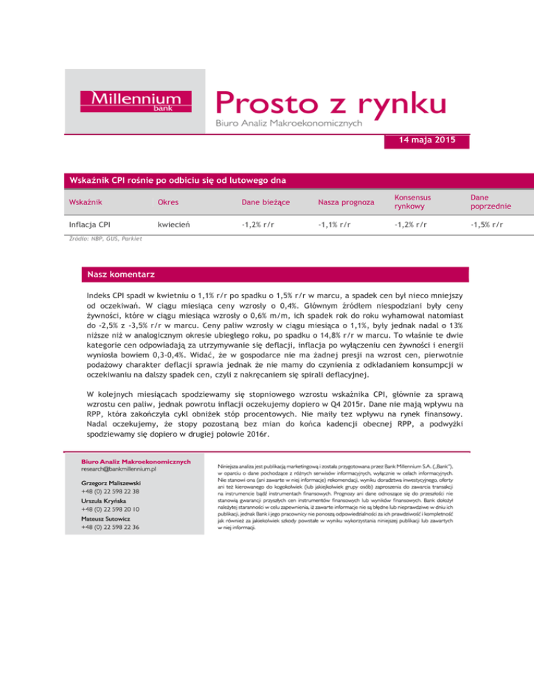 14 maja 2015 Wskaźnik CPI rośnie po odbiciu się od lutowego dna Wskaźnik Okres Dane bieżące Nasza prognoza Konsensus rynkowy Dane poprzednie Inflacja CPI kwiecień -1,2% r/r -1,1% r/r -1,2% r/r -1,5% r/r Źródło: NBP, GUS, Parkiet Nasz komentarz Indeks CPI spadł w kwietniu o 1,1% r/r po spadku o 1,5% r/r w marcu, a spadek cen był nieco mniejszy od oczekiwań. W ciągu miesiąca ceny wzrosły o 0,4%. Głównym źródłem niespodziani były ceny żywności, które w ciągu miesiąca wzrosły o 0,6% m/m, ich spadek rok do roku wyhamował natomiast do -2,5% z -3,5% r/r w marcu. Ceny paliw wzrosły w ciągu miesiąca o 1,1%, były jednak nadal o 13% niższe niż w analogicznym okresie ubiegłego roku, po spadku o 14,8% r/r w marcu. To właśnie te dwie kategorie cen odpowiadają za utrzymywanie się deflacji, inflacja po wyłączeniu cen żywności i energii wyniosła bowiem 0,3-0,4%. Widać, że w gospodarce nie ma żadnej presji na wzrost cen, pierwotnie podażowy charakter deflacji sprawia jednak że nie mamy do czynienia z odkładaniem konsumpcji w oczekiwaniu na dalszy spadek cen, czyli z nakręcaniem się spirali deflacyjnej. W kolejnych miesiącach spodziewamy się stopniowego wzrostu wskaźnika CPI, głównie za sprawą wzrostu cen paliw, jednak powrotu inflacji oczekujemy dopiero w Q4 2015r. Dane nie mają wpływu na RPP, która zakończyła cykl obniżek stóp procentowych. Nie maiły tez wpływu na rynek finansowy. Nadal oczekujemy, że stopy pozostaną bez mian do końca kadencji obecnej RPP, a podwyżki spodziewamy się dopiero w drugiej połowie 2016r.