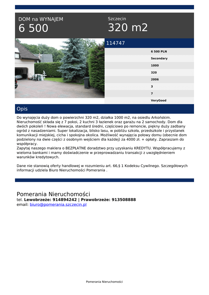 Szczecin DOM na WYNAJEM 320 m2 6 500 114747 6 500 PLN Secondary 1000 320 2006 3 7 VeryGood Opis Do wynajęcia duży dom o powierzchni 320 m2, działka 1000 m2, na osiedlu Arkońskim. Nieruchomość składa się z 7 pokoi, 2 kuchni 3 łazienek oraz garażu na 2 samochody. Dom dla dwóch pokoleń ! Nowa elewacja, standard średni, częściowo po remoncie, piękny duży zadbany ogród z nasadzeniami. Super lokalizacja, blisko lasu, w pobliżu szkoła, przedszkole i przystanek komunikacji miejskiej, cicha i spokojna okolica. Możliwość wynajęcia połowy domu (obecnie dom podzielony na dwie części z osobnym wejściem dla każdej) za 4000 zł. + opłaty. Zapraszam do współpracy. Zapytaj naszego maklera o BEZPŁATNE doradztwo przy uzyskaniu KREDYTU. Współpracujemy z wieloma bankami i mamy doświadczenie w przeprowadzaniu transakcji z uwzględnieniem warunków kredytowych. Dane nie stanowią oferty handlowej w rozumieniu art. 66,§ 1 Kodeksu Cywilnego. Szczegółowych informacji udziela Biuro Nieruchomości Pomerania . Pomerania Nieruchomości tel. Lewobrzeże: 914894242 | Prawobrzeże: 913508888 email: [email protected] Pomerania Nieruchomości Powered by TCPDF (www.tcpdf.org)