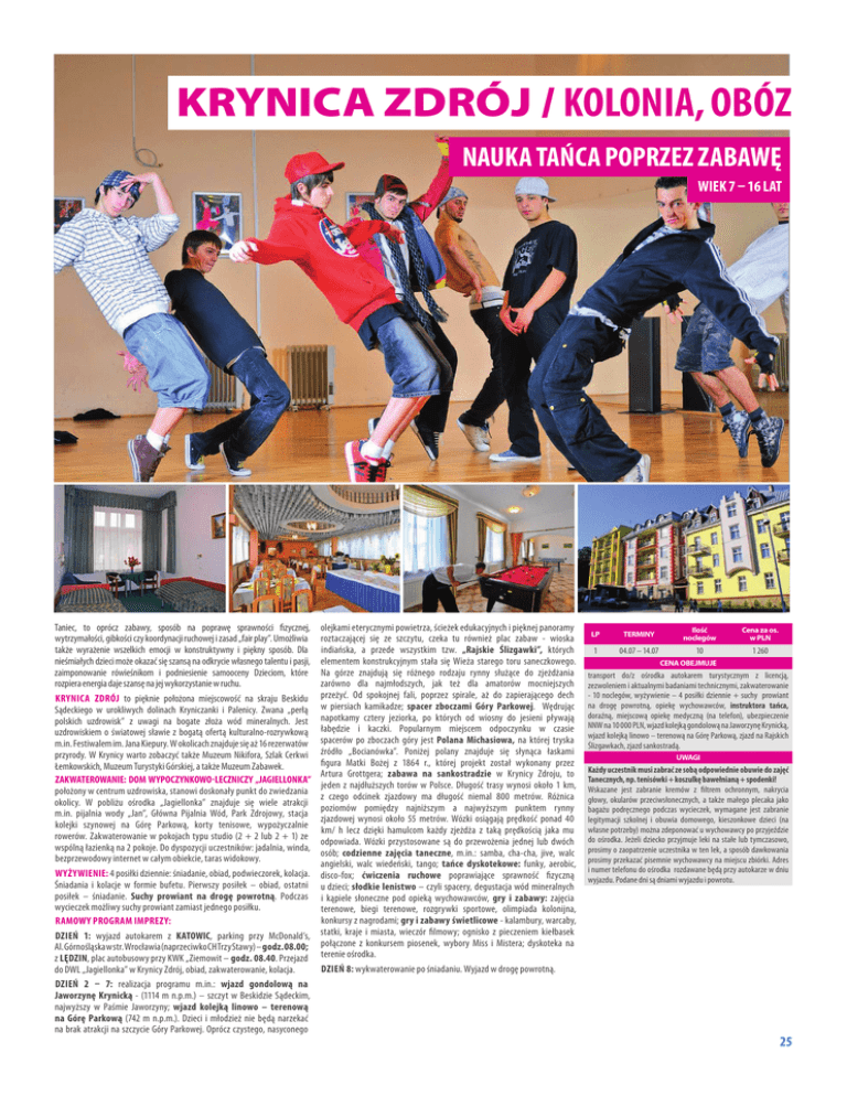 KRYNICA ZDRÓJ / KOLONIA, OBÓZ NAUKA TAŃCA POPRZEZ ZABAWĘ WIEK 7 – 16 LAT Taniec, to oprócz zabawy, sposób na poprawę sprawności fizycznej, wytrzymałości, gibkości czy koordynacji ruchowej i zasad „fair play”. Umożliwia także wyrażenie wszelkich emocji w konstruktywny i piękny sposób. Dla nieśmiałych dzieci może okazać się szansą na odkrycie własnego talentu i pasji, zaimponowanie rówieśnikom i podniesienie samooceny Dzieciom, które rozpiera energia daje szansę na jej wykorzystanie w ruchu. KRYNICA ZDRÓJ to pięknie położona miejscowość na skraju Beskidu Sądeckiego w urokliwych dolinach Kryniczanki i Palenicy. Zwana „perłą polskich uzdrowisk” z uwagi na bogate złoża wód mineralnych. Jest uzdrowiskiem o światowej sławie z bogatą ofertą kulturalno-rozrywkową m.in. Festiwalem im. Jana Kiepury. W okolicach znajduje się aż 16 rezerwatów przyrody. W Krynicy warto zobaczyć także Muzeum Nikifora, Szlak Cerkwi Łemkowskich, Muzeum Turystyki Górskiej, a także Muzeum Zabawek. ZAKWATEROWANIE: DOM WYPOCZYNKOWO-LECZNICZY „JAGIELLONKA” położony w centrum uzdrowiska, stanowi doskonały punkt do zwiedzania okolicy. W pobliżu ośrodka „Jagiellonka” znajduje się wiele atrakcji m.in. pijalnia wody „Jan”, Główna Pijalnia Wód, Park Zdrojowy, stacja kolejki szynowej na Górę Parkową, korty tenisowe, wypożyczalnie rowerów. Zakwaterowanie w pokojach typu studio (2 + 2 lub 2 + 1) ze wspólną łazienką na 2 pokoje. Do dyspozycji uczestników: jadalnia, winda, bezprzewodowy internet w całym obiekcie, taras widokowy. WYŻYWIENIE: 4 posiłki dziennie: śniadanie, obiad, podwieczorek, kolacja. Śniadania i kolacje w formie bufetu. Pierwszy posiłek – obiad, ostatni posiłek – śniadanie. Suchy prowiant na drogę powrotną. Podczas wycieczek możliwy suchy prowiant zamiast jednego posiłku. RAMOWY PROGRAM IMPREZY: DZIEŃ 1: wyjazd autokarem z KATOWIC, parking przy McDonald’s, Al. Górnośląska w str. Wrocławia (naprzeciwko CH Trzy Stawy) – godz. 08.00; z LĘDZIN, plac autobusowy przy KWK „Ziemowit – godz. 08.40. Przejazd do DWL „Jagiellonka” w Krynicy Zdrój, obiad, zakwaterowanie, kolacja. DZIEŃ 2 – 7: realizacja programu m.in.: wjazd gondolową na Jaworzynę Krynicką - (1114 m n.p.m.) – szczyt w Beskidzie Sądeckim, najwyższy w Paśmie Jaworzyny; wjazd kolejką linowo – terenową na Górę Parkową (742 m n.p.m.). Dzieci i młodzież nie będą narzekać na brak atrakcji na szczycie Góry Parkowej. Oprócz czystego, nasyconego olejkami eterycznymi powietrza, ścieżek edukacyjnych i pięknej panoramy roztaczającej się ze szczytu, czeka tu również plac zabaw - wioska indiańska, a przede wszystkim tzw. „Rajskie Ślizgawki”, których elementem konstrukcyjnym stała się Wieża starego toru saneczkowego. Na górze znajdują się różnego rodzaju rynny służące do zjeżdżania zarówno dla najmłodszych, jak też dla amatorów mocniejszych przeżyć. Od spokojnej fali, poprzez spirale, aż do zapierającego dech w piersiach kamikadze; spacer zboczami Góry Parkowej. Wędrując napotkamy cztery jeziorka, po których od wiosny do jesieni pływają łabędzie i kaczki. Popularnym miejscem odpoczynku w czasie spacerów po zboczach góry jest Polana Michasiowa, na której tryska źródło „Bocianówka”. Poniżej polany znajduje się słynąca łaskami figura Matki Bożej z 1864 r., której projekt został wykonany przez Artura Grottgera; zabawa na sankostradzie w Krynicy Zdroju, to jeden z najdłuższych torów w Polsce. Długość trasy wynosi około 1 km, z czego odcinek zjazdowy ma długość niemal 800 metrów. Różnica poziomów pomiędzy najniższym a najwyższym punktem rynny zjazdowej wynosi około 55 metrów. Wózki osiągają prędkość ponad 40 km/ h lecz dzięki hamulcom każdy zjeżdża z taką prędkością jaka mu odpowiada. Wózki przystosowane są do przewożenia jednej lub dwóch osób; codzienne zajęcia taneczne, m.in.: samba, cha-cha, jive, walc angielski, walc wiedeński, tango; tańce dyskotekowe: funky, aerobic, disco-fox; ćwiczenia ruchowe poprawiające sprawność fizyczną u dzieci; słodkie lenistwo – czyli spacery, degustacja wód mineralnych i kąpiele słoneczne pod opieką wychowawców, gry i zabawy: zajęcia terenowe, biegi terenowe, rozgrywki sportowe, olimpiada kolonijna, konkursy z nagrodami; gry i zabawy świetlicowe - kalambury, warcaby, statki, kraje i miasta, wieczór filmowy; ognisko z pieczeniem kiełbasek połączone z konkursem piosenek, wybory Miss i Mistera; dyskoteka na terenie ośrodka. DZIEŃ 8: wykwaterowanie po śniadaniu. Wyjazd w drogę powrotną. LP TERMINY 1 04.07 – 14.07 Ilość noclegów Cena za os. w PLN 10 1 260 CENA OBEJMUJE transport do/z ośrodka autokarem turystycznym z licencją, zezwoleniem i aktualnymi badaniami technicznymi, zakwaterowanie - 10 noclegów, wyżywienie – 4 posiłki dziennie + suchy prowiant na drogę powrotną, opiekę wychowawców, instruktora tańca, doraźną, miejscową opiekę medyczną (na telefon), ubezpieczenie NNW na 10 000 PLN, wjazd kolejką gondolową na Jaworzynę Krynicką, wjazd kolejką linowo – terenową na Górę Parkową, zjazd na Rajskich Ślizgawkach, zjazd sankostradą. UWAGI Każdy uczestnik musi zabrać ze sobą odpowiednie obuwie do zajęć Tanecznych, np. tenisówki + koszulkę bawełnianą + spodenki! Wskazane jest zabranie kremów z filtrem ochronnym, nakrycia głowy, okularów przeciwsłonecznych, a także małego plecaka jako bagażu podręcznego podczas wycieczek, wymagane jest zabranie legitymacji szkolnej i obuwia domowego, kieszonkowe dzieci (na własne potrzeby) można zdeponować u wychowawcy po przyjeździe do ośrodka. Jeżeli dziecko przyjmuje leki na stałe lub tymczasowo, prosimy o zaopatrzenie uczestnika w ten lek, a sposób dawkowania prosimy przekazać pisemnie wychowawcy na miejscu zbiórki. Adres i numer telefonu do ośrodka rozdawane będą przy autokarze w dniu w