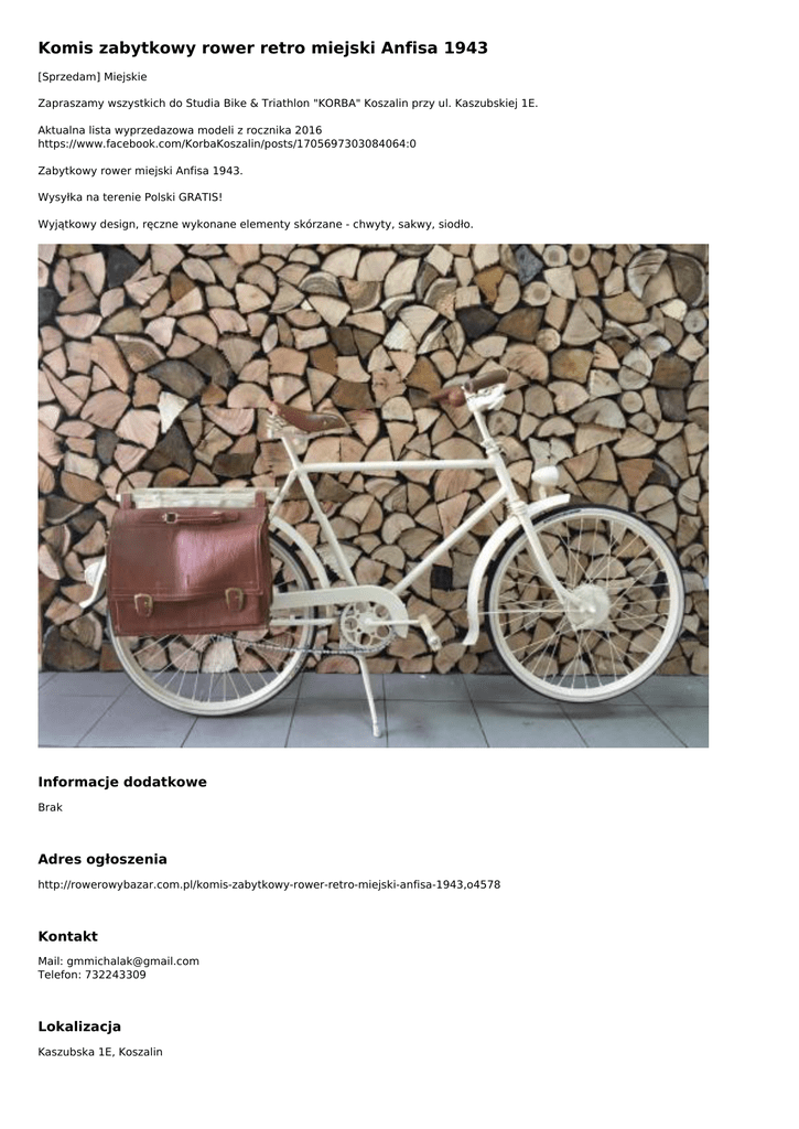 Komis zabytkowy rower retro miejski Anfisa 1943 [Sprzedam] Miejskie Zapraszamy wszystkich do Studia Bike & Triathlon "KORBA" Koszalin przy ul. Kaszubskiej 1E. Aktualna lista wyprzedazowa modeli z rocznika 2016 https://www.facebook.com/KorbaKoszalin/posts/1705697303084064:0 Zabytkowy rower miejski Anfisa 1943. Wysyłka na terenie Polski GRATIS! Wyjątkowy design, ręczne wykonane elementy skórzane - chwyty, sakwy, siodło. Informacje dodatkowe Brak Adres ogłoszenia http://rowerowybazar.com.pl/komis-zabytkowy-rower-retro-miejski-anfisa-1943,o4578 Kontakt Mail: [email protected] Telefon: 732243309 Lokalizacja Kaszubska 1E, Koszalin Zachodniopomorskie () Ogłoszenie dodano: 2016-10-26 09:49:43 Ogłoszenie wygasa: 2017-04-24 09:49:43 Powered by TCPDF (www.tcpdf.org)