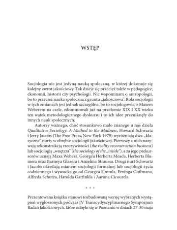 Wstęp Socjologia nie jest jedyną nauką społeczną, w której dokonuje się kolejny zwrot jakościowy. Tak dzieje się przecież także w pedagogice, ekonomii, historii czy psychologii. Nie wspominam o antropologii, bo to przecież nauka społeczna z gruntu „jakościowa”. Rola socjologii w tych zmianach jest jednak szczególna, bo to socjologowie, z Maxem Weberem na czele, zdominowali już na przełomie XIX I XX wieku ten wątek metodologicznego dyskursu i to ich idee przeniknęły do innych nauk społecznych. Autorzy ważnego, choć stosunkowo mało znanego u nas dzieła Qualitative Sociology. A Method to the Madness, Howard Schwartz i Jerry Jacobs (The Free Press, New York 1979) wyróżniają dwa „klasyczne” nurty w obrębie socjologii jakościowej. Pierwszy z nich nazywają rekonstrukcją rzeczywistości (the reality reconstruction business) lub socjologią „wnętrza” (the sociology of the „inside”), a za jego prekursorów uznają Maxa Webera, George’a Herberta Meada, Herberta Blumera oraz Barneya Glasera i Anzelma Straussa. Drugi nurt Schwartz i Jacobs określają mianem socjologii formalnej lub socjologii życia codziennego i wywodzą go od George’a Simmla, Ervinga Goffmana, Alfreda Schutza, Harolda Garfinkla i Aarona Cicourela. *** Prezentowana książka stanowi rozbudowaną wersję wybranych wystąpień wygłoszonych podczas IV Transcydyscyplinarnego Sympozjum Badań Jakościowych, które odbyło się w Poznaniu w dniach 27-30 maja 8 Wstęp 2015 r.1 Trzy pierwsze artykuły były w swoich zasadniczych zrębach wygłoszone jako referaty w języku angielskim podczas inauguracyjnej sesji plenarnej zatytułowanej „Współczynnik humanistyczny jako teoria i metoda badan społecznych”. Pozostałe to artykuły napisane specjalnie do tego tomu przez uczestników dwóch debat panelowych. Pierwszy panel nosił tytuł „Jak uczyć badan jakościowych? Doświadczenia dydaktyków, badaczy, autorów podręczników i wydawców”. Drugi panel zatytułowany był „Jak prezentować wyniki badań jakościowych w nauce, biznesie, administracji publicznej i mediach”. *** Autorzy pierwszej części książki odwołują się do dorobku Floriana Znanieckiego. Jak pisze w otwierającym prezentowany tom artykule Steven Vaitkus, Florian Znaniecki jest nie tylko jednym z ojców założycieli socjologii jako nauki, ale także jednym z twórców socjologii jakościowej2. Artykuł Vaitkusa poświęcony jest rekonstrukcji pojęcia „współczynnik humanistyczny” na trzech poziomach: epistemologiczno-ontologicznym, metodologicznym i praktycznym. Ukazuje specyfikę podejścia Znanieckiego, nawiązującą do słynnego Weberowskiego przykładu „rozumienia” drwala, próbując dokonać alternatywnej jego analizy z perspektywy autora Metody socjologicznej. Drugi z artykułów (przygotowany przez Nadję Messerschmidt) opisuje polską działalność Szczegółowy program tego sympozjum można znaleźć na stronie http://socjologiauam.pl/tsbj/. Więcej o idei tych spotkań badaczy jakościowych oraz o poprzednich i nowszych projektach można przeczytać na stronie http://tsbj.pl/joomla/ transdyscyplinarne-seminarium-badan-jakosciowych-2/iv-tsbj. 2 Ta jego rola nie zawsze jest doceniana. Wspomniani Schwartz i Jacobs naszemu polskiemu klasykowi poświęcają zaledwie dwa zdania w swojej liczącej 458 stron pracy. Dla nich Znaniecki jest po prostu jednych z późnych kontynuatorów socjologii „wnętrza”. Po raz pierwszy wymieniają go jako jednego z przedstawicieli indukcji analitycznej (obok Donalda Cresseya, Alfreda Lindersmitha i Edwina Sutherlanda). Ponownie wspominają go wraz z Williamem I. Thomasem jako jednego z badaczy wykorzystujących metodę biograficzną, obok badającej biografie samobójców Ruth Cavan i zajmującego się biografiami transseksualistów Harolda Garfinkla. Trzeci raz pojawia się w tej pracy Znaniecki dopiero w bibliografii jako współautor Chłopa polskiego w Europie i Ameryce. 1 Wstęp9 badawczą Floriana Znanieckiego i jego ucznia Józefa Chałasińskiego w okresie międzywojennym. Wreszcie trzeci z tekstów (Barbary Wejnert) to próba zastosowania teorii i metody Floriana Znanieckiego do badania obecnej sytuacji imigrantów z Afryki i Azji w amerykańskim mieście Buffalo. Podstawowym materiałem badawczym dla autorki były „dokumenty osobiste” imigrantów i uchodźców, przede wszystkim napisane przez nich opowieści o doświadczeniu migracyjnym. *** Autorzy drugiej części książki, badacze akademiccy i praktycy, podjęli próbę odpowiedzi na pytania postawione przez moderatora obu paneli: – jak uczyć studentów badań jakościowych, biorąc pod uwagę m.in. ograniczone możliwości prowadzenia zajęć dydaktycznych w postaci rozbudowanych badań terenowych? – czy brakuje na polskim rynku wydawniczym – na którym od początku wieku pojawiło się kilkadziesiąt pozycji, zarówno tłumaczeń uznanych zagranicznych podręczników, jak i prac polskich badaczy – jakichś podręczników do nauki badań jakościowych? – jakie wymogi powinien spełniać raport z badań jakościowych w dydaktyce (prace dyplomowe, magisterskie), w praktyce (biznes, sektor publiczny, media itp.), w badaniach naukowych? – jakie są najczęstsze błędy i niedostatki raportów, prezentacji itp. wyników badań jakościowych? Na pytania o nauczanie metod badań jakościowych rozbudowanych odpowiedzi udzieliły trzy osoby: autor podręczników do badań jakościowych w pedagogice (Dariusz Kubinowski), psycholożka, autorka podręczników do metod jakościowych w badaniach marketingowych i badaczka zachowań konsumenckich z bogatym doświadczeniem akademickim i praktycznym (Dominika Maison) oraz socjolożka przeprowadzająca wiele badań terenowych, w tym w tak ekstremalnych warunkach, jak dwuletnia obserwacja uczestnicząca grupy przestępczej (Iwona A. Oliwińska). Do kwestii, jak komunikować wyniki badań jakościowych, odniósł się socjolog akademicki 