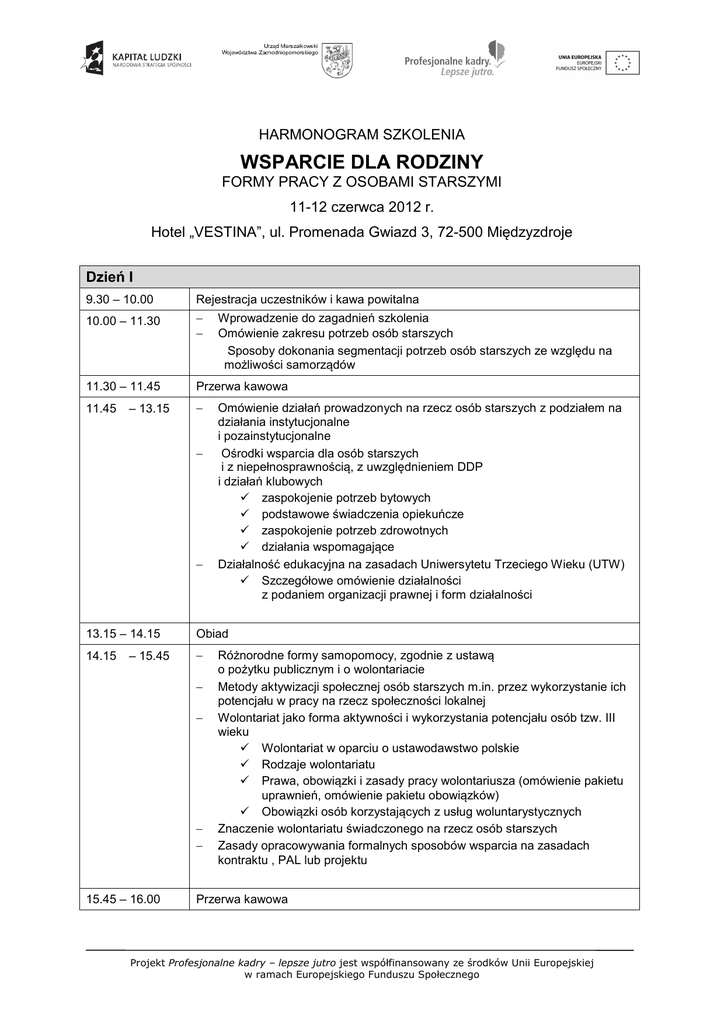 HARMONOGRAM SZKOLENIA WSPARCIE DLA RODZINY FORMY PRACY Z OSOBAMI STARSZYMI 11-12 czerwca 2012 r. Hotel „VESTINA”, ul. Promenada Gwiazd 3, 72-500 Międzyzdroje Dzień I 9.30 – 10.00 Rejestracja uczestników i kawa powitalna 10.00 – 11.30 − − 11.30 – 11.45 Przerwa kawowa 11.45 − – 13.15 − − Wprowadzenie do zagadnień szkolenia Omówienie zakresu potrzeb osób starszych Sposoby dokonania segmentacji potrzeb osób starszych ze względu na możliwości samorządów Omówienie działań prowadzonych na rzecz osób starszych z podziałem na działania instytucjonalne i pozainstytucjonalne Ośrodki wsparcia dla osób starszych i z niepełnosprawnością, z uwzględnieniem DDP i działań klubowych zaspokojenie potrzeb bytowych podstawowe świadczenia opiekuńcze zaspokojenie potrzeb zdrowotnych działania wspomagające Działalność edukacyjna na zasadach Uniwersytetu Trzeciego Wieku (UTW) Szczegółowe omówienie działalności z podaniem organizacji prawnej i form działalności 13.15 – 14.15 Obiad 14.15 − – 15.45 − − − − 15.45 – 16.00 Różnorodne formy samopomocy, zgodnie z ustawą o pożytku publicznym i o wolontariacie Metody aktywizacji społecznej osób starszych m.in. przez wykorzystanie ich potencjału w pracy na rzecz społeczności lokalnej Wolontariat jako forma aktywności i wykorzystania potencjału osób tzw. III wieku Wolontariat w oparciu o ustawodawstwo polskie Rodzaje wolontariatu Prawa, obowiązki i zasady pracy wolontariusza (omówienie pakietu uprawnień, omówienie pakietu obowiązków) Obowiązki osób korzystających z usług woluntarystycznych Znaczenie wolontariatu świadczonego na rzecz osób starszych Zasady opracowywania formalnych sposobów wsparcia na zasadach kontraktu , PAL lub projektu Przerwa kawowa Projekt Profesjonalne kadry – lepsze jutro jest współfinansowany ze środków Unii Europejskiej w ramach Europejskiego Funduszu Społecznego 16.00 – 17.30 − − − − 18.00 Kolacja Świadczenie interdyscyplinarnych form pracy socjalnej, Usługi psychologiczne i poradnictwo Omówienie i podanie źródeł finansowania poszczególnych działań Medialna promocja podejmowanych działań Dzień II 8.30 – 09.00 9.00 – 10.30 Śniadanie − − Warsztaty: Opracowanie w grupach samorządowego projektu wsparcia dla seniorów przy uwzględnieniu działań instytucjonalnych, środowiskowych jak również samopomocowych Przeprowadzenie diagnozy i identyfikacji potrzeb seniorów - diagnozowanie zasobów i deficytów samorządu Omówienie opracowanych materiałów 10.30 – 11.00 Przerwa kawowa 11.00 – 12.30 − − − − 12.30 Opracowane celów krótko i długoterminowych Opracowanie harmonogramu działań z uwzględnieniem infrastruktury/ współpraca z instytucjami i organizacjami pozarządowymi w zakresie udzielanego wsparcia, adekwatnego do potrzeb: wsparcie instytucjonalne i opiekuńcze, w tym wolontariat działania aktywizacyjne (ustawiczna edukacja seniorów, wolontariat, działania klubowe) świadczenie interdyscyplinarnych form pracy socjalnej Omówienie opracowanych materiałów Dyskusja – zakończenie i ewaluacja szkolenia Obiad i zakończenie szkolenia Projekt Profesjonalne kadry – lepsze jutro jest współfinansowany ze środków Unii Europejskiej w ramach Europejskiego Funduszu Społecznego