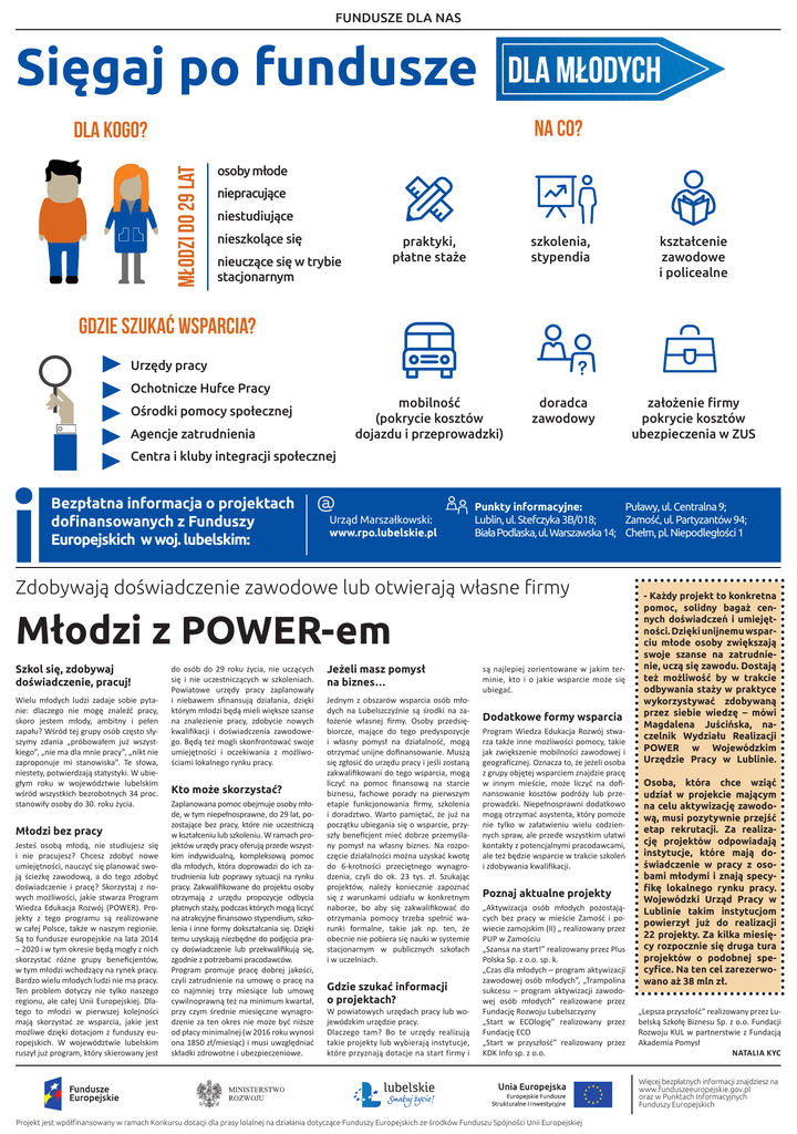 FUNDUSZE DLA NAS Sięgaj po fundusze NA CO? Młodzi do 29 lat Dla kogo? osoby młode niepracujące niestudiujące nieszkolące się praktyki, płatne staże szkolenia, stypendia kształcenie zawodowe i policealne mobilność (pokrycie kosztów dojazdu i przeprowadzki) doradca zawodowy założenie firmy pokrycie kosztów ubezpieczenia w ZUS nieuczące się w trybie stacjonarnym Gdzie szukać wsparcia? Urzędy pracy Ochotnicze Hufce Pracy Ośrodki pomocy społecznej Agencje zatrudnienia Centra i kluby integracji społecznej Bezpłatna informacja o projektach dofinansowanych z Funduszy Europejskich w woj. lubelskim: Urząd Marszałkowski: www.rpo.lubelskie.pl Punkty informacyjne: Puławy, ul. Centralna 9; Lublin, ul. Stefczyka 3B/018; Zamość, ul. Partyzantów 94; Biała Podlaska, ul. Warszawska 14; Chełm, pl. Niepodległości 1 Zdobywają doświadczenie zawodowe lub otwierają własne firmy Młodzi z POWER-em Szkol się, zdobywaj doświadczenie, pracuj! Wielu młodych ludzi zadaje sobie pytanie: dlaczego nie mogę znaleźć pracy, skoro jestem młody, ambitny i pełen zapału? Wśród tej grupy osób często słyszymy zdania „próbowałem już wszystkiego”, „nie ma dla mnie pracy”, „nikt nie zaproponuje mi stanowiska”. Te słowa, niestety, potwierdzają statystyki. W ubiegłym roku w województwie lubelskim wśród wszystkich bezrobotnych 34 proc. stanowiły osoby do 30. roku życia. Młodzi bez pracy Jesteś osobą młodą, nie studiujesz się i nie pracujesz? Chcesz zdobyć nowe umiejętności, nauczyć się planować swoją ścieżkę zawodową, a do tego zdobyć doświadczenie i pracę? Skorzystaj z nowych możliwości, jakie stwarza Program Wiedza Edukacja Rozwój (POWER). Projekty z tego programu są realizowane w całej Polsce, także w naszym regionie. Są to fundusze europejskie na lata 2014 – 2020 i w tym okresie będą mogły z nich skorzystać różne grupy beneficjentów, w tym młodzi wchodzący na rynek pracy. Bardzo wielu młodych ludzi nie ma pracy. Ten problem dotyczy nie tylko naszego regionu, ale całej Unii Europejskiej. Dlatego to młodzi w pierwszej kolejności mają skorzystać ze wsparcia, jakie jest możliwe dzięki dotacjom z funduszy europejskich. W województwie lubelskim ruszył już program, który skierowany jest do osób do 29 roku życia, nie uczących się i nie uczestniczących w szkoleniach. Powiatowe urzędy pracy zaplanowały i niebawem sfinansują działania, dzięki którym młodzi będą mieli większe szanse na znalezienie pracy, zdobycie nowych kwalifikacji i doświadczenia zawodowego. Będą też mogli skonfrontować swoje umiejętności i oczekiwania z możliwościami lokalnego rynku pracy. Kto może skorzystać? Zaplanowana pomoc obejmuje osoby młode, w tym niepełnosprawne, do 29 lat, pozostające bez pracy, które nie uczestniczą w kształceniu lub szkoleniu. W ramach projektów urzędy pracy oferują przede wszystkim indywidualną, kompleksową pomoc dla młodych, która doprowadzi do ich zatrudnienia lub poprawy sytuacji na rynku pracy. Zakwalifikowane do projektu osoby otrzymają z urzędu propozycje odbycia płatnych staży, podczas których mogą liczyć na atrakcyjne finansowo stypendium, szkolenia i inne formy dokształcania się. Dzięki temu uzyskają niezbędne do podjęcia pracy doświadczenie lub przekwalifikują się, zgodnie z potrzebami pracodawców. Program promuje pracę dobrej jakości, czyli zatrudnienie na umowę o pracę na co najmniej trzy miesiące lub umowę cywilnoprawną też na minimum kwartał, przy czym średnie miesięczne wynagrodzenie za ten okres nie może być niższe od płacy minimalnej (w 2016 roku wynosi ona 1850 zł/miesiąc) i musi uwzględniać składki zdrowotne i ubezpieczeniowe. Jeżeli masz pomysł na biznes… Jednym z obszarów wsparcia osób młodych na Lubelszczyźnie są środki na założenie własnej firmy. Osoby przedsiębiorcze, mające do tego predyspozycje i własny pomysł na działalność, mogą otrzymać unijne dofinansowanie. Muszą się zgłosić do urzędu pracy i jeśli zostaną zakwalifikowani do tego wsparcia, mogą liczyć na pomoc finansową na starcie biznesu, fachowe porady na pierwszym etapie funkcjonowania firmy, szkolenia i doradztwo. Warto pamiętać, że już na początku ubiegania się o wsparcie, przyszły beneficjent mieć dobrze przemyślany pomysł na własny biznes. Na rozpoczęcie działalności można uzyskać kwotę do 6-krotności przeciętnego wynagrodzenia, czyli do ok. 23 tys. zł. Szukając projektów, należy koniecznie zapoznać się z warunkami udziału w konkretnym naborze, bo aby się zakwalifikować do otrzymania pomocy trzeba spełnić warunki formalne, takie jak np. ten, że obecnie nie pobiera się nauki w systemie stacjonarnym w publicznych szkołach i w uczelniach. Gdzie szukać informacji o projektach? W powiatowych urzędach pracy lub wojewódzkim urzędzie pracy. Dlaczego tam? Bo te urzędy realizują takie projekty lub wybierają instytucje, które przyznają dotacje na start firmy i są najlepiej zorientowane w jakim terminie, kto i o jakie wsparcie może się ubiegać. Dodatkowe formy wsparcia Program Wiedza Edukacja Rozwój stwarza także inne możliwości pomocy, takie jak zwiększenie mobilności zawodowej i geograficznej. Oznacza to, że jeżeli osoba z grupy objętej wsparciem znajdzie pracę w innym mieście, może liczyć na dofinansowanie kosztów podróży lub przeprowadzki. Niepełnosprawni dodatkowo mogą otrzymać asystenta, który pomoże nie tylko w załatwieniu wielu codziennych spraw, ale przede wszystkim ułatwi kontakty z potencjalnymi pracodawcami, ale też będzie wsparcie w trakcie szkoleń i zdobywania kwalifikacji. Poznaj aktualne projekty „Aktywizacja osób młodych pozostających bez pracy w mieście Zamość i powiecie zamojskim (II) „ realizowany przez PUP w Zamościu „Szansa na start!” realizowany przez Plus Polska Sp. z o.o. sp. k. „Czas dla młodych – program aktywizacji zawodow