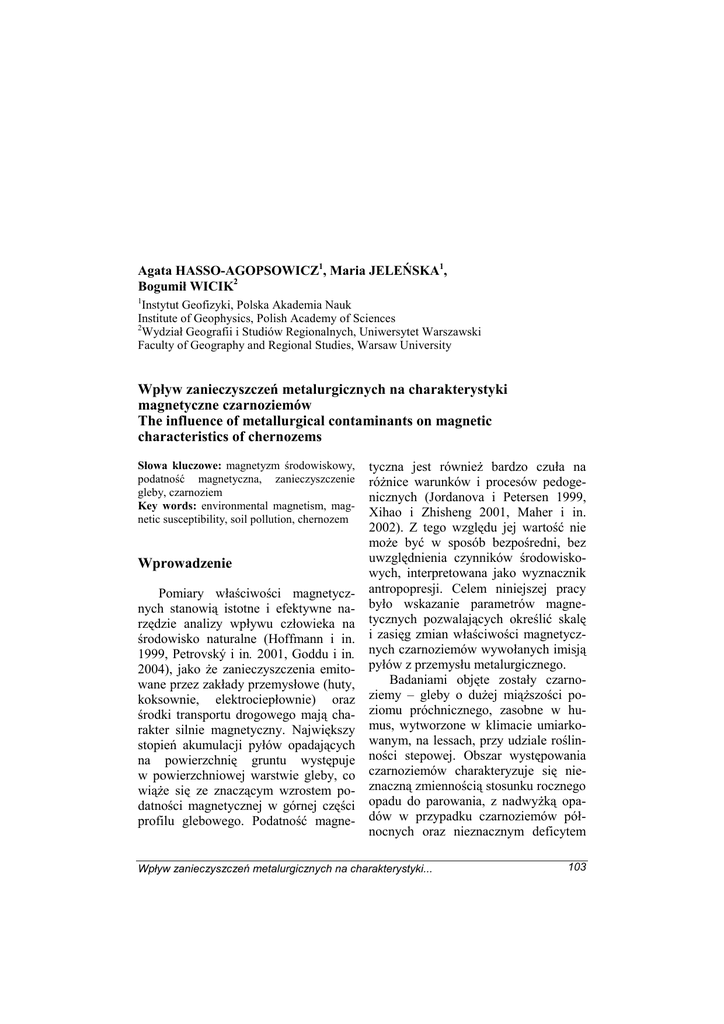 Agata HASSO-AGOPSOWICZ1, Maria JELEŃSKA1, Bogumił WICIK2 1 Instytut Geofizyki, Polska Akademia Nauk Institute of Geophysics, Polish Academy of Sciences 2 Wydział Geografii i Studiów Regionalnych, Uniwersytet Warszawski Faculty of Geography and Regional Studies, Warsaw University Wpływ zanieczyszczeń metalurgicznych na charakterystyki magnetyczne czarnoziemów The influence of metallurgical contaminants on magnetic characteristics of chernozems Słowa kluczowe: magnetyzm środowiskowy, podatność magnetyczna, zanieczyszczenie gleby, czarnoziem Key words: environmental magnetism, magnetic susceptibility, soil pollution, chernozem Wprowadzenie Pomiary właściwości magnetycznych stanowią istotne i efektywne narzędzie analizy wpływu człowieka na środowisko naturalne (Hoffmann i in. 1999, Petrovský i in. 2001, Goddu i in. 2004), jako Ŝe zanieczyszczenia emitowane przez zakłady przemysłowe (huty, koksownie, elektrociepłownie) oraz środki transportu drogowego mają charakter silnie magnetyczny. Największy stopień akumulacji pyłów opadających na powierzchnię gruntu występuje w powierzchniowej warstwie gleby, co wiąŜe się ze znaczącym wzrostem podatności magnetycznej w górnej części profilu glebowego. Podatność magne- tyczna jest równieŜ bardzo czuła na róŜnice warunków i procesów pedogenicznych (Jordanova i Petersen 1999, Xihao i Zhisheng 2001, Maher i in. 2002). Z tego względu jej wartość nie moŜe być w sposób bezpośredni, bez uwzględnienia czynników środowiskowych, interpretowana jako wyznacznik antropopresji. Celem niniejszej pracy było wskazanie parametrów magnetycznych pozwalających określić skalę i zasięg zmian właściwości magnetycznych czarnoziemów wywołanych imisją pyłów z przemysłu metalurgicznego. Badaniami objęte zostały czarnoziemy – gleby o duŜej miąŜszości poziomu próchnicznego, zasobne w humus, wytworzone w klimacie umiarkowanym, na lessach, przy udziale roślinności stepowej. Obszar występowania czarnoziemów charakteryzuje się nieznaczną zmiennością stosunku rocznego opadu do parowania, z nadwyŜką opadów w przypadku czarnoziemów północnych oraz nieznacznym deficytem Wpływ zanieczyszczeń metalurgicznych na charakterystyki... 103 wilgoci na południu. Porównanie wartości i rozkładów parametrów magnetycznych w profilach niezanieczyszczonych z centralnej Polski (Młodzawy k. Pińczowa) oraz południowo-wschodniej Ukrainy pozwala określić wpływ warunków klimatycznych na przebieg procesów pedogenicznych. Z kolei porównanie charakterystyk magnetycznych czarnoziemów zanieczyszczonych z czarnoziemami wykształconymi w sposób naturalny w tej samej strefie klimatycznej pozwala wyodrębnić parametry magnetyczne, w najlepszy sposób opisujące efekt przekształceń antropogenicznych. cowego i ostnicowo-kostrzewowego nieprzekształcaną od ponad 120 lat, zawiera węglany wapnia juŜ od głębokości 40 cm. Intensywna działalność drobnej fauny glebowej wpłynęła na przenikanie próchnicy na znaczne głębokości. Profil M1 z przedmieść Mariupola (ośrodka przemysłowego przetwórstwa rudy Ŝelaza) reprezentuje glebę silnie zanieczyszczoną. Obecność węglanów zaznacza się poniŜej 80 cm. Do badań parametrów magnetycznych profile opróbowane zostały co 10 cm do głębokości: MD – 140 cm, K10 – 170 cm, H1 – 190 cm. W przypadku profilu M1 próby odebrano z głębokości 0–10 cm, 30–40 cm, 60–70 cm, 70–110 cm i 120–130 cm. Obszar i materiał badawczy Metody i pomiary Badania przeprowadzone zostały na dwóch profilach czarnoziemów północnych. Profil MD, pobrany w Młodzawach na terenie Zespołu Parków Krajobrazowych Ponidzia z miedzy pokrytej wieloletnią roślinnością trawiastą, jest przykładem czarnoziemu niezdegradowanego, płytkiego, o miąŜszości poziomu próchnicznego ok. 40 cm. Węglany wapnia występują poniŜej 70 cm. Drugi profil K10, pobrany w sąsiedztwie Nowej Huty k. Krakowa z gleby ornej, jest przykładem czarnoziemu zdegradowanego. PoniŜej poziomu próchnicznego o miąŜszości 50 cm zaznaczyły się procesy iluwialne. Węglany wapnia obecne są dopiero poniŜej 140 cm. Polskie profile porównane zostały z czarnoziemami południowymi, dla których wyniki zostały częściowo opublikowane (Jeleńska i in. 2004). Profil H1 z Rezerwatu Homutovski Step, pokryty roślinnością stepu ostni- Pomiary parametrów magnetycznych, za wyjątkiem zmian podatności w niskiej temperaturze κ(T), wykonane zostały dla wszystkich prób. Pomiary podatności magnetycznej w niskim polu, przypadającej na jednostkę masy χ, wykonano na AGICO Kappabridge KLY-2 (Brno, Czechy). Parametry histerezy (maksymalną pozostałość magnetyczną SIRM i koercję pozostałości Hcr) dla małych prób zmierzono w polu magnetycznym do 1T przy uŜyciu Molspin Vibrating Sample Magnetometer (VSM). Bezhisterezową pozostałość magnetyczną ARM nałoŜono na próbę umieszczoną w polu zmiennym malejącym od 100 mT, przy jednoczesnym działaniu stałego pola magnetycznego 100 µT, wykorzystując LDA-3 AF Demagnetiser i AMU-1 Anhysteretic Magnetiser, a następnie mierzono na AGI- 104 A. Hasso-Agopsowicz, M. Jeleńska, B. Wicik CO JR-4 Spinner Magnetometer. Rozmagnesowanie termiczne maksymalnej pozostałości magnetycznej SIRM(T), nałoŜonej w wysokim polu (4–7 T) w MMPM10, podczas grzania do temperatury 700oC, mierzono z wykorzystaniem urządzenia wykonanego przez TUS-Warszawa. Zmiany całkowitej objętościowej podatności magnetycznej w niskim polu κ(T), w niskiej temperaturze (od –196oC do temperatury pokojowej) zmierzono dla prób z powierzchni gleby i poziomu lessu kaŜdego z profili przy uŜyciu KLY-3 Kappabridge z przyłączonym piecem CS-3, AGICO. W wybranych próbach w glebie powietrznie suchej określono: zawartość węgla organicznego (Corg) – metodą Tiurina poprzez utlenianie z dwuchromianem potasu, Ŝelazo (Fe) – jodometrycznie w próbach wypraŜo