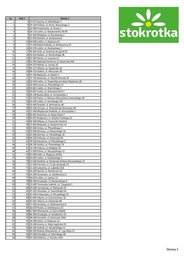 Lp Kod 1 1 2 3 4 5 6 7 8 9 10 11 12 13 14 15 16 17 18 19 20 21 22 23 24 25 26 27 28 29 30 31 32 33 34 35 36 37 38 39 40 41 42 43 44 45 46 47 48 49 50 51 52 53 54 55 56 57 58 59 60 61 62 63 64 65 66 2 4 5 6 7 8 10 11 16 17 18 19 24 25 27 28 30 31 32 33 34 35 36 37 38 39 40 42 43 44 45 48 50 53 56 58 61 62 63 64 65 66 70 71 73 75 76 77 78 79 80 82 83 84 85 86 87 88 90 91 92 93 94 95 96 97 Nazwa 1 21-017 Łęczna, ul. Wierzbowa 7 24-100 Puławy, ul. Grota Roweckiego 2 22-500 Hrubieszów, ul. Prosta 1 20-114 Lublin, ul. Bazylianówka 58-60 22-200 Włodawa, ul. Korolowska 2 21-040 Świdnik, ul. Racławicka 9 20-560 Lublin, ul. Wyżynna 41 17-100 Bielsk Podlaski, ul. Mickiewicza 47 20-576 Lublin, ul. Ametystowa 1 90-426 Łódź, ul. Andrzeja Struga 8/10 26-610 Radom, ul. Żeromskiego 96 41-902 Bytom, ul. Łużycka 12 41-303 Dąbrowa Górnicza, ul. Kasprzaka 44A 44-253 Rybnik, ul. Lompy 10 44-117 Gliwice, ul. Kopernika 16 08-110 Siedlce, ul. Młynarska 26 15-349 Białystok, ul. Dubois 2 15-756 Białystok, ul. Wysoki Stoczek 54 20-319 Lublin, ul. Droga Męczenników Majdanka 28 18-400 Łomża, ul. Piłsudskiego 14 20-861 Lublin, ul. Śliwińskiego 1 20-853 Lublin, ul. Żelazowej Woli 1 28-100 Busko Zdrój, ul. Partyzantów 1 25-430 Kielce, ul. Biskupa Mieczysława Jaworskiego 28 20-459 Lublin, ul. Kunickiego 141 16-400 Suwałki, ul. Noniewicza 46 33-100 Tarnów, ul. Powstańców Warszawy 40 21-560 Międzyrzec Podlaski, ul. Warszawska 1 26-901 Kozienice, ul. Nowy Świat 7 85-825 Bydgoszcz, ul. Wojska Polskiego 23 06-500 Mława, ul. Franciszka Żwirki 6 15-863 Białystok, ul. Radzymińska 14 05-600 Grójec, ul. Piłsudskiego 2 35-060 Rzeszów, ul. Słowackiego 16 22-400 Zamość, ul. Piłsudskiego 16 28-230 Połaniec, ul. Kościuszki 45 78-520 Złocieniec, ul. Piłsudskiego 2 08-100 Siedlce, ul. Piłsudskiego 74 24-100 Puławy, ul. Kołłątaja 18 72-009 Police, ul. Wyszyńskiego 13 91-083 Łódź, ul. Długosza 34/36 20-045 Lublin, ul. Godebskiego 1 21-040 Świdnik, ul. Kardynała Stefana Wyszyńskiego 17 21-200 Parczew, ul. 11-go Listopada 13 21-100 Lubartów, ul. Lubelska 56A 44-200 Rybnik, ul. Raciborska 16 41-200 Sosnowiec, ul. Sienkiewicza 2 20-020 Lublin, ul. Lipowa 13 86-300 Grudziądz, ul. Skarżyńskiego 6 22-600 Tomaszów Lubelski, ul. Traugutta 1 39-400 Tarnobrzeg, ul. Moniuszki 19 07-202 Wyszków, ul. Sowińskiego 64 22-500 Hrubieszów, ul. Piłsudskiego 55 81-085 Gdynia, ul. Czeremchowa 10 81-041 Gdynia, ul. Chylońska 89 37-500 Jarosław, ul. Elektrowniana 4 26-670 Pionki, ul. Sienkiewicza 53 87-800 Włocławek, ul. Żytnia 66/68 86-300 Grudziądz, ul. Śniadeckich 25 08-400 Garwolin, ul. Kościuszki 49M 18-500 Kolno, ul. Kolejowa 1A 18-400 Łomża, ul. Aleja Legionów 54 06-100 Pułtusk, ul. Daszyńskiego 11 06-200 Maków Mazowiecki, ul. 1-go Maja 12 07-400 Ostrołęka, ul. Sikorskiego 39 07-320 Małkinia, ul. Nurska 142A Strona 1 Lp 67 68 69 70 71 72 73 74 75 76 77 78 79 80 81 82 83 84 85 86 87 88 89 90 91 92 93 94 95 96 97 98 99 100 101 102 103 104 105 106 107 108 109 110 111 112 113 114 115 116 117 118 119 120 121 122 123 124 125 126 127 128 129 130 131 132 Kod 1 98 100 101 102 103 104 106 107 108 109 110 111 112 113 114 115 116 117 118 121 122 123 124 129 130 131 132 134 135 136 137 140 142 143 144 145 146 148 149 150 152 163 165 166 168 169 170 173 174 176 177 179 180 181 182 183 184 185 187 188 189 190 191 193 194 195 Nazwa 1 07-400 Ostrołęka, ul. Inwalidów Wojennych 32/2 06-300 Przasnysz, ul. Orlika 18 10-687 Olsztyn, ul. Wilczyńskiego 8 07-300 Ostrów Mazowiecka, ul. Kościuszki 24 88-200 Radziejów, ul. Objezdna 31 95-040 Koluszki, ul. Kościuszki 2 87-800 Włocławek, ul. Kaliska 87A 27-200 Starachowice, ul. Armii Krajowej 3 16-300 Augustów, ul. Kopernika 4 71-126 Szczecin, ul. 26-go Kwietnia 2 71-296 Szczecin, ul. Generała Kutrzeby 8A 72-600 Świnoujście, ul. Generała Bema 2 71-474 Szczecin, ul. Tatrzańska 3 72-600 Świnoujście, ul. Matejki 34 71-627 Szczecin, ul. 1-go Maja 43 66-406 Gorzów, ul. Wróblewskiego 30 75-452 Koszalin, ul. Jana Pawła II 4 71-685 Szczecin, ul. Bandurskiego 90 71-520 Szczecin, ul. Niemcewicza 26 78-600 Wałcz, ul. Kilińszczaków 43 61-245 Poznań, ul. Os. Rusa 58 78-100 Kołobrzeg, ul. Złota 17 Szczecin, Niepodległości 18/22 15-349 Białystok, ul. Paderewskiego 10 15-558 Białystok, ul. Pozioma 2 15-811 Białystok, ul. Leszczynowa 31 15-662 Białystok, ul. Stroma 26 27-600 Sandomierz, ul. Mickiewicza 32 11-400 Kętrzyn, ul. Sikorskiego 34A 91-104 Łódź, ul. Plantowa 1 26-604 Radom, ul. Al. Józefa Grzecznarowskiego 17 22-100 Chełm, ul. Wolności 3 28-300 Jędrzejów, ul. Chrobrego 8 03-352 Warszawa, ul. Rembielińska 20 13-100 Nidzica, ul. Traugutta 18 20-819 Lublin, ul. Tarasowa 1 76-200 Słupsk, ul. Tuwima 32-33 21-500 Biała Podlaska, ul. Brzeska 27 14-100 Ostróda, ul. Stefana Jaracza 21 14-100 Ostróda, ul. Stefana Czarnieckiego 47 44-190 Knurów, ul. Staszica 2 37-450 Stalowa Wola, ul. Jana Pawła II 18F 33-103 Tarnów, ul. Nowodąbrowska 116 80-180 Gdańsk, ul. Piotrkowska 25 13-200 Działdowo, ul. Malewskiej 4 07-409 Ostrołęka, ul. Sienkiewicza 55 07-440 Goworowo, ul. Rynek 4 36-100 Kolbuszowa, ul. Rzeszowska 6 30-658 Kraków, ul. Łużycka 55 44-335 Jastrzębie Zdrój, ul. Warszawska 2 87-100 Toruń, ul. Lelewela 33 14-200 Iława, ul. Kopernika 10 28-500 Kazimierza Wielka, ul. Partyzantów 30 82-500 Kwidzyn, ul. Kamienna 13 21-010 Łęczna, ul. Polna 1 21-010 Łęczna, ul. Jana Pawła II 99 97-500 Radomsko, ul. Aleje Jana Pawła II 4 81-587 Gdynia, ul. Korzenna 17 30-664 Kraków, ul. Na Kozłówce 10 16-100 Sokółka, ul. Grodzieńska 9 81-577 Gdynia, ul. Nowowiczlińska 115 05-660 Warka, ul. Puławska 4 11-600 Węgorzewo, ul. Armii Krajowej 4 08-110 Siedlce, ul. 11-go Listopada 43D 38-500 Sanok, ul. Traugutta 9 50-518 Wrocław, ul. Wapienna 35 Strona 2 Lp 133 134 135 136 137 138 139 140 141 142 143 144 145 146 147 148 149 150 151 152 153 154 155 156 157 158 159 160 161 162 163 164 165 166 167 168 169 170 171 172 17