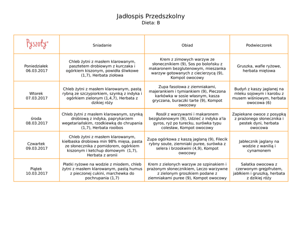 Jadłospis Przedszkolny Dieta: B Sniadanie Obiad Podwieczorek Poniedziałek 06.03.2017 Chleb żytni z masłem klarowanym, pasztetem drobiowym z kurczaka i ogórkiem kiszonym, powidła śliwkowe (1,7), Herbata ziołowa Krem z zimowych warzyw ze słonecznikiem (9), Sos po bolońsku z makaronem bezglutenowym, mieszanka warzyw gotowanych z ciecierzycą (9), Kompot owocowy Gruszka, wafle ryżowe, herbata miętowa Wtorek 07.03.2017 Chleb żytni z masłem klarowanym, pastą rybną ze szczypiorkiem, szynką z indyka i ogórkiem zielonym (1,4,7), Herbata z dzikiej róży Zupa fasolowa z ziemniakami, majerankiem i tymiankiem (9), Pieczona karkówka w sosie własnym, kasza gryczana, buraczki tarte (9), Kompot owocowy Budyń z kaszy jaglanej na mleku sojowym i karobu z musem wiśniowym, herbata owocowa (6) środa 08.03.2017 Chleb żytni z masłem klarowanym, szynką drobiową z indyka, paprykarzem wegetariańskim, rzodkiewką do chrupania (1,7), Herbata rooibos Rosół z warzywami i makaronem bezglutenowym (9), Udzieć z indyka a'la gyros, ryż po turecku, surówka typu colesław, Kompot owocowy Zapiekane owoce z posypką z prażonego słonecznika i pestek dyni, herbata owocowa Czwartek 09.03.2017 Chleb żytni z masłem klarowanym, kiełbaska drobiowa min 98% mięsa, pasta ze słonecznika z pomidorem, ogórkiem kiszonym i ketchup domowym (1,7), Herbata z aronii Zupa ogórkowa z kaszą jaglaną (9), Filecik rybny soute, ziemniaki puree, surówka z selera i brzoskwini (4,9), Kompot owocowy Jabłecznik jaglany na wodzie z wanilią i cynamonem Piątek 10.03.2017 Płatki ryżowe na wodzie z miodem, chleb żytni z masłem klarowanym, pastą humus z pieczonej cukini, marchewka do pochrupania (1,7) Krem z zielonych warzyw ze szpinakiem i prażonym słonecznikiem, Leczo warzywne z zielonym groszkiem podane z ziemniakami puree (9), Kompot owocowy Sałatka owocowa z czerwonym grejpfrutem, jabłkiem i gruszką, herbata z dzikiej róży