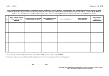 OG-231-P-01/2014 Załacznik nr 4 do SIWZ Wykaz wykonanych należycie w okresie trzech lat przed dniem wszcięcia postapowania o udzielnie zamówienia publicznego, a jeśli okres prowadzenia działalności jest krótszy w tym okresie, dwóch dostaw druków dla sądów powszechnych, sądów administracyjnych, sądów wojskowych, Sądu Najwyższego lub jednostek prokuratury, każda na kwotę, co najmniej 50.000,00 zł brutto, z podaniem ich wartości, przedmiotu, dat wykonania, podmiotów, na rzecz których dostawy zostaly wykonane oraz załączeniem dowodów, czy zostały wykonane należycie. Lp. Nazwa podmiotu na rzecz którego dostawy zostały wykonane Adres podmiotu na rzecz którego dostawy zostały wykonane Wartość dostawy (minimum 50.000 zł brutto) Termin realizacji dostawy. Rodzaj dokumentu potwierdzajacego Data wystawienia dokumentu potwierdzającego 1 2 3 1. Do wykazu należy dołączyć dowody potwierdzające, że ww. dostawy zostały wykonane należycie, zgodnie z SIWZ 2. Wykaz winien obejmować, co najmniej 3 pozycje. W przypadku zaistnienia takiej potrzeby wiersze należy odpowiednio powielić …………………………………., dnia ………………….. 2014 r. ……………………………………………………… Podpis osoby (osób) upoważnionej do występowania w imieniu Wykonawcy ( Pożądany czytelny podpis albo podpis i pieczątka z imieniem i nazwiskiem ).