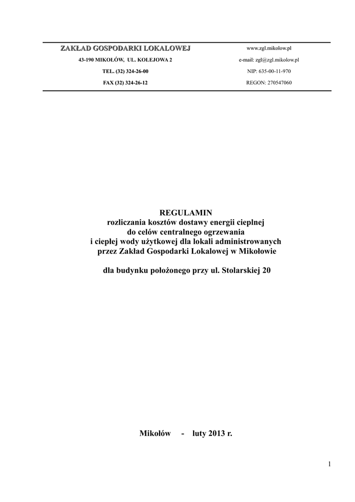 ZAKŁAD GOSPODARKI LOKALOWEJ www.zgl.mikolow.pl 43-190 MIKOŁÓW, UL. KOLEJOWA 2 e-mail: [email protected] zgl TEL. (32) 324-26-00 NIP: 635-00-11-970 FAX (32) 324-26-12 REGON: 270547060 REGULAMIN rozliczania kosztów dostawy energii cieplnej do celów centralnego ogrzewania i ciepłej wody użytkowej dla lokali administrowanych przez Zakład Gospodarki Lokalowej w Mikołowie dla budynku położonego przy ul. Stolarskiej 20 Mikołów - luty 2013 r. 1 § 1. Postanowienia ogólne 1. Postanowienia niniejszego regulaminu mają zastosowanie do rozliczania kosztów dostawy energii cieplnej do celów centralnego ogrzewania użytkowników lokali mieszkalnych, użytkowych i pozostałych pomieszczeń znajdujących się w budynkach administrowanych przez Zakład Gospodarki Lokalowej w Mikołowie, wyposażonych w instalację centralnego ogrzewania oraz centralnej ciepłej wody do budynku położonego przy ul Stolarskiej 20. 2. Decyzję o rozpoczęciu i zakończeniu sezonu grzewczego podejmuje Kierownik Zakładu Gospodarki Lokalowej w Mikołowie w porozumieniu z Burmistrzem Miasta. 3. Podstawy prawne: 1. Ustawa Prawo energetyczne z dnia 10 kwietnia 1997 roku (Dz. U. nr 54 poz.348 z późn. zm.) 2. Ustawa z dnia 23 kwietnia 1964 r. Kodeks cywilny (Dz. U. Nr 16/64 poz. 93 z późn. zm.) 3. Ustawa z 24 czerwca 1994 r. o własności lokali (Dz. U. Nr 80/00 poz. 903 z późn. zm.) 4. Ustawa z dnia 21 czerwca 2001 r. o ochronie praw lokatorów, mieszkaniowym zasobie gminy i o zmianie Kodeksu cywilnego (Dz. U. Nr 31/05 poz. 266 z późn. zm.). 5. Rozporządzenie Ministra Gospodarki z dnia 12 października 2000 r. w sprawie szczegółowych zasad kształtowania i kalkulacji taryf oraz zasad rozliczeń w obrocie ciepłem (Dz. U. Nr 96 poz.1053). 6. Rozporządzenie Ministra Gospodarki z dnia 11 sierpnia 2000 r. w sprawie szczegółowych warunków przyłączenia podmiotów do sieci ciepłowniczych obrotu ciepłem świadczenia usług przesyłowych, ruchu sieciowego i eksploatacji sieci oraz standardów jakościowych obsługi odbiorców Dz. U. Nr 72 poz.845 ). 7. Taryfy cen i stawek opłat zatwierdzone przez Urząd Regulacji Energetyki. 8. Umowy zawarte przez ZGL z dostawcami ciepła. 9. PN 70(B-02365) 10. Zarządzenie Nr 13 Prezesa GUS (Dz. U. GUS Nr 6 z 2.04.1990 r.) 4. Podstawowe pojęcia: Powierzchnia ogrzewana – Za powierzchnię ogrzewaną uważa się powierzchnię użytkową lokalu mieszkalnego lub użytkowego ustalaną zgodnie z PN 70(B-02365) oraz Zarządzeniem Nr 13 Prezesa GUS (Dz. U. GUS Nr 6 z 2.04.1990 r.) Pomieszczenia które nie posiadają grzejników a wchodzą w skład lokali mieszkalnych lub użytkowych (przedpokój WC, korytarz itp.) ogrzewane pośrednio ciepłem sąsiednich pomieszczeń traktuje się jako powierzchnię ogrzewaną. Nie wlicza się do powierzchni ogrzewanej centralnie balkonów, loggii, tarasów, antresoli. Nieruchomość - należy przez to rozumieć budynek lub zespół budynków rozliczanych w oparciu o wskazania tego samego gazomierza, w których znajdują się lokale mieszkalne, użytkowe lub pomieszczenia. ZGL - należy przez to rozumieć Zakład Gospodarki Lokalowej w Mikołowie, którego przedstawiciel zawarł umowę z dostawcą gazu. 2 Użytkownik - należy przez to rozumieć najemcę, właściciela lub osobę zajmującą lokal mieszkalny, użytkowy lub pomieszczenie na podstawie innego tytułu prawnego, bądź bez tytułu prawnego. § 2. Określenie kosztów dostawy ciepła 1. Koszt dostawy ciepła stanowi suma kosztów zakupu przez ZGL gazu dostarczanego do nieruchomości w okresie rozliczeniowym. 2. Koszty zakupu gazu do celów centralnego ogrzewania i podgrzania ciepłej wody użytkowej rozliczane są z ZGL przez dostawcę w oparciu o stawki taryfowe zatwierdzone przez Urząd Regulacji Energetyki. 3. Koszty zakupu gazu dla danej nieruchomości dzielą się na stałe i zmienne. 4. Do kosztów stałych zalicza się: - opłatę abonamentową − opłatę sieciową stałą 5. Do kosztów zmiennych zalicza się: 1. opłatę za paliwo gazowe (za m³ gazu) 2. opłatę sieciową zmienną (za m³ gazu) 6. Wysokość kosztów zakupu gazu jest sumą obciążeń kosztów stałych i zmiennych wynikających z faktur za gaz w okresie rozliczeniowym dla danej nieruchomości. 7. Standardy jakościowe obsługi odbiorców oraz sposób fakturowania określa umowa zawarta pomiędzy dostawcą a odbiorcą gazu. § 3. 1. Zasady ogólne rozliczania kosztów zakupu gazu na potrzeby centralnego ogrzewania i centralnej ciepłej wody zasilanego paliwem gazowym przez ZGL na rzecz użytkowników lokali 1. Koszty zakupu gazu na potrzeby centralnego ogrzewania i centralnej ciepłej wody dla budynku pokrywane są przez wszystkich użytkowników lokali w danym budynku. 2. Rozliczenie kosztu zakupu gazu na potrzeby centralnego ogrzewania dla użytkowników dokonywane jest raz w ciągu 12 miesięcy. 3. Rozliczenie kosztu zakupu gazu na potrzeby centralnej ciepłej wody dokonywane jest dwa razy w ciągu 12 miesięcy. 4. Całkowity koszt do rozliczenia ciepła obejmuje koszt określony fakturami dostawcy gazu za dany okres rozliczeniowy. 3 5. Rozliczenia kosztów dostawy ciepła dla użytkowników dokonuje ZGL we własnym zakresie. 6. ZGL prowadzi bieżący monitoring rozliczeń kosztów centralnego ogrzewania i centralnej ciepłej wody według ilości zużycia gazu wskazanej przez gazomierz zainstalowany w kotłowni danej nieruchomości. 2. Podział kosztów stałych i zmiennych na potrzebę rozliczenia dostawy ciepła 1. Na potrzebę rozliczenia kosztów centralnego ogrzewania i centralnej ciepłej wody dokonuje się podziału kosztów stałych i zmiennych wynikających z faktur wystawionych przez dostawcę gazu proporcjonalnie: a) 80 % kosztów na centralne ogrzewanie b) 20 % kosztów na centralną ciepłą wodę. 3. Rozliczenie kosztów zakupu gazu na potrzeby centralnego ogrzewania przez ZGL na rzecz użytkowników lokali 1. Rozliczenia kosztów stałych i zmiennych dokonuje się poprzez podział sum