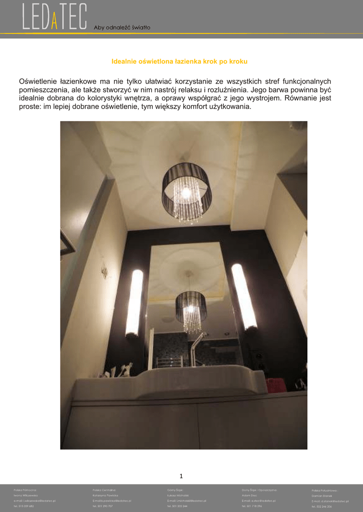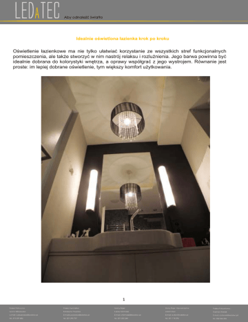 Idealnie oœwietlona ³azienka krok po kroku Oœwietlenie ³azienkowe ma nie tylko u³atwiaæ korzystanie ze wszystkich stref funkcjonalnych pomieszczenia, ale tak¿e stworzyæ w nim nastrój relaksu i rozluŸnienia. Jego barwa powinna byæ idealnie dobrana do kolorystyki wnêtrza, a oprawy wspó³graæ z jego wystrojem. Równanie jest proste: im lepiej dobrane oœwietlenie, tym wiêkszy komfort u¿ytkowania. 1 Stwórz nastrój za pomoc¹ oœwietlenia ogólnego Aran¿uj¹c ³azienkê, czêsto musimy wykorzystywaæ do granic mo¿liwoœci ka¿dy metr kwadratowy przestrzeni, tak by ka¿dy z domowników móg³ zaspokoiæ tu wszystkie swoje potrzeby. Odpowiednio dobrane oœwietlenie i kolorystyka œcian mog¹ dodatkowo wzmocniæ wra¿enie przestronnoœci. Wiêkszoœæ ³azienek nie ma okien, dlatego wa¿ne jest, by barwa oœwietlenia ogólnego imitowa³a œwiat³o naturalne. Sztuczne œwiat³o nie mo¿e nas dra¿niæ, ani oœlepiaæ. W ³azience idealnie sprawdzaj¹ siê zarówno du¿e, p³askie oprawy nabudowane (plafony), jak i niewielkie, przys³oniête mlecznym szk³em lub tworzywem sztucznym oprawy wbudowane. Zrezygnujmy z opraw wisz¹cych, poniewa¿ mog¹ one krêpowaæ wykonywanie codziennych czynnoœci. Pamiêtajmy, by ze wzglêdu na wilgotnoœæ panuj¹c¹ w pomieszczeniu podczas k¹pieli, zamontowaæ w ³azience oprawy oœwietleniowe o podwy¿szonym stopniu szczelnoœci (minimum IP44). Nasze propozycje szczelnych opraw wbudowanych: - IP 65: GYDRO i RING LED - IP 54: KONIC O, MINI KUBIC M i GYDRO R - IP 44: GIOTTO 335 2 Nasze propozycje opraw oœwietleniowych o podwy¿szonej szczelnoœci: - CHARON PLUS (IP44) - VENA SLIM (Ip44) - ROTTO (IP65) - QUATTO L (IP65) Rozdziel strefy funkcjonalne za pomoc¹ œwiat³a Wszêdzie tam, gdzie potrzebujemy dodatkowego oœwietlenia, musimy zamontowaæ odrêbne Ÿród³a œwiat³a. Z regu³y wykorzystujemy w tym celu oprawy œcienne (kinkiety). Pamiêtajmy, by oœwietlenie funkcjonalne (miejscowe) by³o znacznie jaœniejsze ni¿ oœwietlenie ogólne. Montuj¹c oœwietlenie wokó³ lustra nale¿y pamiêtaæ, by œwiat³o pada³o na przegl¹daj¹c¹ siê twarz równomiernie i nie tworzy³o cieni. Najlepszym rozwi¹zaniem jest umieszczenie dwóch opraw kinkietowych po obu stronach lustra. Alternatywnym rozwi¹zaniem jest umieszczenie oprawy oœwietleniowej bezpoœrednio nad lustrem. Dobrym pomys³em jest równie¿ monta¿ opraw œciennych z regulowanym kierunkiem padania œwiat³a, pozwalaj¹cym skierowaæ œwiat³o w wybrane przez nas miejsce. 3 Nasze propozycje opraw œciennych przeznaczonych do monta¿u przy lustrze: - CASTOR - IZAR III - OKTAGO - GORBIT Doœwietl strefê k¹pielow¹ Aby uzyskaæ wiêkszy komfort podczas k¹pieli w wannie lub pod prysznicem, mo¿emy zainstalowaæ dodatkowe Ÿród³o œwiat³a o ciep³ej barwie, które bêdzie op³ywa³o nasze cia³o. Ciekawy efekt aran¿acyjny osi¹gniemy montuj¹c w obudowie wanny lub prysznica ró¿nobarwne, wodoodporne taœmy LED. Wykorzystuj¹c to rozwi¹zanie musimy pamiêtaæ o stopniu szczelnoœci tych rozwi¹zañ. Dla stref bezpoœredniego kontaktu z wod¹ minimalny stopieñ szczelnoœci to IP55. 4 Podkreœl walory Œwiat³o mo¿e byæ najistotniejszym elementem dekoracji ³azienki - czêsto tak niewielkiej, ¿e nie ma w niej miejsca na inne dodaj¹ce charakteru dodatki. Dekoracjê ³azienki stanowi¹ nie tylko same oprawy oœwietleniowe (ich kolor, kszta³t, faktura), ale tak¿e rozsy³ œwiat³a, który za ich pomoc¹ pada na œcianê. Nasze propozycje dekoracyjnych opraw œciennych (IP54): - ZAGO - MOTYL 6 LED - WINGO - BLUMGO - OLIVE 2K Ciekawym rozwi¹zaniem jest monta¿ oœwietlenia przypod³ogowego, które umieszcza siê w fugach w miejscu krzy¿owania siê p³ytek ceramicznych. Na rynku dostêpne s¹ równie¿ baterie podœwietlaj¹ce wyp³ywaj¹c¹ z nich wodê. 5 Za pomoc¹ œwiat³a mo¿emy wyeksponowaæ ciekawe elementy architektoniczne przestrzeni ³azienkowej. Dziêki taœmom LED, umieszczonych w specjalnych profilach, mo¿emy podœwieliæ nie tylko podwieszany sufit, ale tak¿e œciany o ciekawej fakturze, obudowê wanny lub prysznica. 5 wskazówek, jak optycznie powiêkszyæ ma³¹ ³azienkê: - postaw na du¿e, jasne kafelki oraz jasne kolory œcian i szafek, - unikaj mocnych kontrastów - kafelki w zbli¿onej tonacji uk³adaj w poszerzaj¹ce wnêtrze pasy, - im jaœniej, tym lepiej - zamontuj wiêksz¹ iloœæ œwiate³ i podœwietl wszelkiego rodzaju wnêki, - wybieraj¹c meble postaw na lustrzane powierzchnie frontów szafek, przepuszczaj¹ce œwiat³o szklane pó³ki oraz inne materia³y rozpraszaj¹ce œwiat³o, - utrzymuj porz¹dek i eksponuj tylko te rzeczy, które maj¹ charakter dekoracyjny. Wiêcej pomys³ów na aran¿acjê ³azienki znajdziesz na: - na blogu: http://ledatec.blogspot.com - na portalu Facebook: http://www.facebook.com/LEDaTEC - na portalu Pinterest: http://pinterest.com/ledatec 6