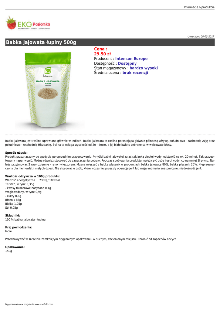 Informacje o produkcie Utworzono 08-03-2017 Babka jajowata łupiny 500g Cena : 29.50 zł Producent : Intenson Europe Dostępność : Dostępny Stan magazynowy : bardzo wysoki Średnia ocena : brak recenzji Babka jajowata jest rośliną uprawiana głównie w Indiach. Babka jajowata to roślina porastająca głównie północną Afrykę, południowo - zachodnią Azję oraz południowo - wschodnią Hiszpanię. Bylina ta osiąga wysokość od 20 - 40cm, a jej białe kwiaty zebrane są w walcowate kłosy. Sposób użycia: Produkt przeznaczony do spożycia po uprzednim przygotowaniu: ½ łyżki babki jajowatej zalać szklanką ciepłej wody, odstawić na ok. 20 minut. Tak przygotowany napar wypić. Można również stosować do zagęszczania potraw. Podczas spożywania produktu, należy pić duże ilości wody, co najmniej 2l płynu. Należy przyjmować 2 razy dziennie - rano i wieczorem. Można mieszać z babką płesznik w proporcjach babka jajowata 80%, babka płesznik 20%. Nieprzeznaczony dla niemowląt i małych dzieci. Nie stosować u osób, które wcześniej przeszły operacje jelit lub mają anomalia anatomiczne, niedrożność jelit. Wartość odżywcza w 100g produktu: Wartość energetyczna 733kJ / 183kcal Tłuszcz, w tym: 0,35g - kwasy tłuszczowe nasycone 0,1g Węglowodany, w tym: 0,9g - cukry 0,6g Błonnik 86g Białko 1,05g Sól 0,05g Składniki: 100 % babka jajowata - łupina Kraj pochodzenia: Indie Przechowywać w szczelnie zamkniętym oryginalnym opakowaniu w suchym, zacienionym miejscu. Chronić od zapachów obcych. Opakowanie: 150g Wygenerowano w programie www.oscGold.com