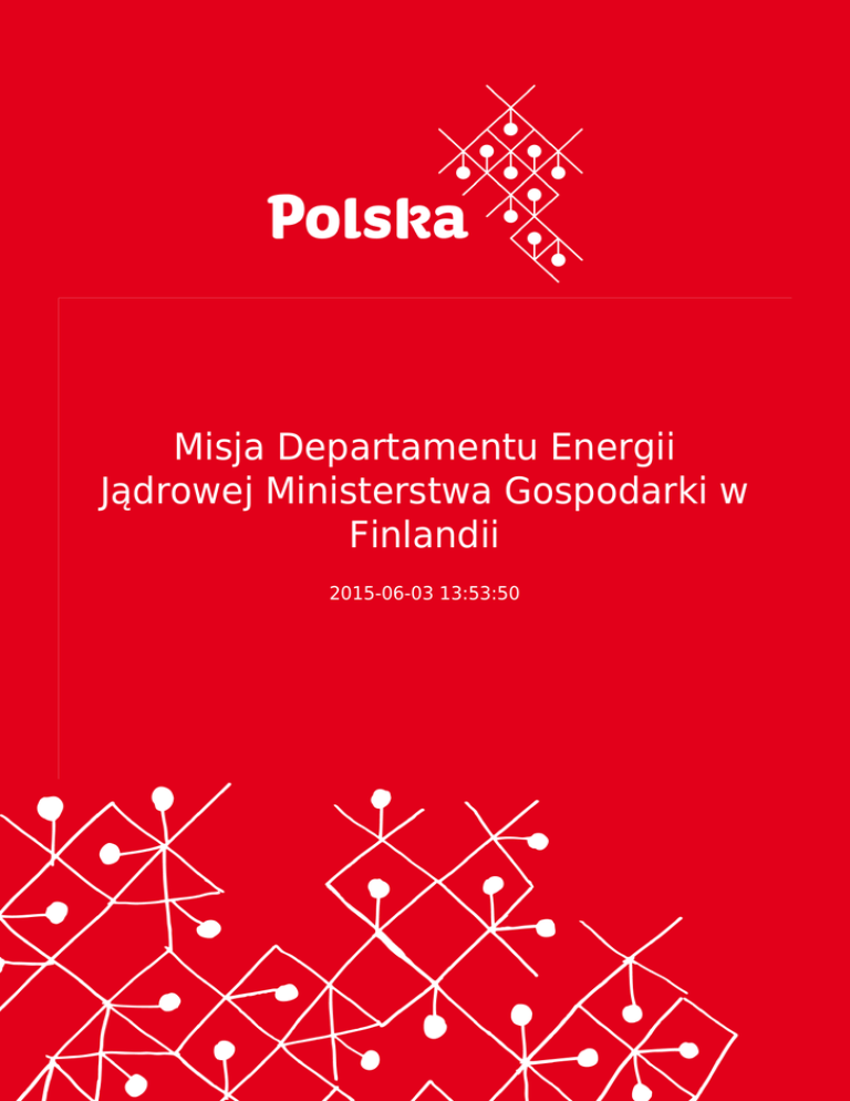 Misja Departamentu Energii Jądrowej Ministerstwa Gospodarki w Finlandii 2015-06-03 13:53:50 2 W dniach 24-29.05.2015 r. przebywała w Finlandii misja Departamentu Energii Jądrowej Ministerstwa Gospodarki. Celem misji było zapoznanie się z problematyką cyklu paliwowego w fińskich elektrowniach jądrowych. W dniach 24-29.05.2015 r. przebywała w Finlandii misja Departamentu Energii Jądrowej Ministerstwa Gospodarki. Celem misji było zapoznanie się z problematyką cyklu paliwowego w fińskich elektrowniach jądrowych. Program wizyty przewidywał szereg spotkań, w tym z przedstawicielami Ministerstwa Zatrudnienia i Gospodarki, STUK (Radiation and Nuclear Safety Authority), konsorcjum FENNOVOIMA powołanego do budowy nowej elektrowni jądrowej Hanhikivi 1 w Pyhäjoki, firmą Teollisuuden Voima Oyi (TVO), operatorem elektrowni jądrowych w Olkiluoto, oraz z przedstawicielami francuskiej firmy AREVA, budującej trzeci reaktor jądrowy w Olkiluoto. 3