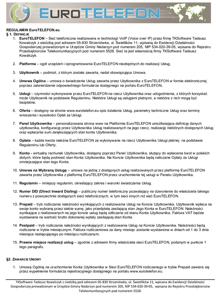 REGULAMIN EuroTELEFON.eu § 1. DEFINICJE 1. EuroTELEFON – Sieć telefoniczna realizowana w technologii VoIP (Voice over IP) przez firmę TKSoftware Tadeusz Kowalczyk z siedzibą pod adresem 05-830 Strzeniówka, ul. Świetlików 11, wpisaną do Ewidencji Działalności Gospodarczej prowadzonym w Urzędzie Gminy Nadarzyn pod numerem 205, NIP 534-020-39-05, wpisana do Rejestru Przedsiębiorców Telekomunikacyjnych pod numerem 5528. Sieć ta jest własnością firmy TKSoftware Tadeusz Kowalczyk. 2. Platforma – ogół urządzeń i oprogramowania EuroTELEFON niezbędnych do realizacji Usług. 3. Użytkownik – podmiot, z którym została zawarta, nadal obowiązująca Umowa. 4. Umowa Ogólna – umowa o świadczenie Usług zawarta przez Użytkownika z EuroTELEFON w formie elektronicznej poprzez zatwierdzenie odpowiedniego formularza dostępnego na portalu EuroTELEFON.. 5. Usługi – czynności wykonywane przez EuroTELEFON na rzecz Użytkownika oraz udogodnienia, z których korzystać może Użytkownik na podstawie Regulaminu. Niektóre Usługi są usługami płatnymi, a niektóre z nich mogą być bezpłatne. 6. Oferta – dostępny na stronie www.eurotelefon.eu opis działania Usług, parametry techniczne Usług oraz terminy wnoszenia i wysokości Opłat za Usługi. 7. Panel Użytkownika – personalizowana strona www na Platformie EuroTELEFON umożliwiająca definicję danych użytkownika, konfigurację przez Użytkownika Usług realizowanych na jego rzecz, realizację niektórych dostępnych Usług oraz wpłacania sum zwiększających stan konta Użytkownika. 8. Opłata – każda kwota należna EuroTELEFON za wykonywane na rzecz Użytkownika Usługi płatnej na podstawie Regulaminu lub Oferty. 9. Konto - wirtualny rachunek Użytkownika, dostępny poprzez Panel Użytkownika, służący do wpłacania kwot w polskich złotych, które będą podnosić stan Konta Użytkownika. Na Koncie Użytkownika będą naliczane Opłaty za Usługi zmniejszające stan tego Konta. 10. Umowa na Wybraną Usługę – umowa na jedną z dostępnych usług realizowanych przez platformę EuroTELEFON zawarta przez Użytkownika z platformą EuroTELEFON przez uruchomienie tej usługi w Panelu Użytkownika. 11. Regulamin – niniejszy regulamin, określający zakres i warunki świadczenia Usług. 12. Numer DID (Direct Inward Dialing) – publiczny numer telefoniczny pozwalający na dzwonienie do właściciela takiego numeru z powszechnie dostępnych sieci telefonicznych, w tym sieci innych niż sieć EuroTELEFON. 13. Prepaid – tryb rozliczania należności wynikających z realizowania Usług na Koncie Użytkownika. Użytkownik wpłaca na swoje konto wybraną przez siebie sumę, jako przedpłatę zasilającą stan Jego Konta w EuroTELEFON. Należności wynikające z realizowanych na jego koncie usług będą odliczane od stanu Konta Użytkownika. Faktura VAT będzie wystawiana na wartość brutto dokonanej wpłaty zasilającej stan Konta. 14. Postpaid – tryb rozliczania należności wynikających z realizowania Usług na Koncie Użytkownika. Należności będą rozliczane w trybie miesięcznym. Faktura rozliczeniowa za dany miesiąc zostanie wystawiona w dniach od 1 do 3 dnia miesiąca następującego po miesiącu rozliczanym. 15. Prawne miejsce realizacji usług – zgodnie z adresem firmy właściciela sieci EuroTELEFON, podanym w punkcie 1 tego paragrafu. §2. ZAWARCIE UMOWY 1. Umowę Ogólną na uruchomienie Konta Użytkownika w Sieci EuroTELEFON rozliczanego w trybie Prepaid zawiera się przez wypełnienie formularza rejestracyjnego dostępnego na portalu www.eurotelefon.eu. TKSoftware Tadeusz Kowalczyk z siedzibą pod adresem 05-830 Strzeniówka, ul. Świetlików 11, wpisana do Ewidencji Działalności Gospodarczej prowadzonym w Urzędzie Gminy Nadarzyn pod numerem 205, NIP 534-020-39-05, wpisana do Rejestru Przedsiębiorców Telekomunikacyjnych pod numerem 5528. 2. Umowę Ogólną na uruchomienie Konta Użytkownika w Sieci EuroTELEFON rozliczanego w trybie Postpaid zawiera się w formie pisemnej po konsultacji z działem handlowym sieci EuroTELEFON po wypełnieniu formularza zgłoszeniowego dostępnego na portalu www.eurotelefon.eu. 3. Potwierdzenie wypełnionego formularza kliknięciem przycisku „Załóż konto” oznacza akceptację przez Użytkownika Regulaminu, przyjęcie przez Użytkownika Oferty, a pomiędzy EuroTELEFON i Użytkownikiem zostaje zawarta Umowa, której Regulamin i Oferta stanowią integralną część. 4. Umowa zostaje zawarta na czas nieokreślony chyba, że Strony zgodziły się na określenie terminu działania umowy. 5. Z chwilą zawarcia Umowy EuroTELEFON zobowiązuje się do świadczenia Użytkownikowi Usług rozliczanych w trybie Prepaid, a Użytkownik zobowiązuje się do korzystania z Usług i ponoszenia Opłat zgodnie z aktualną Ofertą. Aktualna Oferta, zawierająca w szczególności koszty Usług, znajduje się na stronie www.eurotelefon.eu. 6. Zawarcie i wykonywanie Umowy przez EuroTELEFON uzależnione jest od istnienia technicznych możliwości świadczenia Usług przez EuroTELEFON dla Użytkownika w danej lokalizacji. §3. ROZWIĄZANIE UMOWY 1. Umowa Ogólna może zostać rozwiązana bez wypowiedzenia przez EuroTELEFON po upływie 3 miesięcy kalendarzowych od dnia, w którym saldo na Koncie stało się i pozostaje ujemne. O stanie Konta Użytkownik informowany jest przez EuroTELEFON za każdym razem gdy jego stan spada poniżej ustalonej wartości. Informacja przesyłana jest na adres email Użytkownika wskazany w Panelu Użytkownika. 2. Umowa może zostać rozwiązana przez EuroTELEFON bez wypowiedzenia, w trybie natychmiastowym, w przypadku gdy Użytkownik: a. podał nieprawdziwe dane lub złożył nieprawdziwe oświadczenie, b. swoim zaniechaniem lub działaniem powoduje lub może spowodować szkody lub zagrożenia dla funkcjonowania lub integralności Platformy lub połączonych z nią systemów podmiotów trzecich, c. swoim zaniechaniem lub działaniem narusza