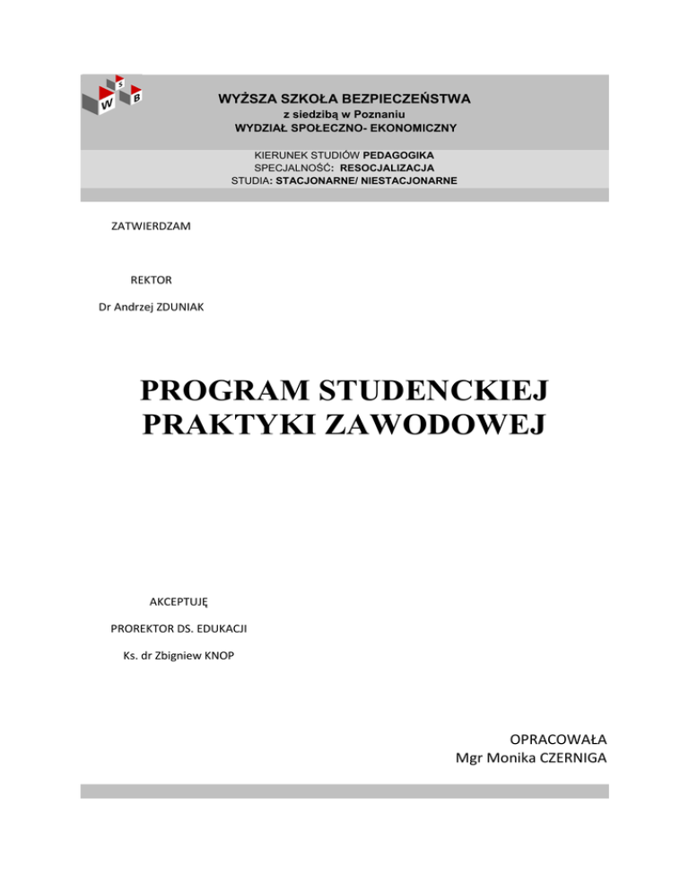 w WYŻSZA SZKOŁA BEZPIECZEŃSTWA z siedzibą w Poznaniu WYDZIAŁ SPOŁECZNO- EKONOMICZNY KIERUNEK STUDIÓW PEDAGOGIKA SPECJALNOŚĆ: RESOCJALIZACJA STUDIA: STACJONARNE/ NIESTACJONARNE ZATWIERDZAM REKTOR Dr Andrzej ZDUNIAK PROGRAM STUDENCKIEJ PRAKTYKI ZAWODOWEJ AKCEPTUJĘ PROREKTOR DS. EDUKACJI Ks. dr Zbigniew KNOP OPRACOWAŁA Mgr Monika CZERNIGA PROGRAM PRAKTYKI ZAWODOWEJ Kierunek studiów: PEDAGOGIKA Specjalność: RESOCJALIZACJA Studia: STACJONARNE/ NIESTACJONARNE ORGANIZACJA PRAKTYKI 1. Praktyka zawodowa na kierunku pedagogika, specjalność resocjalizacja realizowana jest na IV oraz V semestrze na studiów stacjonarnych i niestacjonarnych. 2. Studenci po III semestrze odbywają praktykę zawodową w wymiarze 4 tygodni – 40 godzin tygodniowo. Praktyka może być realizowana w trybie śródrocznym lub w trybie ciągłym, a jej zakończenie winno nastąpić najpóźniej do końca IV semestru studiów. Dzienna i tygodniowa liczba realizowanych godzin praktyki może być elastyczna zgodnie z wewnętrznymi ustaleniami czy możliwościami placówki przyjmującej studenta, jednak w sumie musi ona wynosić 160 godzin. 3. Studenci po IV semestrze odbywają praktykę zawodową w wymiarze 4 tygodni – 40 godzin tygodniowo. Praktyka może być realizowana w trybie śródrocznym lub w trybie ciągłym, a jej zakończenie winno nastąpić najpóźniej do końca V semestru studiów. Dzienna i tygodniowa liczba realizowanych godzin praktyki może być elastyczna zgodnie z wewnętrznymi ustaleniami czy możliwościami placówki przyjmującej studenta, jednak w sumie musi ona wynosić 160 godzin. 4. Do liczby godzin praktyki nie wlicza się czasu przeznaczonego przez studenta na niezbędne przygotowanie się do zajęć w danej placówce. 5. Ze względu na charakter praktyki, może być ona odbywana wyłącznie na terenie jednej placówki. Podstawą podjęcia praktyki jest skierowanie z Uczelni. 6. Praktyka może być realizowana w placówkach o całodobowym trybie pracy, fakt ten jednak nie powoduje możliwości odpowiedniego skrócenia planowego wymiaru czasu praktyki. 7. Wskazane jest, aby praktyka odbywała się pod kierownictwem opiekuna (pracownika) posiadającego wyższe wykształcenie oraz pełne kwalifikacje wymagane na danym stanowisku. Zakładowy opiekun praktyki udziela pomocy studentom w zależności od stopnia trudności realizowanych zadań i możliwości poszczególnych praktykantów. 8. Praktyka ma charakter czynny, tzn. że w szczególności hospitacje i tym podobne formy biernego udziału w zajęciach powinny stanowić nie więcej niż 25% ogólnego czasu praktyki. 9. Student prowadzi Dziennik Praktyki. CELE PRAKTYKI 1. Zapoznanie się ze specyfiką placówki i jej funkcjonowaniem w aspekcie formalnoprawnym i merytorycznym. 2. Wchodzenie w role zawodowe w organizacjach tworzących potencjalny teren aktywności zawodowej absolwenta studiów. 3. Nabywanie wiedzy o warsztacie pracy na określonych stanowiskach, poprzez: ćwiczenie umiejętności dokonywania trafnych obserwacji, opanowywanie umiejętności przygotowywania materiałów do pracy (konspektów, scenariuszy, programów, planów), prowadzenie zajęć (dydaktycznych, profilaktycznych, kompensacyjnych), ćwiczenie umiejętności korzystania z dostępnych źródeł informacji i narzędzi diagnostycznych, wykonywanie takich samych zadań, jakie wykonują osoby zatrudnione w danym miejscu. 4. Poszerzenie wiedzy o własnych możliwościach, silnych i słabych stronach, a w związku z tym i szansach na rynku pracy. 5. Dokonywanie szczegółowej analizy typowych problemów z obszaru działania danej placówki (np. organizacyjnego, prewencyjnego, szkolnego, zdrowotnego). 6. Aktywny udział w bieżących, ważnych z punktu widzenia funkcjonowania placówki, wydarzeniach, w szczególności takich jak kursy, szkolenia, konferencje, narady, wyjazdy. MIEJSCE ODBYWANIA PRAKTYKI 1. 2. 3. 4. 5. 6. 7. 8. 9. Młodzieżowe ośrodki wychowawcze. Młodzieżowe ośrodki socjoterapii. Pogotowia opiekuńcze. Zakłady karne. Zakłady poprawcze. Świetlice i kluby terapeutyczne. Schroniska dla nieletnich. Policyjne Izby Dziecka. Inne organizacje, placówki czy zakłady pracy, których profil działania jest zbliżony do zakresu specjalności studiów – w uzgodnieniu z opiekunem praktyk. ZADANIA PRAKTYKANTA 1. Przeprowadzenie rozmowy z opiekunem i wspólne ustalenie planu praktyki (zadania do wykonania, metody realizacji, terminarz, uwagi). 2. Zapoznanie się z miejscem praktyki: analiza dokumentacji określającej funkcje, zadania i strukturę organizacyjną placówki; podstawowe fizyczne i społeczne elementy środowiska (miejsca) pracy. 3. Przeanalizowanie dokumentacji przedstawiającej merytoryczną działalność placówki, np. programów kształcenia lub terapii, planów pracy resocjalizacyjnej, programów realizowanych przedsięwzięć. 4. Przeprowadzenie wywiadu z kierownikiem jednostki/działu na temat podstawowych celów, zadań, planów, osiągnięć, czy problemów w działalności jednostki. 5. Po uzyskaniu zgody ze strony opiekuna – udział w zebraniach pracowników, naradach, szkoleniach, konferencjach itp. 6. Bieżące dokumentowanie swojej pracy w placówce (prowadzenie dzienniczka i teczki praktyki). 7. Wykonywanie wszystkich – wyznaczonych przez opiekuna, a uznanych za ważne z punktu widzenia miejsca i celu realizowanej praktyki – zadań i czynności. ZADANIA ZAKŁADU PRACY 1. 2. 3. 4. Wyznaczenie zakładowego opiekuna praktyk. Ustalenie szczegółowego planu praktyki. Zapoznanie praktykanta z funkcjonowaniem Zakładu Pracy. Sprawowanie nadzoru nad wykonywaniem planu praktyki oraz udzielanie pomocy w przygotowaniu i realizacji zadań (zajęć) przez studentów-praktykantów. 5. Omawianie ze studentami wykonywanych przez nich zadań. 6. Zaliczenie praktyki w formie opinii z oceną oraz wpisem do Dzienniczka Praktyki. ZALICZENIE PRAKTYKI Zaliczenia praktyki dokonuje wyznaczony przez Rektora opiekun praktyk na podstawie: 1. Po