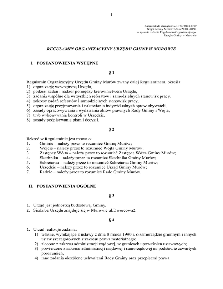 1 Załącznik do Zarządzenia Nr Or 0152-5/09 Wójta Gminy Murów z dnia 20.04.2009r. w sprawie nadania Regulaminu Organizacyjnego Urzędu Gminy w Murowie REGULAMIN ORGANIZACYJNY URZĘDU GMINY W MUROWIE I. POSTANOWIENIA WSTĘPNE §1 Regulamin Organizacyjny Urzędu Gminy Murów zwany dalej Regulaminem, określa: 1) organizację wewnętrzną Urzędu, 2) podział zadań i nadzór pomiędzy kierownictwem Urzędu, 3) zadania wspólne dla wszystkich referatów i samodzielnych stanowisk pracy, 4) zakresy zadań referatów i samodzielnych stanowisk pracy, 5) organizację przyjmowania i załatwiania indywidualnych spraw obywateli, 6) zasady opracowywania i wydawania aktów prawnych Rady Gminy i Wójta, 7) tryb wykonywania kontroli w Urzędzie, 8) zasady podpisywania pism i decyzji. §2 Ilekroć w Regulaminie jest mowa o: 1. Gminie – należy przez to rozumieć Gminę Murów; 2. Wójcie – należy przez to rozumieć Wójta Gminy Murów; 3. Zastępcy Wójta – należy przez to rozumieć Zastępcę Wójta Gminy Murów; 4. Skarbniku – należy przez to rozumieć Skarbnika Gminy Murów; 5. Sekretarzu – należy przez to rozumieć Sekretarza Gminy Murów; 6. Urzędzie – należy przez to rozumieć Urząd Gminy Murów; 7. Radzie – należy przez to rozumieć Radę Gminy Murów. II. POSTANOWIENIA OGÓLNE §3 1. Urząd jest jednostką budżetową, Gminy. 2. Siedziba Urzędu znajduje się w Murowie ul.Dworcowa2. §4 1. Urząd realizuje zadania: 1) własne, wynikające z ustawy z dnia 8 marca 1990 r. o samorządzie gminnym i innych ustaw szczegółowych z zakresu prawa materialnego; 2) zlecone z zakresu administracji rządowej, w granicach upoważnień ustawowych; 3) powierzone z zakresu administracji rządowej i samorządowej na podstawie zawartych porozumień, 4) inne zadania określone uchwałami Rady Gminy oraz przepisami prawa. 2 2. Zadania określone w ust. 1 realizują referaty i samodzielne stanowiska pracy stosowanie do ich merytorycznych zakresów działania. §5 1. Wójt jest kierownikiem Urzędu i zwierzchnikiem służbowym wszystkich pracowników Urzędu i kierowników gminnych jednostek organizacyjnych. 2. W razie nieobecności Wójta, jego obowiązki pełni Zastępca Wójta. III. ZASADY I TRYB FUNKCJONOWANIA URZĘDU §6 1. Wójt kieruje pracą Urzędu przy pomocy Zastępcy Wójta, Sekretarza i Skarbnika, którzy ponoszą przed Wójtem odpowiedzialność za realizację swoich zadań. 2. Kierownicy referatów kierują referatami w sposób zapewniający optymalną realizację zadań i ponoszą za to odpowiedzialność przed Wójtem. §7 Zasady obiegu dokumentów w Urzędzie oraz wykonywanie czynności kancelaryjnych określa instrukcja kancelaryjna i rzeczowy wykaz akt. §8 Pracownicy zatrudnieni w Urzędzie przy wykonywaniu swoich zadań: 1) działają na podstawie przepisów prawa i zobowiązani są do ich ścisłego przestrzegania, 2) zobowiązani są do wzajemnego współdziałania w szczególności w zakresie wymiany informacji i wzajemnej konsultacji, 3) kierują się zasadami etyki i praworządności, dobro publiczne przedkładają nad interes własny i swego środowiska. Są bezstronni w wykonywaniu zadań i obowiązków, szanują prawo obywateli do informacji, zapewniając w granicach przewidzianych prawem jawność prowadzonego postępowania. §9 1. Pracownicy są odpowiedzialni przed Wójtem za wykonywanie powierzonych im zadań, a w szczególności za: 1) zgodne z prawem opracowywanie projektów, uchwał, zarządzeń, decyzji, wytycznych, 2) właściwe przyjmowanie i załatwianie interesantów, 3) terminowe załatwianie spraw, 4) dokładną znajomość przepisów prawnych w zakresie obowiązującym na danym stanowisku, 5) należyte ewidencjonowanie i przechowywanie dokumentów. 2. W czasie nieobecności pracownika sprawy prowadzone przez niego wchodzą w zakres zadań innego pracownika, wyznaczonego przez Wójta, zgodnie z zakresem czynności. 3 § 10 1. Urząd prowadzi gospodarkę finansową z zachowaniem zasad określonych w ustawie o finansach publicznych, uchwałach Rady oraz zarządzeniami Wójta. 2. Gospodarując środkami publicznymi Urząd zapewnia ich wydatkowanie w sposób celowy i oszczędny, dążąc do uzyskania możliwie najlepszych efektów. 3. Przy wszystkich czynnościach prawnych mogących spowodować powstanie zobowiązań finansowych, wymagana jest kontrasygnata Skarbnika. § 11 Pracownicy Urzędu podlegają okresowym ocenom kwalifikacyjnym, na zasadach określonych w odrębnym trybie. § 12 Pracownicy podejmujący po raz pierwszy pracę na stanowisku urzędniczym, w tym kierowniczym urzędniczym, zobowiązani są odbyć służbę przygotowawczą zakończoną egzaminem, na zasadach określonych odrębnym trybem. IV. STRUKTURA ORGANIZACYJNA § 13 1. W Urzędzie tworzy się Referaty, 2. Referat tworzy się jeżeli charakter pracy uzasadnia zatrudnienie co najmniej dwóch pracowników, 3. Samodzielne stanowiska pracy tworzy się w przypadkach, gdy ze względu na specyfikę spraw, konieczne jest wykonywanie ich odrębnie i wymagają bezpośredniego podporządkowania Wójtowi Gminy. § 14 1. Strukturę organizacyjną Urzędu tworzą: 1) Kierownictwo Urzędu: a) Wójt, b) Zastępca Wójta, c) Sekretarz, d) Skarbnik. 2) Referaty i samodzielne stanowiska: a) Referat Organizacyjny, b) Referat Finansowy, c) Referat Spraw Obywatelskich, Urząd Stanu Cywilnego, d) Samodzielne stanowisko do spraw działalności gospodarczej, gospodarki mieszkaniowej i zamówień publicznych, e) Samodzielne stanowisku do spraw planowania przestrzennego i gospodarki komunalnej, f) Samodzielne stanowisko do spraw ochrony środowiska i rolnictwa, 4 g) Samodzielne stanowisko do spraw inwestycji h) Samodzielne stanowisko do spraw obronnych, obrony cywilnej i ochrony przeciwpożarowej, i) Informatyk, j) Radca prawny. 3) Pracownicy obsługi. 2. Szczegółowy wykaz stanowisk pracy w poszczególnych referatach o których mowa w ust. 1 pkt. 2 określa załącznik Nr 1 do niniejszego Regulaminu. 3.