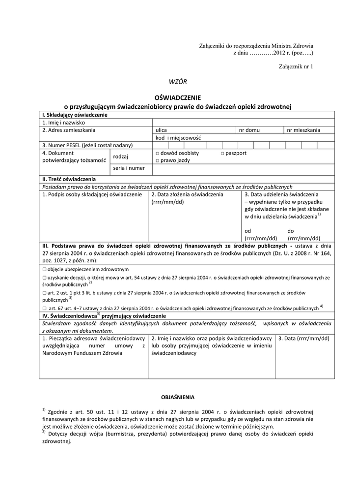 Załączniki do rozporządzenia Ministra Zdrowia z dnia …………2012 r. (poz…..) Załącznik nr 1 WZÓR OŚWIADCZENIE o przysługującym świadczeniobiorcy prawie do świadczeń opieki zdrowotnej I. Składający oświadczenie 1. Imię i nazwisko 2. Adres zamieszkania 3. Numer PESEL (jeżeli został nadany) 4. Dokument rodzaj potwierdzający tożsamość seria i numer ulica kod i miejscowość □ dowód osobisty □ prawo jazdy nr domu nr mieszkania □ paszport II. Treść oświadczenia Posiadam prawo do korzystania ze świadczeń opieki zdrowotnej finansowanych ze środków publicznych 1. Podpis osoby składającej oświadczenie 2. Data złożenia oświadczenia 3. Data udzielenia świadczenia (rrrr/mm/dd) – wypełniane tylko w przypadku gdy oświadczenie nie jest składane 1) w dniu udzielania świadczenia od do (rrrr/mm/dd) (rrrr/mm/dd) III. Podstawa prawa do świadczeń opieki zdrowotnej finansowanych ze środków publicznych - ustawa z dnia 27 sierpnia 2004 r. o świadczeniach opieki zdrowotnej finansowanych ze środków publicznych (Dz. U. z 2008 r. Nr 164, poz. 1027, z późn. zm): □ objęcie ubezpieczeniem zdrowotnym □ uzyskanie decyzji, o której mowa w art. 54 ustawy z dnia 27 sierpnia 2004 r. o świadczeniach opieki zdrowotnej finansowanych ze środków publicznych 2) □ art. 2 ust. 1 pkt 3 lit. b ustawy z dnia 27 sierpnia 2004 r. o świadczeniach opieki zdrowotnej finansowanych ze środków publicznych □ 3) art. 67 ust. 4−7 ustawy z dnia 27 sierpnia 2004 r. o świadczeniach opieki zdrowotnej finansowanych ze środków publicznych 5) 4) IV. Świadczeniodawca przyjmujący oświadczenie Stwierdzam zgodność danych identyfikujących dokument potwierdzający tożsamość, wpisanych w oświadczeniu z okazanym mi dokumentem. 1. Pieczątka adresowa świadczeniodawcy 2. Imię i nazwisko oraz podpis świadczeniodawcy 3. Data (rrrr/mm/dd) uwzględniająca numer umowy z lub osoby przyjmującej oświadczenie w imieniu Narodowym Funduszem Zdrowia świadczeniodawcy OBJAŚNIENIA 1) Zgodnie z art. 50 ust. 11 i 12 ustawy z dnia 27 sierpnia 2004 r. o świadczeniach opieki zdrowotnej finansowanych ze środków publicznych w stanach nagłych lub w przypadku gdy ze względu na stan zdrowia nie jest możliwe złożenie oświadczenia, oświadczenie może zostać złożone w terminie późniejszym. 2) Dotyczy decyzji wójta (burmistrza, prezydenta) potwierdzającej prawo danej osoby do świadczeń opieki zdrowotnej. 3) Dotyczy osoby w okresie ciąży, porodu lub połogu oraz posiadającej obywatelstwo polskie i miejsce zamieszkania na terytorium Rzeczypospolitej Polskiej. Należy zaznaczyć tylko w przypadku gdy osoba nie jest objęta ubezpieczeniem zdrowotnym. 4) Dotyczy osoby, która po wygaśnięciu obowiązku ubezpieczenia zachowała prawo do świadczeń opieki zdrowotnej na podstawie: a) art. 67 ust. 4 ustawy z dnia 27 sierpnia 2004 r. o świadczeniach opieki zdrowotnej finansowanych ze środków publicznych – w okresie 30 dni od wygaśnięcia obowiązku ubezpieczenia, b) art. 67 ust. 5 ustawy z dnia 27 sierpnia 2004 r. o świadczeniach opieki zdrowotnej finansowanych ze środków publicznych - ukończyła szkołę: - ponadgimnazjalną – w okresie 6 miesięcy od dnia zakończenia nauki albo skreślenia z listy uczniów, - wyższą – w okresie 4 miesięcy od dnia zakończenia nauki albo skreślenia z listy studentów, c) art. 67 ust. 6 ustawy z dnia 27 sierpnia 2004 r. o świadczeniach opieki zdrowotnej finansowanych ze środków publicznych - pobiera zasiłek przyznany na podstawie przepisów o ubezpieczeniu chorobowym lub wypadkowym lub jest członkiem rodziny osoby pobierającej ten zasiłek – w okresie pobierania tego zasiłku, d) art. 67 ust. 7 ustawy z dnia 27 sierpnia 2004 r. o świadczeniach opieki zdrowotnej finansowanych ze środków publicznych - ubiega się o przyznanie emerytury lub renty lub jest członkiem rodziny osoby ubiegającej się o przyznanie emerytury lub renty – w okresie trwania postępowania o przyznanie tych świadczeń. 5) Świadczeniodawca lub niebędąca świadczeniodawcą osoba uprawniona w rozumieniu art. 2 pkt 14 ustawy z dnia 12 maja 2011 r. o refundacji leków, środków spożywczych specjalnego przeznaczenia żywieniowego oraz wyrobów medycznych (Dz. U. Nr 122, poz. 696, z późn. zm.). POUCZENIE Zgodnie z art. 50 ust. 16 pkt 2 i ust. 17 ustawy z dnia 27 sierpnia 2004 r. o świadczeniach opieki zdrowotnej finansowanych ze środków publicznych w przypadku złożenia oświadczenia pomimo braku prawa do świadczeń opieki zdrowotnej finansowanych ze środków publicznych osoba, której udzielono świadczenia opieki zdrowotnej, jest obowiązana do uiszczenia kosztów tego świadczenia, chyba że w chwili składania oświadczenia działała w usprawiedliwionym błędnym przekonaniu, że posiada prawo do świadczeń opieki zdrowotnej finansowanych ze środków publicznych.