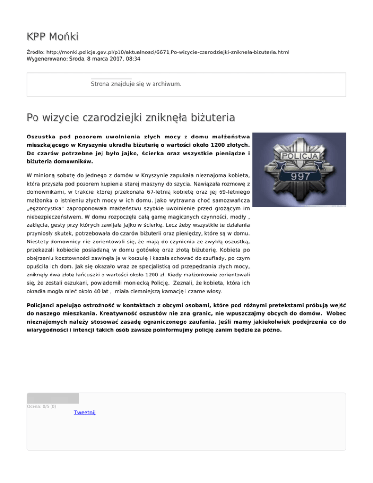 KPP Mońki Źródło: http://monki.policja.gov.pl/p10/aktualnosci/6671,Po-wizycie-czarodziejki-zniknela-bizuteria.html Wygenerowano: Środa, 8 marca 2017, 08:34 Strona znajduje się w archiwum. Po wizycie czarodziejki zniknęła biżuteria Oszustka pod pozorem uwolnienia złych mocy z domu małżeństwa mieszkającego w Knyszynie ukradła biżuterię o wartości około 1200 złotych. Do czarów potrzebne jej było jajko, ścierka oraz wszystkie pieniądze i biżuteria domowników. W minioną sobotę do jednego z domów w Knyszynie zapukała nieznajoma kobieta, która przyszła pod pozorem kupienia starej maszyny do szycia. Nawiązała rozmowę z domownikami, w trakcie której przekonała 67-letnią kobietę oraz jej 69-letniego małżonka o istnieniu złych mocy w ich domu. Jako wytrawna choć samozwańcza „egzorcystka” zaproponowała małżeństwu szybkie uwolnienie przed grożącym im niebezpieczeństwem. W domu rozpoczęła całą gamę magicznych czynności, modły , zaklęcia, gesty przy których zawijała jajko w ścierkę. Lecz żeby wszystkie te działania przyniosły skutek, potrzebowała do czarów biżuterii oraz pieniędzy, które są w domu. Niestety domownicy nie zorientowali się, że mają do czynienia ze zwykłą oszustką, przekazali kobiecie posiadaną w domu gotówkę oraz złotą biżuterię. Kobieta po obejrzeniu kosztowności zawinęła je w koszulę i kazała schować do szuflady, po czym opuściła ich dom. Jak się okazało wraz ze specjalistką od przepędzania złych mocy, zniknęły dwa złote łańcuszki o wartości około 1200 zł. Kiedy małżonkowie zorientowali się, że zostali oszukani, powiadomili moniecką Policję. Zeznali, że kobieta, która ich okradła mogła mieć około 40 lat , miała ciemniejszą karnację i czarne włosy. Policjanci apelująo ostrożność w kontaktach z obcymi osobami, które pod różnymi pretekstami próbują wejść do naszego mieszkania. Kreatywność oszustów nie zna granic, nie wpuszczajmy obcych do domów. Wobec nieznajomych należy stosować zasadę ograniczonego zaufania. Jeśli mamy jakiekolwiek podejrzenia co do wiarygodności i intencji takich osób zawsze poinformujmy policję zanim będzie za późno. Ocena: 0/5 (0) Tweetnij