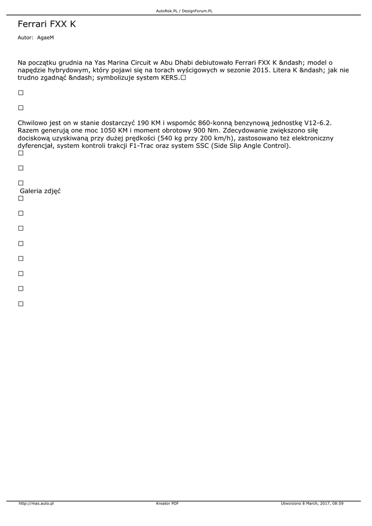AutoRok.PL / DesignForum.PL Ferrari FXX K Autor: AgaeM Na początku grudnia na Yas Marina Circuit w Abu Dhabi debiutowało Ferrari FXX K – model o napędzie hybrydowym, który pojawi się na torach wyścigowych w sezonie 2015. Litera K – jak nie trudno zgadnąć – symbolizuje system KERS. Chwilowo jest on w stanie dostarczyć 190 KM i wspomóc 860-konną benzynową jednostkę V12-6.2. Razem generują one moc 1050 KM i moment obrotowy 900 Nm. Zdecydowanie zwiększono siłę dociskową uzyskiwaną przy dużej prędkości (540 kg przy 200 km/h), zastosowano też elektroniczny dyferencjał, system kontroli trakcji F1-Trac oraz system SSC (Side Slip Angle Control). Galeria zdjęć http://mas.auto.pl Kreator PDF Utworzono 8 March, 2017, 08:59