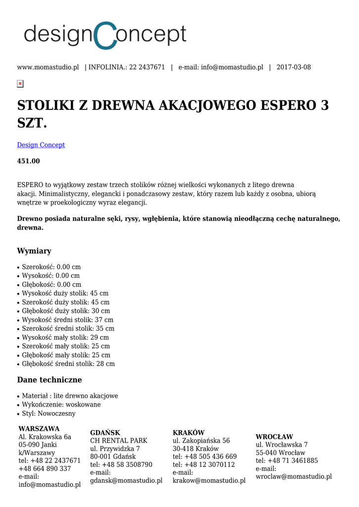 www.momastudio.pl | INFOLINIA.: 22 2437671 | e-mail: [email protected] | 2017-03-08 STOLIKI Z DREWNA AKACJOWEGO ESPERO 3 SZT. Design Concept 451.00 ESPERO to wyjątkowy zestaw trzech stolików różnej wielkości wykonanych z litego drewna akacji. Minimalistyczny, elegancki i ponadczasowy zestaw, który razem lub każdy z osobna, ubiorą wnętrze w proekologiczny wyraz elegancji. Drewno posiada naturalne sęki, rysy, wgłębienia, które stanowią nieodłączną cechę naturalnego, drewna. Wymiary ● ● ● ● ● ● ● ● ● ● ● ● Szerokość: 0.00 cm Wysokość: 0.00 cm Głębokość: 0.00 cm Wysokość duży stolik: 45 cm Szerokość duży stolik: 45 cm Głębokość duży stolik: 30 cm Wysokość średni stolik: 37 cm Szerokość średni stolik: 35 cm Wysokość mały stolik: 29 cm Szerokość mały stolik: 25 cm Głębokość mały stolik: 25 cm Głębokość średni stolik: 28 cm Dane techniczne ● ● ● Materiał : lite drewno akacjowe Wykończenie: woskowane Styl: Nowoczesny WARSZAWA Al. Krakowska 6a 05-090 Janki k/Warszawy tel: +48 22 2437671 +48 664 890 337 e-mail: [email protected] GDAŃSK CH RENTAL PARK ul. Przywidzka 7 80-001 Gdańsk tel: +48 58 3508790 e-mail: [email protected] KRAKÓW ul. Zakopiańska 56 30-418 Kraków tel: +48 505 436 669 tel: +48 12 3070112 e-mail: [email protected] WROCŁAW ul. Wrocławska 7 55-040 Wrocław tel: +48 71 3461885 e-mail: [email protected]