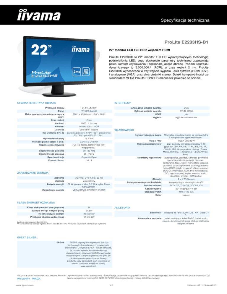 Specyfikacja techniczna ProLite E2283HS-B1 22'' monitor LED Full HD z wejściem HDMI ProLite E2283HS to 22’’ monitor Full HD wykorzystujących technologię podświetlenia LED. Jego doskonałe parametry techniczne zapewniają pełen komfort użytkowania i doskonałą jakość obrazu. Poziom kontrastu dynamicznego to 5.000.000:1 (ACR), a czas reakcji 2 ms. ProLite E2283HS wyposażono w trzy wejścia sygnału - dwa cyfrowe (HDMI i DVI) i analogowe (VGA) oraz dwa głośniki stereo. Dzięki kompatybilności ze standardem VESA ProLite E2283HS można też powiesić na ścianie. CHARAKTERYSTYKA OBRAZU INTERFEJSY Przekątna ekranu 21.5"; 54.7cm Analogowe wejście sygnału Panel TN LED-backlit Cyfrowe wejście sygnału Maks. powierzchnia robocza (wys. x szer.) Czas reakcji 268.1 x 476.6 mm; 10.6" x 18.8" HDCP Wyjścia 2 ms Kontrast 1000 : 1 typowy Kontrast 10 000 000 : 1 ACR Jasność 250 cd/m² typowa Kąt widzenia CR>10 poziomo/pionowo: 170°/ 160°; prawo/lewo: 85°/ 85°; góra/dół: 80°/ 80° Wyświetlane kolory Wielkość plamki (pion. x poz.) Częstotliwość pozioma 30 - 80 KHz Częstotliwość pionowa Kompatybilność z Apple Wszystkie monitory iiyama są kompatybilne z komputerami Apple Macintosh. Plug & Play 0.248 x 0.248 mm Full HD 1080p,1920 x 1080 ( 2.1 megapiksela) Regulacja parametrów 55 - 75 Hz Synchronizacja Separate Sync Format obrazu 16 : 9 AC 100 - 240 V, 50 / 60 Hz Zasilacz wewnętrzny Głośniki Zużycie energii 21 W typowo; maks. 0.5 W w trybie Power management Zarządzanie energią VESA DDC2B™ przy pomocy On-Screen-Display w 10 językach (EN, FR, DE, IT, PL, ES, NL, JP, Chiński, RU) i 6 przycisków obsługi (Power, Menu /Wybierz, + /Głośność, - /ECO, Wyjdź, Auto) Parametry regulowane autoregulacja, jasność, kontrast, geometria (pozycja pozioma, pozycja pionowa, taktowanie, faza), kolor, menu OSD (pozycja pozioma, pozycja pionowa, czas wygaszania menu OSD), język, przywróć, różne (ostrość, DDC/CI, informacje, ACR, tryb wyświetlania, OD, logo startowe), wybór wejścia, audio (głośność, wycisz, HDMI audio) ZARZĄDZANIE ENERGIĄ Zasilanie tak wyjście słuchawkowe WŁAŚCIWOŚCI 16.7 mln Rozdzielczość fizyczna VGA DVI-D, HDMI Zabezpieczenie przed kradzieżą Bezpieczeństwo VESA DPMS, ENERGY STAR® 2 x 1 W (Stereo) kompatybilny z Kensington-lock™ TCO, CE, TUV-GS, VCCI-B, CU Kąt pochylenia 22° w górę; 5° w dół Standard VESA 100 x 100 mm Kolor czarny KLASA ENERGETYCZNA (EU) Klasa efektywności energetycznej Zużycie energii w trybie pracy AKCESORIA B 21.8W Roczne zużycie energii 32 kW/rok* Przekątna obszaru widocznego 55 cm; 22'' Sterowniki Windows 95 / 98 / 2000 / ME / XP / Vista/ 7 / 8 Akcesoria w zestawie kabel zasilający, kabel DVI-D, kabel audio, stopka, skrócona instrukcja obsługi, instrukcja bezpieczeństwa Zgodnie z rozporządzeniem (EU) 1062/2010. *W oparciu o telewizor pracujący 4 godziny dziennie przez 365 dni w roku. Rzeczywiste zużycie zależy od faktycznego użytkowania. EPEAT SILVER EPEAT EPEAT to program wspierania zakupu technologii informatycznych przyjaznych środowisku. Certyfikat EPEAT Silver oznacza, że produkt spełnia wszystkie wymogi obowiązkowe i przynajmniej 50% wymogów opcjonalnych. Certyfikat jest ważny tylko po zarejestrowaniu przez iiyama danego produktu. Aby sprawdzić stan rejestracji w swoim państwie, wejdź na stronę www.epeat.net. Wszystkie znaki towarowe zastrzeżone. Pomyłki i wprowadzanie zmian zastrzeżone. Specyfikacje produktów mogą ulec zmianie bez wcześniejszego zawiadomienia. Wszystkie monitory LCD iiyama są zgodne z normą ISO-9241-307:2008 określającą liczbę i rodzaj defektów matrycy. WYMIARY / WAGA www.iiyama.com 1/2 2014-10-16T11:23:44+02:00 Wymiary (szer. x wys. x gł.) 505.5 x 382.5 x 193 mm Waga 3.0 kg Cena PLN 589 brutto CENA Wszystkie znaki towarowe zastrzeżone. Pomyłki i wprowadzanie zmian zastrzeżone. Specyfikacje produktów mogą ulec zmianie bez wcześniejszego zawiadomienia. Wszystkie monitory LCD iiyama są zgodne z normą ISO-9241-307:2008 określającą liczbę i rodzaj defektów matrycy. www.iiyama.com Powered by TCPDF (www.tcpdf.org) 2/2 2014-10-16T11:23:45+02:00