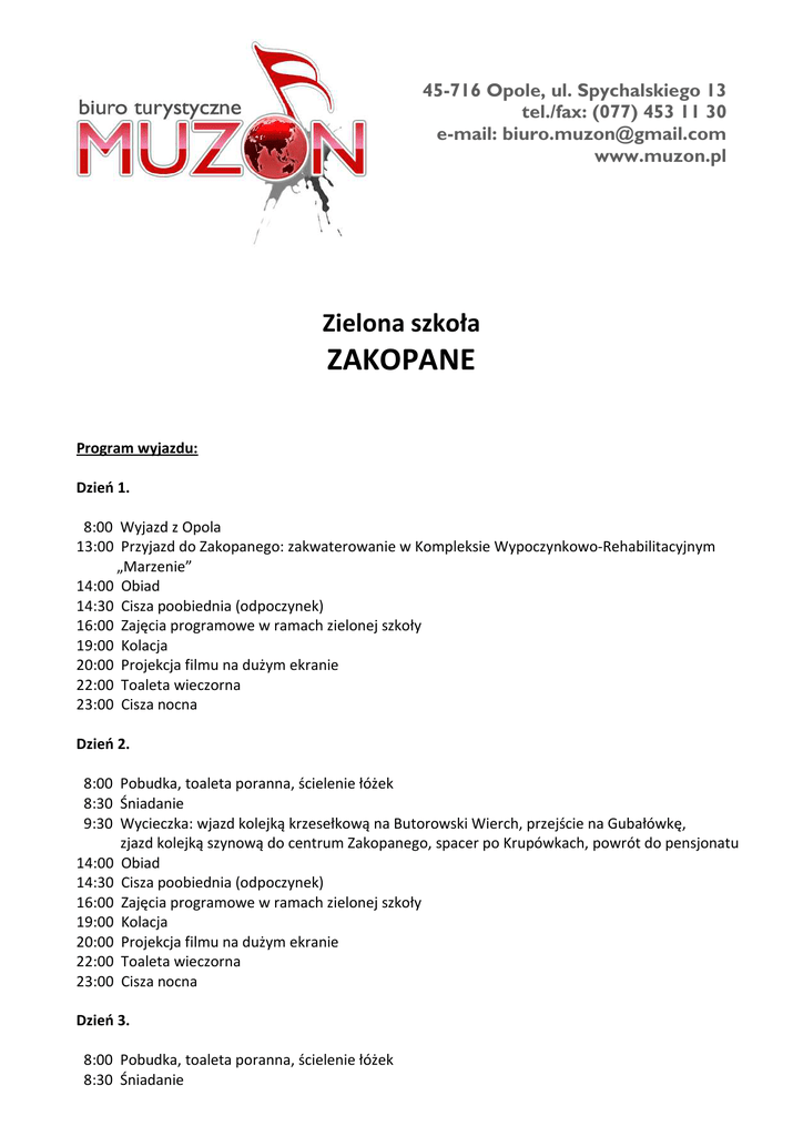 45-716 Opole, ul. Spychalskiego 13 tel./fax: (077) 453 11 30 e-mail: [email protected] www.muzon.pl Zielona szkoła ZAKOPANE Program wyjazdu: Dzień 1. 8:00 Wyjazd z Opola 13:00 Przyjazd do Zakopanego: zakwaterowanie w Kompleksie Wypoczynkowo-Rehabilitacyjnym „Marzenie” 14:00 Obiad 14:30 Cisza poobiednia (odpoczynek) 16:00 Zajęcia programowe w ramach zielonej szkoły 19:00 Kolacja 20:00 Projekcja filmu na dużym ekranie 22:00 Toaleta wieczorna 23:00 Cisza nocna Dzień 2. 8:00 Pobudka, toaleta poranna, ścielenie łóżek 8:30 Śniadanie 9:30 Wycieczka: wjazd kolejką krzesełkową na Butorowski Wierch, przejście na Gubałówkę, zjazd kolejką szynową do centrum Zakopanego, spacer po Krupówkach, powrót do pensjonatu 14:00 Obiad 14:30 Cisza poobiednia (odpoczynek) 16:00 Zajęcia programowe w ramach zielonej szkoły 19:00 Kolacja 20:00 Projekcja filmu na dużym ekranie 22:00 Toaleta wieczorna 23:00 Cisza nocna Dzień 3. 8:00 Pobudka, toaleta poranna, ścielenie łóżek 8:30 Śniadanie 9:30 Wycieczka - zwiedzanie Zakopanego: skocznia narciarska na Wielkiej Krokwi, sanktuarium na Krzeptówkach, willa „Koliba” (Muzeum Stylu Zakopiańskiego), zabytkowy cmentarzyk „Na Pęksowym Brzyzku”, powrót do pensjonatu 14:00 Obiad 14:30 Cisza poobiednia (odpoczynek) 16:00 Zajęcia programowe w ramach zielonej szkoły 20:00 Ognisko połączone z kolacją: pieczenie kiełbasek, wspólne śpiewanie piosenek 22:00 Toaleta wieczorna 23:00 Cisza nocna Dzień 4. 8:00 Pobudka, toaleta poranna, ścielenie łóżek 8:30 Śniadanie 9:30 Wycieczka do Tatrzańskiego Parku Narodowego: przejazd do Kir, piesza wędrówka Doliną Kościeliską, odpoczynek w schronisku „Ornak”, powrót do pensjonatu 15:00 Obiad 15:30 Cisza poobiednia (odpoczynek) 17:00 Zajęcia programowe w ramach zielonej szkoły 19:00 Kolacja 20:00 Projekcja filmu na dużym ekranie 22:00 Toaleta wieczorna 23:00 Cisza nocna Dzień 5. 8:00 8:30 9:30 10:00 Pobudka, toaleta poranna, ścielenie łóżek, pakowanie bagaży Śniadanie Wykwaterowanie, pakowanie bagaży do autokaru Wycieczka do Tatrzańskiego Parku Narodowego: piesza wędrówka na trasie Kuźnice Polana Kalatówki (odpoczynek) - Kuźnice, powrót do pensjonatu 14:00 Obiad 15:00 Wyjazd z Zakopanego 20:00 Przyjazd do Opola UWAGA! W przypadku niekorzystnych warunków pogodowych program może ulec zmianie! Cena: ustalana indywidualnie i uzależniona od liczby uczestników wycieczki (dzieci i opiekunów) W cenie: • • • • • • przejazd autokarem zakwaterowanie w Kompleksie Wypoczynkowo-Rehabilitacyjnym „Marzenie” w Zakopanem (pokoje 3- i 4-osobowe z łazienkami, własna stołówka) wyżywienie (wg programu) bilety wstępu opłaty przewodnickie opieka pilota