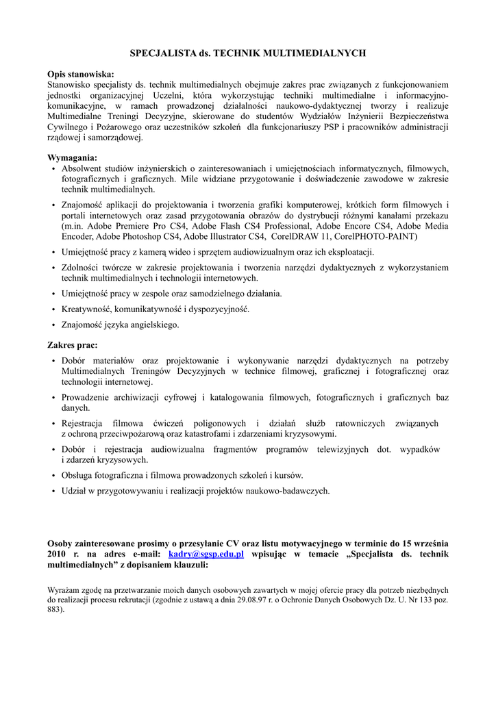 SPECJALISTA ds. TECHNIK MULTIMEDIALNYCH Opis stanowiska: Stanowisko specjalisty ds. technik multimedialnych obejmuje zakres prac związanych z funkcjonowaniem jednostki organizacyjnej Uczelni, która wykorzystując techniki multimedialne i informacyjnokomunikacyjne, w ramach prowadzonej działalności naukowo-dydaktycznej tworzy i realizuje Multimedialne Treningi Decyzyjne, skierowane do studentów Wydziałów Inżynierii Bezpieczeństwa Cywilnego i Pożarowego oraz uczestników szkoleń dla funkcjonariuszy PSP i pracowników administracji rządowej i samorządowej. Wymagania: • Absolwent studiów inżynierskich o zainteresowaniach i umiejętnościach informatycznych, filmowych, fotograficznych i graficznych. Mile widziane przygotowanie i doświadczenie zawodowe w zakresie technik multimedialnych. • Znajomość aplikacji do projektowania i tworzenia grafiki komputerowej, krótkich form filmowych i portali internetowych oraz zasad przygotowania obrazów do dystrybucji różnymi kanałami przekazu (m.in. Adobe Premiere Pro CS4, Adobe Flash CS4 Professional, Adobe Encore CS4, Adobe Media Encoder, Adobe Photoshop CS4, Adobe Illustrator CS4, CorelDRAW 11, CorelPHOTO-PAINT) • Umiejętność pracy z kamerą wideo i sprzętem audiowizualnym oraz ich eksploatacji. • Zdolności twórcze w zakresie projektowania i tworzenia narzędzi dydaktycznych z wykorzystaniem technik multimedialnych i technologii internetowych. • Umiejętność pracy w zespole oraz samodzielnego działania. • Kreatywność, komunikatywność i dyspozycyjność. • Znajomość języka angielskiego. Zakres prac: • Dobór materiałów oraz projektowanie i wykonywanie narzędzi dydaktycznych na potrzeby Multimedialnych Treningów Decyzyjnych w technice filmowej, graficznej i fotograficznej oraz technologii internetowej. • Prowadzenie archiwizacji cyfrowej i katalogowania filmowych, fotograficznych i graficznych baz danych. • Rejestracja filmowa ćwiczeń poligonowych i działań służb ratowniczych z ochroną przeciwpożarową oraz katastrofami i zdarzeniami kryzysowymi. związanych • Dobór i rejestracja audiowizualna fragmentów programów telewizyjnych dot. wypadków i zdarzeń kryzysowych. • Obsługa fotograficzna i filmowa prowadzonych szkoleń i kursów. • Udział w przygotowywaniu i realizacji projektów naukowo-badawczych. Osoby zainteresowane prosimy o przesyłanie CV oraz listu motywacyjnego w terminie do 15 września 2010 r. na adres e-mail: [email protected] wpisując w temacie „Specjalista ds. technik multimedialnych” z dopisaniem klauzuli: Wyrażam zgodę na przetwarzanie moich danych osobowych zawartych w mojej ofercie pracy dla potrzeb niezbędnych do realizacji procesu rekrutacji (zgodnie z ustawą a dnia 29.08.97 r. o Ochronie Danych Osobowych Dz. U. Nr 133 poz. 883).