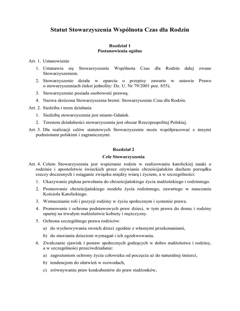 Statut Stowarzyszenia Wspólnota Czas dla Rodzin Rozdział 1 Postanowienia ogólne Art. 1. Ustanowienie 1. Ustanawia się Stowarzyszenie Stowarzyszeniem. Wspólnota Czas dla Rodzin 2. Stowarzyszenie działa w oparciu o przepisy zawarte w o stowarzyszeniach (tekst jednolity: Dz. U. Nr 79/2001 poz. 855). dalej zwane ustawie Prawo 3. Stowarzyszenie posiada osobowość prawną. 4. Nazwa skrócona Stowarzyszenia brzmi: Stowarzyszenie Czas dla Rodzin. Art. 2. Siedziba i teren działania 1. Siedzibą stowarzyszenia jest miasto Gdańsk. 2. Terenem działalności stowarzyszenia jest obszar Rzeczpospolitej Polskiej. Art. 3. Dla realizacji celów statutowych Stowarzyszenie może współpracować z innymi podmiotami polskimi i zagranicznymi. Rozdział 2 Cele Stowarzyszenia Art. 4. Celem Stowarzyszenia jest wspieranie rodzin w realizowaniu katolickiej nauki o rodzinie i apostolstwie świeckich przez ożywianie chrześcijańskim duchem porządku rzeczy doczesnych i osiąganie związku między wiarą i życiem, a w szczególności: 1. Ukazywanie piękna powołania do chrześcijańskiego życia małżeńskiego i rodzinnego. 2. Promowanie chrześcijańskiego modelu życia rodzinnego, zawartego w nauczaniu Kościoła Katolickiego. 3. Wzmacnianie roli i pozycji rodziny w życiu społecznym i systemie prawa. 4. Promowanie i ochrona podstawowych praw dzieci, w tym prawa do domu i rodziny opartej na trwałym małżeństwie kobiety i mężczyzny. 5. Ochrona szczególnego prawa rodziców: a) do wychowywania swoich dzieci zgodnie z własnymi przekonaniami, b) do stawiania dzieciom wymagań i ich egzekwowania. 6. Zwalczanie zjawisk i postaw społecznych godzących w dobro małżeństwa i rodziny, a w szczególności przeciwdziałanie: a) zagrożeniom ochrony życia człowieka od poczęcia aż do naturalnej śmierci, b) tendencjom do ułatwień w rozwodach, c) zrównywaniu praw konkubentów do praw małżonków, d) zrównywania związków jednopłciowych i poligamicznych z małżeństwem, adopcji dzieci przez tego typu związki, e) legalizacji pornografii, pedofilii, zoofilii, kazirodztwa itp., f) eliminacji kontratypu karcenia dzieci w prawie karnym, g) szerzeniu poglądów i postaw sprzecznych z nauczaniem Kościoła Katolickiego o rodzinie. Rozdział 3 Sposoby realizacji celów Art. 5. Stowarzyszenie realizuje swoje cele poprzez: 1. Edukację, oświatę, formację rodzin i młodzieży w duchu chrześcijańskim, w tym: a) organizowanie kursów i konferencji o charakterze otwartym; b) prowadzenie i rodzinnego; szkoleń i poradnictwa przedmałżeńskiego, małżeńskiego, c) prowadzenie poradnictwa i niesienie pomocy rodzinom po stracie członka rodziny; d) organizowanie i wspieranie wszelkich form życia chrześcijańskiego, w tym spotkań modlitewnych, dni skupienia, rekolekcji, nabożeństw oraz włączanie się w działania ewangelizacyjne; e) prowadzenie poradnictwa i niesienie pomocy osobom pozbawionym wolności i ich rodzinom; f) prowadzenie działalności oświatowej, wychowawczej, kulturalnej i turystycznosportowej. 2. Prowadzenie działalności wydawniczej. 3. Podejmowanie inicjatyw politycznych, społecznych i gospodarczych mających na celu wszechstronną pomoc rodzinie oraz ochronę życia od poczęcia do naturalnej śmierci. 4. Organizowanie i współorganizowanie imprez, wydarzeń i działań o charakterze społecznym, religijnym, kulturalnym i artystycznym. 5. Organizowanie i udzielanie pomocy dla rodzin w trudnej sytuacji życiowej, w tym pomocy materialnej, przy czym działalność ta nie może być prowadzona wyłącznie na rzecz członków Stowarzyszenia. 6. Współpracę z organami administracji państwowej i samorządowej, stowarzyszeniami, parafiami, wspólnotami i innymi organizacjami promującymi rodzinę. Art. 6. Stowarzyszenie może realizować swoje cele poprzez działalność nieodpłatną i odpłatną. Rozdział 4 Członkowie Stowarzyszenia Art. 7. Rodzaje członkostwa 1. Członkowie Stowarzyszenia dzielą się na: a) członków zwyczajnych, b) członków wspierających, c) członków honorowych. 2. Członkom zwyczajnym Stowarzyszenia przysługują następujące prawa: a) udział w przedsięwzięciach podejmowanych przez Stowarzyszenie; b) wpływ na działanie Stowarzyszenia poprzez uczestnictwo w Zgromadzeniach, przedstawianie swego stanowiska oraz głosowanie podczas Zgromadzeń; c) czynne i bierne prawo wyborcze w wyborach do Organów Stowarzyszenia. 3. Członkom wspierającym i członkom honorowym przysługują następujące prawa: a) udział w przedsięwzięciach podejmowanych przez Stowarzyszenie; b) uczestnictwo w Zgromadzeniach z głosem doradczym. 4. Członkowie zwyczajni i wspierający są zobowiązani: a) żyć zgodnie z etyką katolicką; b) przestrzegać Statut, decyzje organów Stowarzyszenia oraz wzory życia, postępowania i postaw, które Stowarzyszenie propaguje i może określać w swych regulaminach; c) wspomagać materialnie działalność Stowarzyszenia, w szczególności płacić składkę członkowską, z zastrzeżeniem Art. 11 d) współpracować w ramach własnych możliwości w działaniach podejmowanych przez Stowarzyszenie. Art. 8. Członkami zwyczajnymi i wspierającymi Stowarzyszenia mogą być wyłącznie osoby: a) pełnoletnie, mające pełną zdolność do czynności prawnych; b) będące członkami Kościoła Katolickiego i przyjmujące w całości jego naukę; c) identyfikujące się ze Stowarzyszeniem, jego celami i funkcjonowaniem opisanym w niniejszym statucie; d) przyjęte do Stowarzyszenia zgodnie z Art. 9 lub będące założycielami Stowarzyszenia. Art. 9. Przyjęcie w poczet członków Stowarzyszenia 1. Kandydat zgłasza swoją kandydaturę osobiście do Przewodniczącego Stowarzyszenia na co najmniej 3 dni przed terminem Zgromadzenia Stowarzyszenia. 2. Kandydat na członka wspierającego musi być przedstawiony na Zgromadzeniu Stowarzyszenia przez przynajmniej dwóch członków (reprezentujących dwie różne rodziny), którzy wygłoszą sw