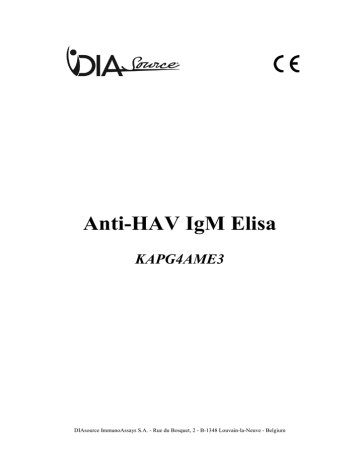 Anti-HAV IgM Elisa KAPG4AME3 DIAsource ImmunoAssays S.A. - Rue du Bosquet, 2 - B-1348 Louvain-la-Neuve - Belgium : 110628/3 Anti-HAV IgM Elisa For qualitative in-vitro detection of IgM antibodies to hepatitis A virus (Anti-HAV IgM) in human serum or plasma en KAPG4AME3 IN VITRO DIAGNOSTIC USE DIAsource ImmunoAssays SA - Rue du Bosquet 2, B-1348 Louvain-la-Neuve, Belgium Tel: +32 10 84 99 11 - Fax : +32 10 84 99 90 1. INTENDED USE Anti-HAV IgM ELISA is an enzyme immunoassay kit for in vitro qualitative detection of IgM antibody to hepatitis A virus (Anti-HAV IgM) in human serum or plasma (heparin, EDTA or citrate). 2. SUMMARY AND TEST EXPLANATION The hepatitis A virus (HAV) is a single-stranded RNA-containing virus without an envelope and with a diameter of 27 nm that belongs to the family of Picornaviridae (1-2). Hepatitis A - the most common form of acute viral hepatitis - is an infection of fecal-oral transmission produced in humans after an average incubation period of 28 days (range, 15-50 days). The illness caused by HAV infection typically has an abrupt onset of symptoms that can include fever, malaise, anorexia, nausea, abdominal discomfort, dark urine, and jaundice (2). Hepatitis A antigen can be detected in the feces only briefly before or at the onset of infection becoming generally undetectable during the late acute stage (3). The antibody specific to HAV during the acute phase of hepatitis A is the IgM type (Anti-HAV IgM), which decreases then being replaced by IgG type (Anti-HAV IgG) during early and late convalescence (4). Anti-HAV IgM usually disappears 3 to 4 months after the acute phase. An acute hepatitis A virus infection can be assumed if anti-HAV IgM antibody is detected (5). Anti-HAV IgM antibody develops only very rarely after vaccination (6). Assays to detect anti-HAV IgM antibodies are useful in distinguishing hepatitis A infection from other types of infections Anti-HAV IgM ELISA is a fast test for the qualitative detection of IgM antibody to Hepatitis A virus in serum or plasma (heparin, citrate or EDTA) specimens. This is an enzyme linked immunosorbent assay (ELISA) which utilizes Anti-human IgM on microtiter wells as solid phase and HAV Ag and peroxidase-conjugated Anti-HAV in liquid phase in an “IgM capture” principle to detect Anti-HAV IgM levels in serum or plasma. Specimens with absorbance values greater than the Cutoff Value are considered REACTIVE for Anti-HAV IgM. Specimens with absorbance values less or equal than the Cutoff Value are considered NONREACTIVE for Anti-HAV IgM. The test has to be repeated in duplicate for specimens with absorbance value within the retest range (Cutoff Value ± 10 %) and interpreted as above. If the absorbance of any of the specimens retested in duplicate is still within the retest range, it is suggested to test follow-up samples of the patient. Catalogue Nr: KAPG4AME3 PI number : 1701152 Revision Nr : 110628/1 3. TEST DESCRIPTION Anti-HAV IgM ELISA is a solid-phase enzyme immunoassay (ELISA= enzyme-linked immunosorbent assay) –- based on the principle of “IgM capture”. The solid phase of the microtiter plate is made of polystyrene wells coated with anti-human IgM, while peroxidase-conjugated Anti-HAV acts as liquid phase. When a serum or plasma specimen containing Anti-HAV IgM is added to the Anti-human IgM-coated wells and incubated, IgM antibodies present in the specimen bind to the Anti-human IgM on the wells. After addition of an HAV Ag-containing solution and a solution containing peroxidase-conjugated anti-HAV a further incubation takes place, during which (Anti-h IgM) • (Anti-HAV IgM) •(HAV Ag) • (Anti-HAV• peroxidase) complex is formed on the wells. After washing the microtiter plate to remove unbound material, a solution of TMB substrate is added to the wells and incubated. If Anti-HAV IgM is present in the specimen, after washing, the activity of peroxidase on the wells reflects the content of anti-HAV IgM in a specimen. The peroxidase-TMB reaction is stopped by addition of sulfuric acid. The optical density of developed color is read with a suitable photometer at 450 nm with a selected reference wavelength within 620 to 690 nm *8 The above described test principle is also shown as follows: A. Specimen (containing antibodies IgM Anti-HAV): 1. Plate (Anti-h IgM) + specimen (containing IgM Anti-HAV) → Plate (Anti-h IgM) ▪ IgM Anti-HAV Plate (Anti-h IgM) ▪ IgM Anti-HAV + HAV + Anti-HAV·peroxidase 2. → Plate (Anti-h IgM) ▪ IgM Anti-HAV·HAV▪ (Anti-HAV·HRPO) complex 3. Wash to remove the unbound materials. 4. plate (Anti-h IgM) ▪ IgM Anti-HAV▪ HAV(Anti-HAV·HRPO) complex + 5. TMB solution → light blue to blue color. Light blue to blue color + stop solution → light yellow to yellow color, measured at 450 nm with a selected reference wavelength within 620 to 690 nm*8. B. Specimen (without antibodies IgM Anti-HAV): 1. Plate (Anti-h IgM) + specimen (without IgM Anti-HAV) → Plate (Anti-h IgM) 2. Plate (Anti-h IgM) + HAV + Anti-HAV▪ peroxidase → Plate (Anti-h IgM) ------ no complex will form 3. Wash to remove the unbound material. 4. Plate (Anti-h IgM) + TMB solution (colorless) → colorless 5. colorless + stop solution → colorless, measured at 450nm with a selected reference wavelength within 620 to 690 nm*8. Catalogue Nr: KAPG4AME3 PI number : 1701152 Revision Nr : 110628/1 4. DESCRIPTION OF MATERIALS PROVIDED ● Storage Condition: Item 1 - 8 on the following reagent table should be refrigerated at +2 to +8°C . Washing Solution (20x) and stop solution can be stored at + 2 to +30°C. ITEMS Components Description (1) Anti-IgM Coated Plate Microtiter plate coated with purified antibody to human IgM. (2) Anti-HAV · Peroxidase Solution Qt. per 96 tests 1 plate Anti-HAV · peroxidase (horseradish) conjugate in buffer with protein stabilizers. Ab HRP Preservatives: 0.003% gentamycin and 0.01% thimerosal. Anti-Human-IgM Positive Serum containing diluted Anti-HAV IgM Control in