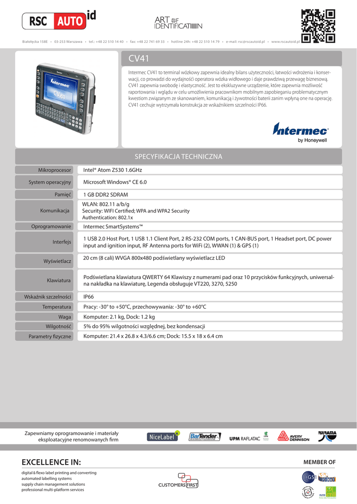 Białołęcka 158E • 03-253 Warszawa • tel.: +48 22 510 14 40 • fax: +48 22 741 69 33 • hotline 24h: +48 22 510 14 79 • e-mail: [email protected] • www.rscautoid.pl CV41 Intermec CV41 to terminal wózkowy zapewnia idealny bilans użyteczności, łatwości wdrożenia i konserwacji, co prowadzi do wydajnośći operatora wózka widłowego i daje prawdziwą przewagę biznesową. CV41 zapewnia swobodę i elastyczność. Jest to ekskluzywne urządzenie, które zapewnia możliwość raportowania i wglądu w celu umożliwienia pracownikom mobilnym zapobieganiu problematycznym kwestiom związanym ze skanowaniem, komunikacją i żywotności baterii zanim wpłyną one na operację. CV41 cechuje wytrzymała konstrukcja ze wskaźnikiem szczelności IP66. SPECYFIKACJA TECHNICZNA Mikroprocesor System operacyjny Pamięć Komunikacja Intel® Atom Z530 1.6GHz Microsoft Windows® CE 6.0 1 GB DDR2 SDRAM WLAN: 802.11 a/b/g Security: WIFI Certified; WPA and WPA2 Security Authentication: 802.1x Oprogramowanie Interfejs Wyświetlacz Klawiatura Wskaźnik szczelności Temperatura Waga Wilgotność Parametry fizyczne Intermec SmartSystems™ 1 USB 2.0 Host Port, 1 USB 1.1 Client Port, 2 RS-232 COM ports, 1 CAN-BUS port, 1 Headset port, DC power input and ignition input, RF Antenna ports for WiFi (2), WWAN (1) & GPS (1) 20 cm (8 cali) WVGA 800x480 podświetlany wyświetlacz LED Podświetlana klawiatura QWERTY 64 Klawiszy z numerami pad oraz 10 przycisków funkcyjnych, uniwersalna nakładka na klawiaturę, Legenda obsługuje VT220, 3270, 5250 IP66 Pracy: -30° to +50°C, przechowywania: -30° to +60°C Komputer: 2.1 kg, Dock: 1.2 kg 5% do 95% wilgotności względnej, bez kondensacji Komputer: 21.4 x 26.8 x 4.3/6.6 cm; Dock: 15.5 x 18 x 6.4 cm Zapewniamy oprogramowanie i materiały eksploatacyjne renomowanych firm EXCELLENCE IN: digital & flexo label printing and converting automated labelling systems supply chain management solutions professional multi-platform services MEMBER OF