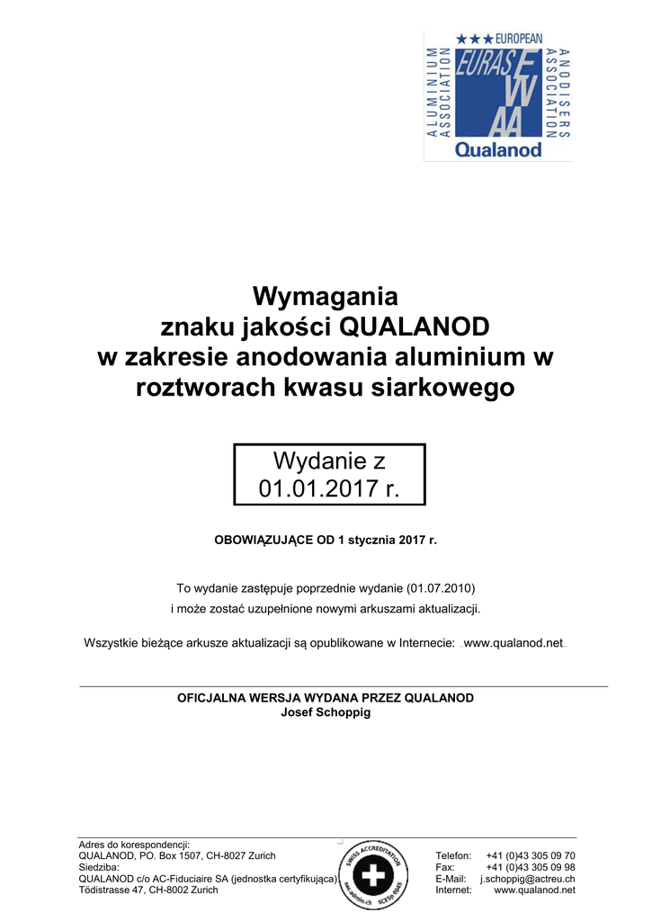 Wymagania znaku jakości QUALANOD w zakresie anodowania aluminium w roztworach kwasu siarkowego Wydanie z 01.01.2017 r. OBOWIĄZUJĄCE OD 1 stycznia 2017 r. To wydanie zastępuje poprzednie wydanie (01.07.2010) i może zostać uzupełnione nowymi arkuszami aktualizacji. Wszystkie bieżące arkusze aktualizacji są opublikowane w Internecie: www.qualanod.net TUTUTUTU UUUUTTTT OFICJALNA WERSJA WYDANA PRZEZ QUALANOD Josef Schoppig Adres do korespondencji: QUALANOD, PO. Box 1507, CH-8027 Zurich Siedziba: QUALANOD c/o AC-Fiduciaire SA (jednostka certyfikująca) Tödistrasse 47, CH-8002 Zurich Telefon: +41 (0)43 305 09 70 Fax: +41 (0)43 305 09 98 E-Mail: [email protected] Internet: www.qualanod.net SPIS TREŚCI SPIS TREŚCI ....................................................................................................................... 2 1 Wprowadzenie .............................................................................................................. 5 2 Zakres ........................................................................................................................... 5 3 Język ............................................................................................................................. 6 4 Odniesienia .................................................................................................................. 6 5 Terminy i definicje ....................................................................................................... 8 6 Udzielanie licencji operatorom zakładów anodujących .......................................... 11 7 8 9 6.1 Informacje ogólne ................................................................................................. 11 6.2 Udzielanie licencji ................................................................................................. 11 6.3 Odnawianie licencji ............................................................................................... 13 6.4 Wycofanie licencji ................................................................................................. 15 6.5 Zmiana produktów podlegających licencjonowaniu objętych licencją .................... 16 Regulamin używania znaku jakości .......................................................................... 16 7.1 Prawo własności znaku jakości ............................................................................. 16 7.2 Rejestr posiadaczy licencji .................................................................................... 16 7.3 Kwalifikacje wnioskodawcy ................................................................................... 16 7.4 Produkty objęte licencją ........................................................................................ 16 7.5 Używanie znaku jakości przez posiadaczy licencji ................................................ 17 7.6 Komunikacja ......................................................................................................... 18 Inspekcje .................................................................................................................... 19 8.1 Informacje ogólne ................................................................................................. 19 8.2 Zakres inspekcji .................................................................................................... 19 8.3 Inspekcja produktów ............................................................................................. 19 8.4 Inspekcja procesów .............................................................................................. 22 Metody badania produktów ....................................................................................... 23 9.1 Informacje ogólne ................................................................................................. 23 9.2 Pomiar grubości .................................................................................................... 23 9.3 Badania uszczelnienia .......................................................................................... 23 9.4 Wygląd.................................................................................................................. 25 9.5 Odporność na korozję ........................................................................................... 25 9.6 Odporność na zużycie / ścieranie ......................................................................... 26 WYMAGANIA QUALANOD -2- Wydanie 01.01.2017 9.7 Mikrotwardość....................................................................................................... 28 9.8 Odporność na pękanie podczas odkształcania ..................................................... 28 9.9 Odporność na światło i promieniowanie ultrafioletowe .......................................... 28 9.10 Napięcie przebicia................................................................................................. 29 9.11 Ciągłość powłoki ................................................................................................... 29 9.12 Gęstość powierzchniowa ...................................................................................... 29 9.13 Odporność na pęknięcia cieplne ........................................................................... 29 9.14 Podsumowanie badań produktów dla różnych rodzajów anodowania ................... 29 10 Zatwierdzanie nowych procesów i produktów ......................................................... 31 11 Wytyczne w zakresie produktów i procesów ........................................................... 32 11.1 Informacje ogólne ................................................................................................. 32 11.2 Aluminium, które ma zostać poddane anodowaniu ............................................... 32 11.3 Grubość anodowej powłoki tlenkowej...........................