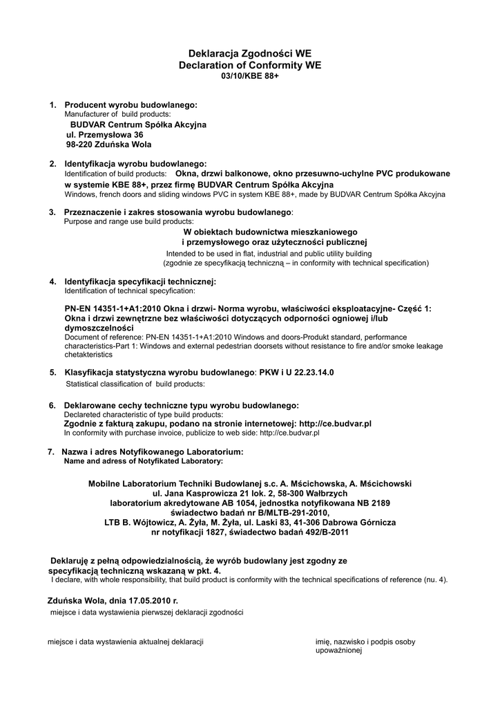 Deklaracja Zgodności WE Declaration of Conformity WE 03/10/KBE 88+ 1. Producent wyrobu budowlanego: Manufacturer of build products: BUDVAR Centrum Spółka Akcyjna ul. Przemysłowa 36 98-220 Zduńska Wola 2. Identyfikacja wyrobu budowlanego: Identification of build products: Okna, drzwi balkonowe, okno przesuwno-uchylne PVC produkowane w systemie KBE 88+, przez firmę BUDVAR Centrum Spółka Akcyjna Windows, french doors and sliding windows PVC in system KBE 88+, made by BUDVAR Centrum Spółka Akcyjna 3. Przeznaczenie i zakres stosowania wyrobu budowlanego: Purpose and range use build products: W obiektach budownictwa mieszkaniowego i przemysłowego oraz uŜyteczności publicznej Intended to be used in flat, industrial and public utility building (zgodnie ze specyfikacją techniczną – in conformity with technical specification) 4. Identyfikacja specyfikacji technicznej: Identification of technical specyfication: PN-EN 14351-1+A1:2010 Okna i drzwi- Norma wyrobu, właściwości eksploatacyjne- Część 1: Okna i drzwi zewnętrzne bez właściwości dotyczących odporności ogniowej i/lub dymoszczelności Document of reference: PN-EN 14351-1+A1:2010 Windows and doors-Produkt standard, performance characteristics-Part 1: Windows and external pedestrian doorsets without resistance to fire and/or smoke leakage chetakteristics 5. Klasyfikacja statystyczna wyrobu budowlanego: PKW i U 22.23.14.0 Statistical classification of build products: 6. Deklarowane cechy techniczne typu wyrobu budowlanego: Declareted characteristic of type build products: Zgodnie z fakturą zakupu, podano na stronie internetowej: http://ce.budvar.pl In conformity with purchase invoice, publicize to web side: http://ce.budvar.pl 7. Nazwa i adres Notyfikowanego Laboratorium: Name and adress of Notyfikated Laboratory: Mobilne Laboratorium Techniki Budowlanej s.c. A. Mścichowska, A. Mścichowski ul. Jana Kasprowicza 21 lok. 2, 58-300 Wałbrzych laboratorium akredytowane AB 1054, jednostka notyfikowana NB 2189 świadectwo badań nr B/MLTB-291-2010, LTB B. Wójtowicz, A. śyła, M. śyła, ul. Laski 83, 41-306 Dabrowa Górnicza nr notyfikacji 1827, świadectwo badań 492/B-2011 Deklaruję z pełną odpowiedzialnością, Ŝe wyrób budowlany jest zgodny ze specyfikacją techniczną wskazaną w pkt. 4. I declare, with whole responsibility, that build product is conformity with the technical specifications of reference (nu. 4). Zduńska Wola, dnia 17.05.2010 r. miejsce i data wystawienia pierwszej deklaracji zgodności miejsce i data wystawienia aktualnej deklaracji imię, nazwisko i podpis osoby upowaŜnionej