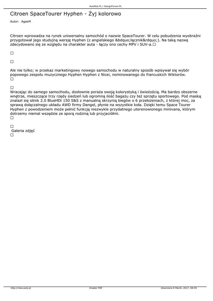 AutoRok.PL / DesignForum.PL Citroen SpaceTourer Hyphen - Żyj kolorowo Autor: AgaeM Citroen wprowadza na rynek uniwersalny samochód o nazwie SpaceTourer. W celu pobudzenia wyobraźni przygotował jego studyjną wersję Hyphen (z angielskiego „łącznik”). Na taką nazwę zdecydowano się ze względu na charakter auta - łączy ono cechy MPV i SUV-a. Ale nie tylko; w przekaz marketingowy nowego samochodu w naturalny sposób wpisywał się wybór popowego zespołu muzycznego Hyphen Hyphen z Nicei, nominowanego do francuskich Wiktorów. Wracając do samego samochodu, dosłownie poraża swoją kolorystyką i świeżością. Ma bardzo obszerne wnętrze, mieszczące trzy rzędy siedzeń lub ogromną ilość bagażu czy też sprzętu sportowego. Pod maską znalazł się silnik 2.0 BlueHDi 150 S&S z manualną skrzynią biegów o 6 przełożeniach, z której moc, za sprawą dołączalnego układu AWD firmy Dangel, płynie na wszystkie koła. Dzięki temu Space Tourer Hyphen z powodzeniem może pełnić funkcję niezwykle przydatnego uterenowionego minivana, którym dotrzemy niemal wszędzie ze sporą rodziną lub przyjaciółmi. Galeria zdjęć http://mas.auto.pl Kreator PDF Utworzono 8 March, 2017, 08:59