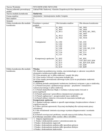Nazwa Wydziału Nazwa jednostki prowadzącej moduł Nazwa modułu kształcenia Forma studiów Rok studiów Semestr Efekty kształcenia dla modułu kształcenia Efekty kształcenia dla modułu kształcenia Treści modułu kształcenia WYCHOWANIE FIZYCZNE Zakład Piłki Siatkowej -Katedra Zespołowych Gier Sportowych Siatkówka stacjonarne / niestacjonarne studia I stopnia 2 3 Przedstaw w postaci Dla kierunku studiów symboli Wiedza K_W01 K_W07 K_W11 Dla obszaru kształcenia K_W15 K_W22 M1_W01 M1_W05 M!_W02, M1_W03, M1_W07 M1_W09 M1_W10 Umiejętności K_U02 K_U04 K_U05 K_U08 K_U11 K_U16 K_U21 M1_U01 M1_U02 M1_U03 M1_U05, M1_U10 M1_U10 M1_U11 M1_U06 Kompetencje społeczne K_K02 K_K11 K_K15 K_K17 K_K18 M1_K01 S1P_K07,S1P_K04 M1_K07,S1P_K04 M1_K08 M1_K09 Wiedza WI. Student ma podstawową wiedzę, zna terminologię w zakresie wszystkich elementów technicznych piłki siatkowej, W.2.Zna przepisy gry w piłkę siatkową i zasady fair play W.3.Zna zestaw ćwiczeń w nauczaniu techniki gry. W.4.Zna zasady prowadzenia zdrowego trybu życia na przykładzie siatkówki Umiejętności U1.Student posiada umiejętności techniczne (ruchowe) związane z grą w siatkówkę U.2.Potrafi korzystać z podstawowego sprzętu – przyborów i trenażerów wykorzystywanego w piłce siatkowej U.3.Potrafi identyfikować błędy w technice wykonywania ćwiczeń w poszczególnych U.4.Potrafi sędziować i prawidłowa interpretować przepisy gry U.5.Potrafi zaplanować i przeprowadzić mecz siatkówki U.6.Potrafi dobrać właściwe ćwiczenia do nauczania techniki gry Kompetencje społeczne K.1.Student realizuje zadania w sposób zapewniający bezpieczeństwo własne i współćwiczących. K.2.Dba o poziom sprawności fizycznej niezbędnej dla wykonywania pracy zawodowej. K.3.Ma świadomość istnienia etycznego wymiaru diagnozowania i oceniania uczniów K.4.Potrafi rozwiązywać problemy zawodu nauczyciela kultury fizycznej. K.4.Okazuje szacunek wobec ucznia i dba o ich dobro 1. Zajęcia organizacyjne 2. Nauka i doskonalenie postaw i przemieszczania się 3.Nauka i doskonalenie zagrywek 4.Nauka i doskonalenie podania piłki sposobem górnym 5.Nauka i doskonalenie podania piłki sposobem dolnym 6.Nauka i doskonalenie atakowania Stosowane metody dydaktyczne Metody sprawdzania i kryteria oceny efektów kształcenia uzyskanych przez studentów Forma i warunki zaliczenia modułu, w tym zasady dopuszczenia do egzaminu, zaliczenia, a także forma i warunki zaliczenia poszczególnych zajęć wchodzących w zakres danego modułu Typ modułu kształcenia (obowiązkowy/fakultatywny) Język kształcenia Sposób realizacji Wymagania wstępne i dodatkowe Rodzaj i liczba godzin zajęć dydaktycznych wymagających bezpośredniego udziału nauczyciela akademickiego i studentów, gdy w danym module przewidziane są takie zajęcia 7.Nauka i doskonalenie gry w obronie 8.Gra szkolna małe gry gra właściwe 9.Sprawdzian umiejętności technicznych 10.Sprawdzian z przepisów gry 11.Sprawdzian teoretyczny i zaliczenie przedmiotu Metody ; analityczne, syntetyczna, ścisła, Aktywizujące: gry małe, szkolne, właściwe , twórcze rozwiązywanie problemów Metody; Sprawdzian umiejętności podstawowych elementów technicznych, Test z przepisów gry Sprawdzian pisemny z techniki gry Na zajęciach posługujemy się punktowa oceną efektów np. uzyskanie 60 pkt. Daje ocenę dost. na którą składają się poniższe efekty Kryteria oceny efektów kształcenia na ocenę dst: ma elementarną wiedzę o technice gry zna podstawowe przepisy gry. potrafi posługiwać się niektórymi podstawowymi przyborami stara się przejawiać aktywność na zajęciach. ma podstawowe poczucie odpowiedzialności i etyki Warunkiem zaliczenia przedmiotu jest wykazanie się znajomością wszystkich zagadnień teoretycznych i umiejętność ich praktycznej interpretacji. Nauczania technik ruchowych i przekazywania wiadomości). Zaliczenie teoretyczne przedmiotu w formie opisowej. Zaliczenie umiejętności praktycznych. Ocena bardzo dobra: student posiada pogłębioną wiedzę wymienioną w efektach kształcenia, wykazał się dużym zaangażowaniem na ćwiczeniach. Ocena dobra: student opanował wszystkie zagadnienia teoretyczne, jednak ma pewne trudności z ich praktyczną interpretacją, uczęszczał na ćwiczenia wykazując w nich średnie zaangażowanie. Ocena dostateczna: student opanował wiadomości i umiejętności w stopniu podstawowym, jednak posiada znaczne braki w ich pogłębionej i praktycznej interpretacji, w zajęciach wykazał się małym zaangażowaniem - obowiązkowy polski Bezpośrednio - zajęcia wymagające udziału nauczyciela akademickiego i studentów. Pośrednie - przygotowanie do zajęć do części teoretycznej, podniesienie poziomu własnych umiejętności i wiadomości do potrzeb zaliczenia przedmiotu. brak Stacjonarne Ćwiczenia: 26 Praca studenta; Przygotowanie do zajęć 6godz. Studiowanie przepisów gry 6godz. Studiowanie literatury 14 godz. Łącznie 52 godz. Niestacjonarne Ćwiczenia 13 godz. Praca studenta; Przygotowanie do zajęć 12godz. Studiowanie przepisów gry 7godz. Studiowanie literatury 10 godz. Doskonalenie techniki gry 20 Łącznie: 52 Liczba punktów ECTS przypisana modułowi Bilans punktów ECTS Wykaz literatury podstawowej i uzupełniającej, obowiązującej do zaliczenia danego modułu Wymiar, zasady i forma odbywania praktyk, w przypadku, gdy program kształcenia przewiduje praktyki 2 Stacjonarne udział w ćwiczeniach – 26 godzin przygotowanie do ćwiczeń – 7 godzin studiowanie literatury – 7 godzin przygotowanie do testu z przepisów – 12 godzin Sumaryczne obciążenie pracą studenta=52 godziny Punkty ECTS 2. Niestacjonarne udział w ćwiczeniach – 13 godzin przygotowanie do ćwiczeń –19 godzin studiowanie literatury – 8 godzin przygotowanie do testu z przepisów – 12 godzin Sumaryczne obciążenie pracą studenta=52 godziny Punkty ECTS 2. 1.Grządziel G., Szade D., B. Nowak . 2012 Piłka siatkowa 