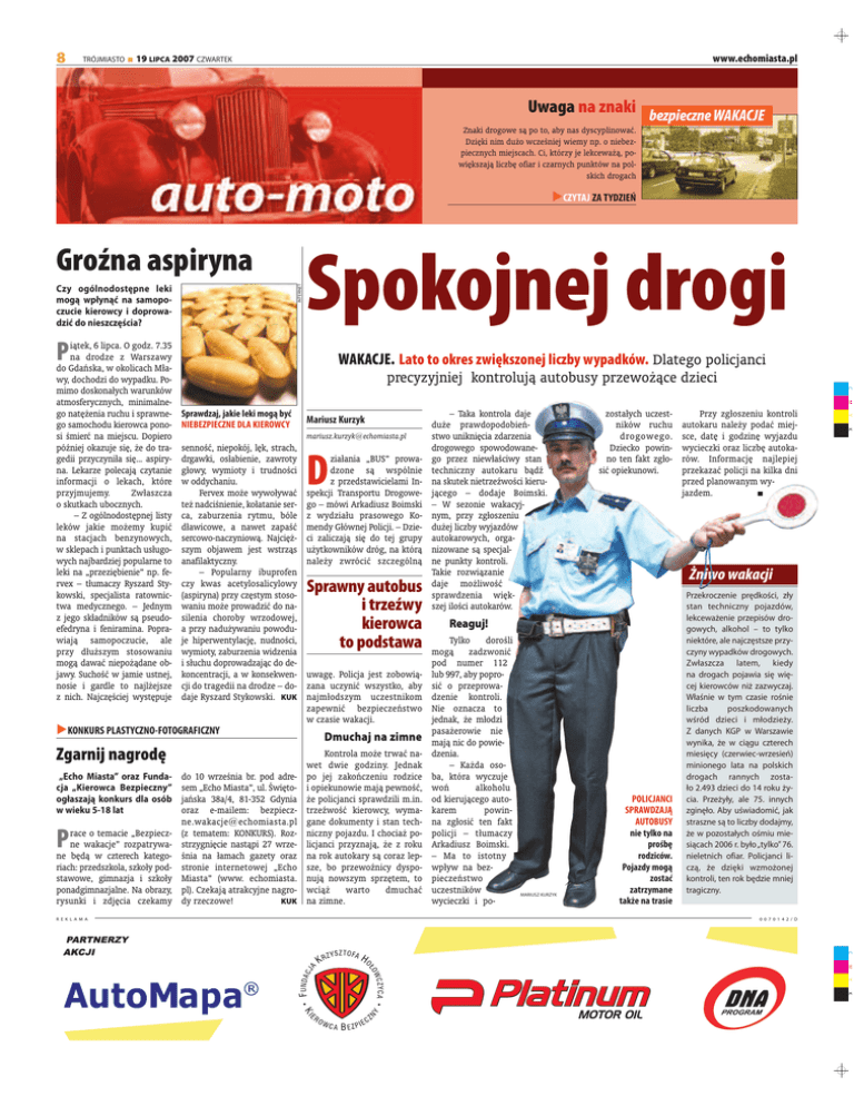 8 TRÓJMIASTO www.echomiasta.pl 19 LIPCA 2007 CZWARTEK Uwaga na znaki bezpieczne WAKACJE Znaki drogowe są po to, aby nas dyscyplinować. Dzięki nim dużo wcześniej wiemy np. o niebezpiecznych miejscach. Ci, którzy je lekceważą, powiększają liczbę ofiar i czarnych punktów na polskich drogach CZYTAJ ZA TYDZIEŃ INTERNET Groźna aspiryna Czy ogólnodostępne leki mogą wpłynąć na samopoczucie kierowcy i doprowadzić do nieszczęścia? Spokojnej drogi P WAKACJE. Lato to okres zwiększonej liczby wypadków. Dlatego policjanci precyzyjniej kontrolują autobusy przewożące dzieci C M [email protected] senność, niepokój, lęk, strach, drgawki, osłabienie, zawroty głowy, wymioty i trudności w oddychaniu. Fervex może wywoływać też nadciśnienie, kołatanie serca, zaburzenia rytmu, bóle dławicowe, a nawet zapaść sercowo-naczyniową. Najcięższym objawem jest wstrząs anafilaktyczny. – Popularny ibuprofen czy kwas acetylosalicylowy (aspiryna) przy częstym stosowaniu może prowadzić do nasilenia choroby wrzodowej, a przy nadużywaniu powoduje hiperwentylację, nudności, wymioty, zaburzenia widzenia i słuchu doprowadzając do dekoncentracji, a w konsekwencji do tragedii na drodze – dodaje Ryszard Stykowski. KUK KONKURS PLASTYCZNO-FOTOGRAFICZNY Zgarnij nagrodę „Echo Miasta” oraz Fundacja „Kierowca Bezpieczny” ogłaszają konkurs dla osób w wieku 5-18 lat P race o temacie „Bezpieczne wakacje” rozpatrywane będą w czterech kategoriach: przedszkola, szkoły podstawowe, gimnazja i szkoły ponadgimnazjalne. Na obrazy, rysunki i zdjęcia czekamy R E K L A M A Mariusz Kurzyk do 10 września br. pod adresem „Echo Miasta”, ul. Świętojańska 38a/4, 81-352 Gdynia oraz e-mailem: [email protected] (z tematem: KONKURS). Rozstrzygnięcie nastąpi 27 września na łamach gazety oraz stronie internetowej „Echo Miasta” (www. echomiasta. pl). Czekają atrakcyjne nagrody rzeczowe! KUK D ziałania „BUS” prowadzone są wspólnie z przedstawicielami Inspekcji Transportu Drogowego – mówi Arkadiusz Boimski z wydziału prasowego Komendy Głównej Policji. – Dzieci zaliczają się do tej grupy użytkowników dróg, na którą należy zwrócić szczególną Sprawny autobus i trzeźwy kierowca to podstawa uwagę. Policja jest zobowiązana uczynić wszystko, aby najmłodszym uczestnikom zapewnić bezpieczeństwo w czasie wakacji. Dmuchaj na zimne Kontrola może trwać nawet dwie godziny. Jednak po jej zakończeniu rodzice i opiekunowie mają pewność, że policjanci sprawdzili m.in. trzeźwość kierowcy, wymagane dokumenty i stan techniczny pojazdu. I chociaż policjanci przyznają, że z roku na rok autokary są coraz lepsze, bo przewoźnicy dysponują nowszym sprzętem, to wciąż warto dmuchać na zimne. – Taka kontrola daje duże prawdopodobieństwo uniknięcia zdarzenia drogowego spowodowanego przez niewłaściwy stan techniczny autokaru bądź na skutek nietrzeźwości kierującego – dodaje Boimski. – W sezonie wakacyjnym, przy zgłoszeniu dużej liczby wyjazdów autokarowych, organizowane są specjalne punkty kontroli. Takie rozwiązanie daje możliwość sprawdzenia większej ilości autokarów. zostałych uczestników ruchu drogowego. Dziecko powinno ten fakt zgłosić opiekunowi. Żniwo wakacji Reaguj! dorośli Tylko mogą zadzwonić pod numer 112 lub 997, aby poprosić o przeprowadzenie kontroli. Nie oznacza to jednak, że młodzi pasażerowie nie mają nic do powiedzenia. – Każda osoba, która wyczuje woń alkoholu od kierującego autokarem powinna zgłosić ten fakt policji – tłumaczy Arkadiusz Boimski. – Ma to istotny wpływ na bezpieczeństwo uczestników wycieczki i po- MARIUSZ KURZYK Przy zgłoszeniu kontroli autokaru należy podać miejsce, datę i godzinę wyjazdu wycieczki oraz liczbę autokarów. Informację najlepiej przekazać policji na kilka dni przed planowanym wyjazdem. K Sprawdzaj, jakie leki mogą być NIEBEZPIECZNE DLA KIEROWCY Y iątek, 6 lipca. O godz. 7.35 na drodze z Warszawy do Gdańska, w okolicach Mławy, dochodzi do wypadku. Pomimo doskonałych warunków atmosferycznych, minimalnego natężenia ruchu i sprawnego samochodu kierowca ponosi śmierć na miejscu. Dopiero później okazuje się, że do tragedii przyczyniła się... aspiryna. Lekarze polecają czytanie informacji o lekach, które przyjmujemy. Zwłaszcza o skutkach ubocznych. – Z ogólnodostępnej listy leków jakie możemy kupić na stacjach benzynowych, w sklepach i punktach usługowych najbardziej popularne to leki na „przeziębienie” np. fervex – tłumaczy Ryszard Stykowski, specjalista ratownictwa medycznego. – Jednym z jego składników są pseudoefedryna i feniramina. Poprawiają samopoczucie, ale przy dłuższym stosowaniu mogą dawać niepożądane objawy. Suchość w jamie ustnej, nosie i gardle to najlżejsze z nich. Najczęściej występuje POLICJANCI SPRAWDZAJĄ AUTOBUSY nie tylko na prośbę rodziców. Pojazdy mogą zostać zatrzymane także na trasie Przekroczenie prędkości, zły stan techniczny pojazdów, lekceważenie przepisów drogowych, alkohol – to tylko niektóre, ale najczęstsze przyczyny wypadków drogowych. Zwłaszcza latem, kiedy na drogach pojawia się więcej kierowców niż zazwyczaj. Właśnie w tym czasie rośnie liczba poszkodowanych wśród dzieci i młodzieży. Z danych KGP w Warszawie wynika, że w ciągu czterech miesięcy (czerwiec-wrzesień) minionego lata na polskich drogach rannych zostało 2.493 dzieci do 14 roku życia. Przeżyły, ale 75. innych zginęło. Aby uświadomić, jak straszne są to liczby dodajmy, że w pozostałych ośmiu miesiącach 2006 r. było „tylko” 76. nieletnich ofiar. Policjanci liczą, że dzięki wzmożonej kontroli, ten rok będzie mniej tragiczny. 0 0 7 0 1 4 2 / D C M Y K