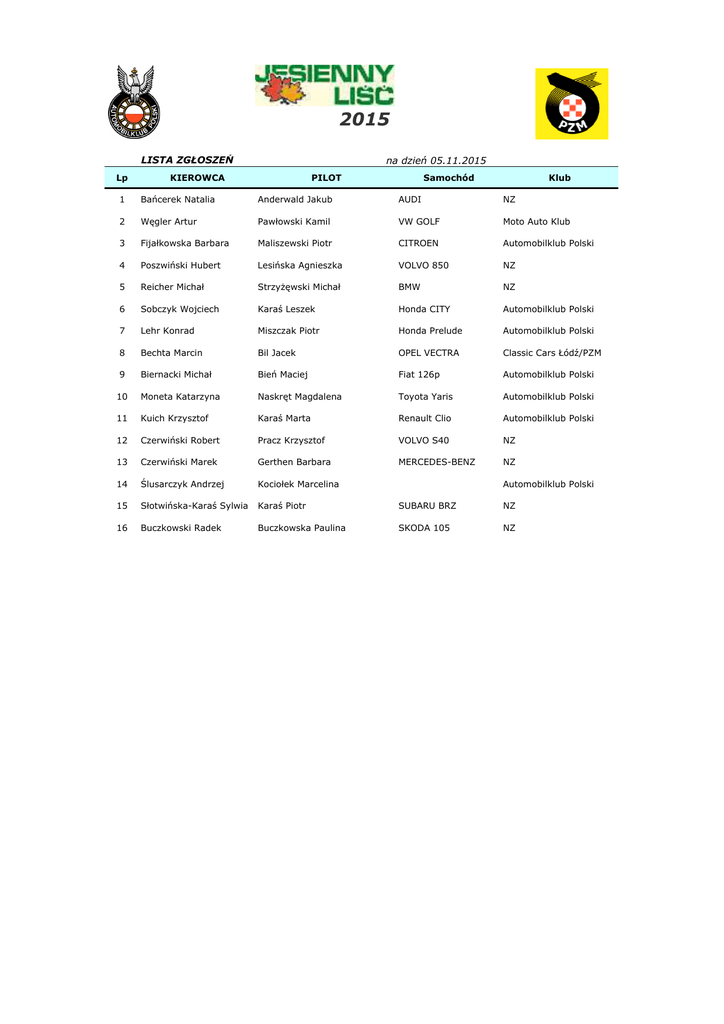 2015 LISTA ZGŁOSZEŃ Lp na dzień 05.11.2015 KIEROWCA PILOT Samochód Klub 1 Bańcerek Natalia Anderwald Jakub AUDI NZ 2 Węgler Artur Pawłowski Kamil VW GOLF Moto Auto Klub 3 Fijałkowska Barbara Maliszewski Piotr CITROEN Automobilklub Polski 4 Poszwiński Hubert Lesińska Agnieszka VOLVO 850 NZ 5 Reicher Michał StrzyŜęwski Michał BMW NZ 6 Sobczyk Wojciech Karaś Leszek Honda CITY Automobilklub Polski 7 Lehr Konrad Miszczak Piotr Honda Prelude Automobilklub Polski 8 Bechta Marcin Bil Jacek OPEL VECTRA Classic Cars Łódź/PZM 9 Biernacki Michał Bień Maciej Fiat 126p Automobilklub Polski 10 Moneta Katarzyna Naskręt Magdalena Toyota Yaris Automobilklub Polski 11 Kuich Krzysztof Karaś Marta Renault Clio Automobilklub Polski 12 Czerwiński Robert Pracz Krzysztof VOLVO S40 NZ 13 Czerwiński Marek Gerthen Barbara MERCEDES-BENZ NZ 14 Ślusarczyk Andrzej Kociołek Marcelina 15 Słotwińska-Karaś Sylwia Karaś Piotr SUBARU BRZ NZ 16 Buczkowski Radek Buczkowska Paulina SKODA 105 NZ Automobilklub Polski