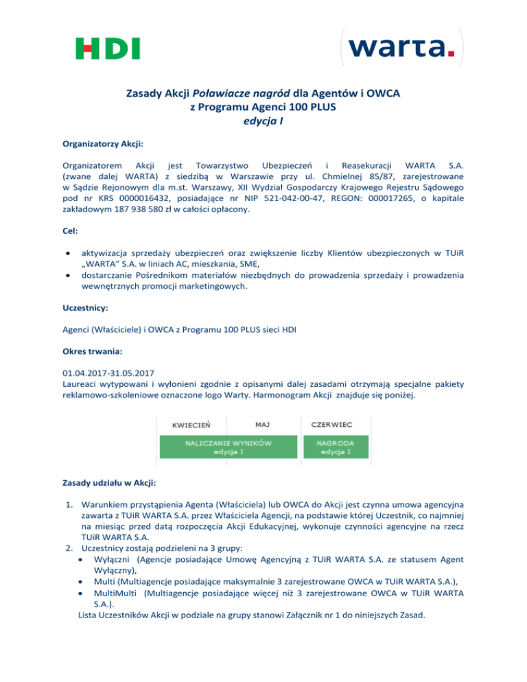 Zasady Akcji Poławiacze nagród dla Agentów i OWCA z Programu Agenci 100 PLUS edycja I Organizatorzy Akcji: Organizatorem Akcji jest Towarzystwo Ubezpieczeń i Reasekuracji WARTA S.A. (zwane dalej WARTA) z siedzibą w Warszawie przy ul. Chmielnej 85/87, zarejestrowane w Sądzie Rejonowym dla m.st. Warszawy, XII Wydział Gospodarczy Krajowego Rejestru Sądowego pod nr KRS 0000016432, posiadające nr NIP 521-042-00-47, REGON: 000017265, o kapitale zakładowym 187 938 580 zł w całości opłacony. Cel: aktywizacja sprzedaży ubezpieczeń oraz zwiększenie liczby Klientów ubezpieczonych w TUiR „WARTA” S.A. w liniach AC, mieszkania, SME, dostarczanie Pośrednikom materiałów niezbędnych do prowadzenia sprzedaży i prowadzenia wewnętrznych promocji marketingowych. Uczestnicy: Agenci (Właściciele) i OWCA z Programu 100 PLUS sieci HDI Okres trwania: 01.04.2017-31.05.2017 Laureaci wytypowani i wyłonieni zgodnie z opisanymi dalej zasadami otrzymają specjalne pakiety reklamowo-szkoleniowe oznaczone logo Warty. Harmonogram Akcji znajduje się poniżej. Zasady udziału w Akcji: 1. Warunkiem przystąpienia Agenta (Właściciela) lub OWCA do Akcji jest czynna umowa agencyjna zawarta z TUiR WARTA S.A. przez Właściciela Agencji, na podstawie której Uczestnik, co najmniej na miesiąc przed datą rozpoczęcia Akcji Edukacyjnej, wykonuje czynności agencyjne na rzecz TUiR WARTA S.A. 2. Uczestnicy zostają podzieleni na 3 grupy: Wyłączni (Agencje posiadające Umowę Agencyjną z TUiR WARTA S.A. ze statusem Agent Wyłączny), Multi (Multiagencje posiadające maksymalnie 3 zarejestrowane OWCA w TUiR WARTA S.A.), MultiMulti (Multiagencje posiadające więcej niż 3 zarejestrowane OWCA w TUiR WARTA S.A.). Lista Uczestników Akcji w podziale na grupy stanowi Załącznik nr 1 do niniejszych Zasad. 3. Zasady wyłaniania Laureatów Akcji: pakiety będzie mogło otrzymać 90 Laureatów (po 30 z każdej grupy), którzy osiągną najlepszy wynik pod względem nadwyżki przypisu księgowego w liniach AC, mieszkania, SME w stosunku do tego samego okresu roku 2016 w okresie naliczania wyników (01.04.2017-31.05.2017). Na podstawie wyników sprzedażowych utworzony zostanie Ranking Laureatów. 4. W przypadku gdy Laureat zrezygnuje z pakietu (informacja przesłana drogą elektroniczną przez odpowiedniego Regionalnego Menadżera Sprzedaży w ciągu 7 dni od ogłoszenia Laureatów), jego miejsce zajmuje kolejny Laureat z Rankingu w danej grupie. 5. Ogłoszenie Laureatów, którzy zostaną wytypowani do wysyłki pakietów nastąpi do dnia 25.06.2017 drogą elektroniczną. 6. TUiR Warta S.A. jako administrator danych osobowych informuje, że będą one przetwarzane w zakresie i celu niezbędnym do realizacji Akcji Edukacyjnej. Podanie danych (tj. uczestnictwo w Akcji) jest dobrowolne. Uczestnikowi Akcji przysługuje prawo dostępu do treści danych oraz prawo ich poprawiania.